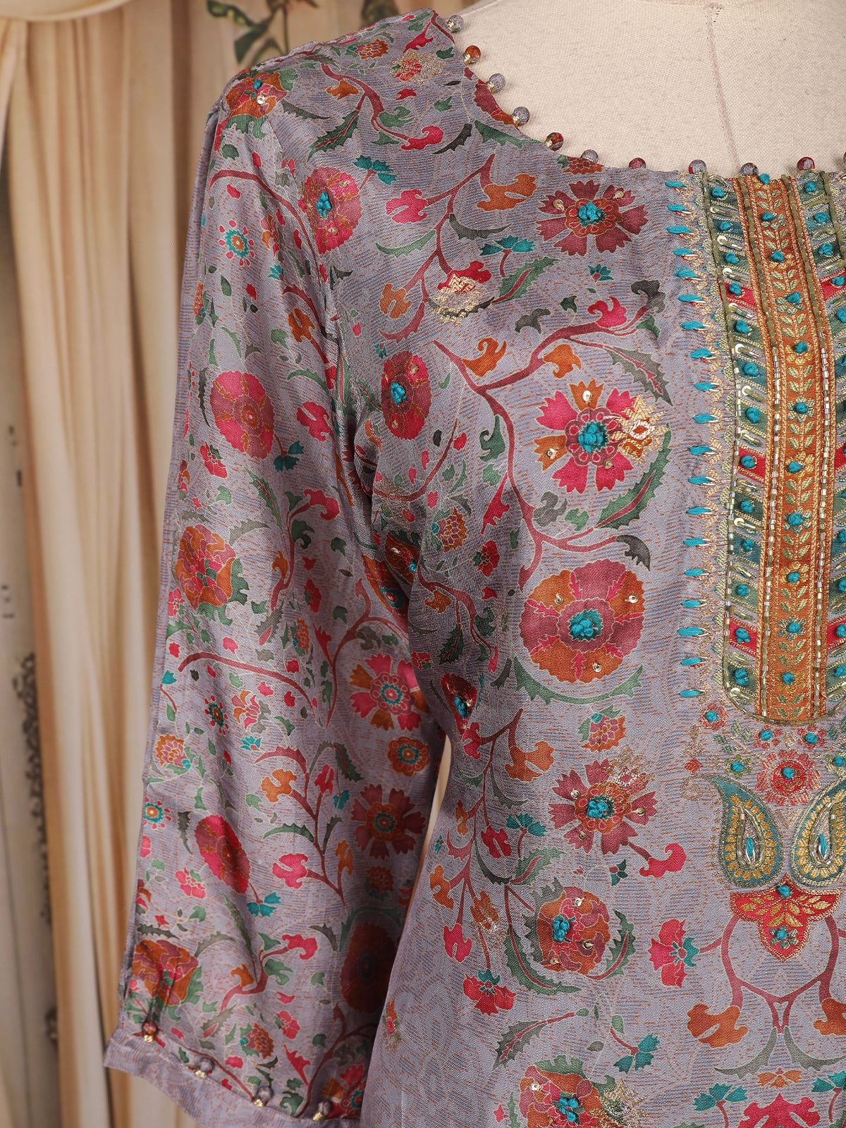 Step into effortless elegance with this Lavender Thread Embroidered Crepe Straight Cut Salwar Suit, designed to bring charm and comfort together in a graceful ethnic look. The kurta features multicolor thread embroidery along the neckline and sleeves, forming delicate floral and traditional motifs that stand out beautifully against the soft lavender base.