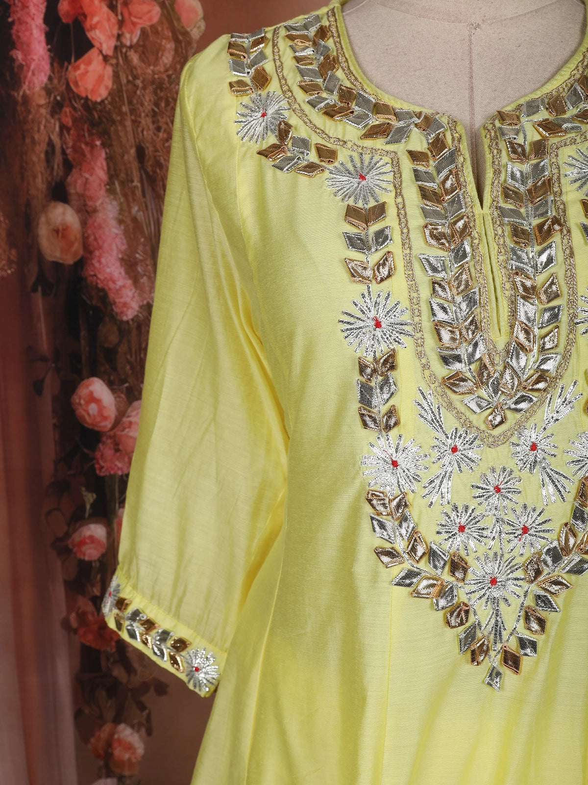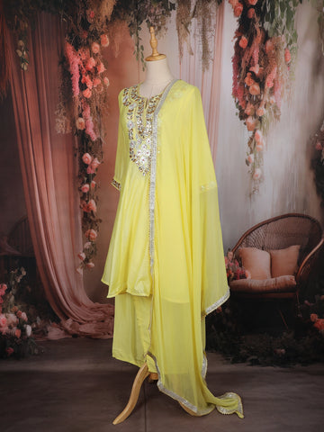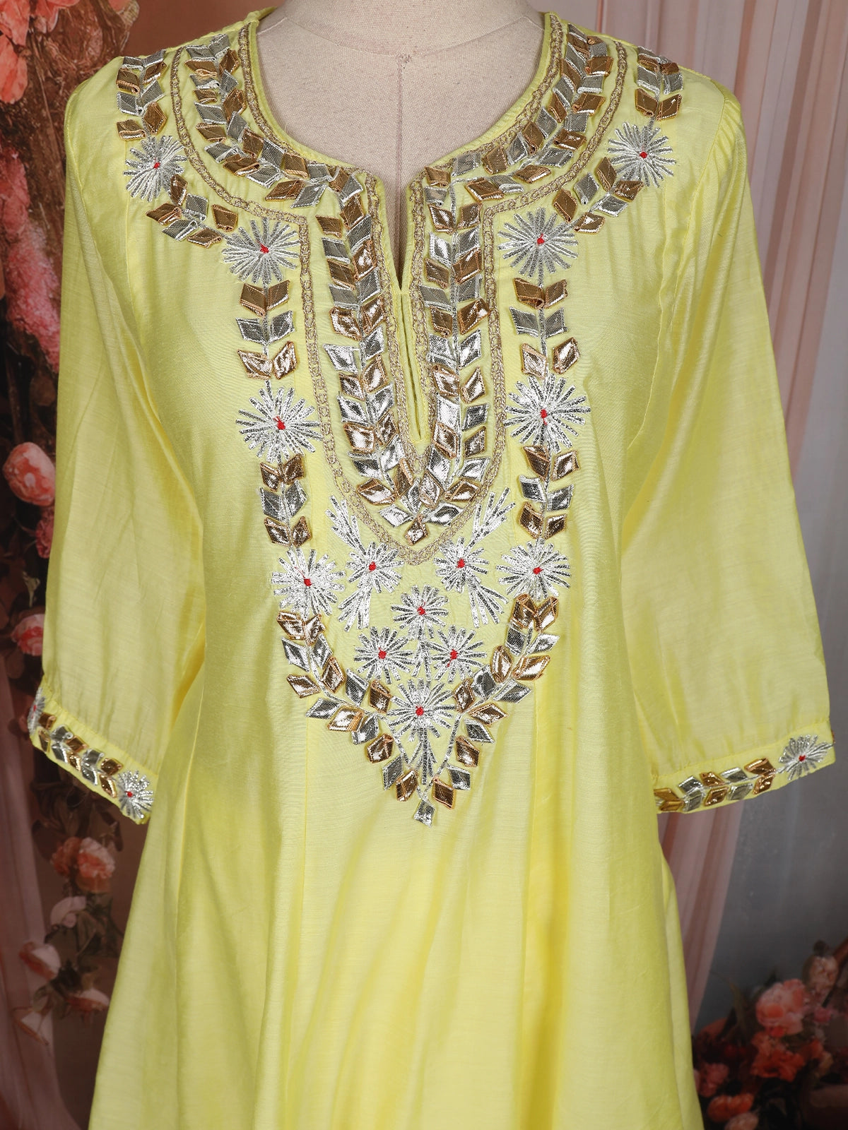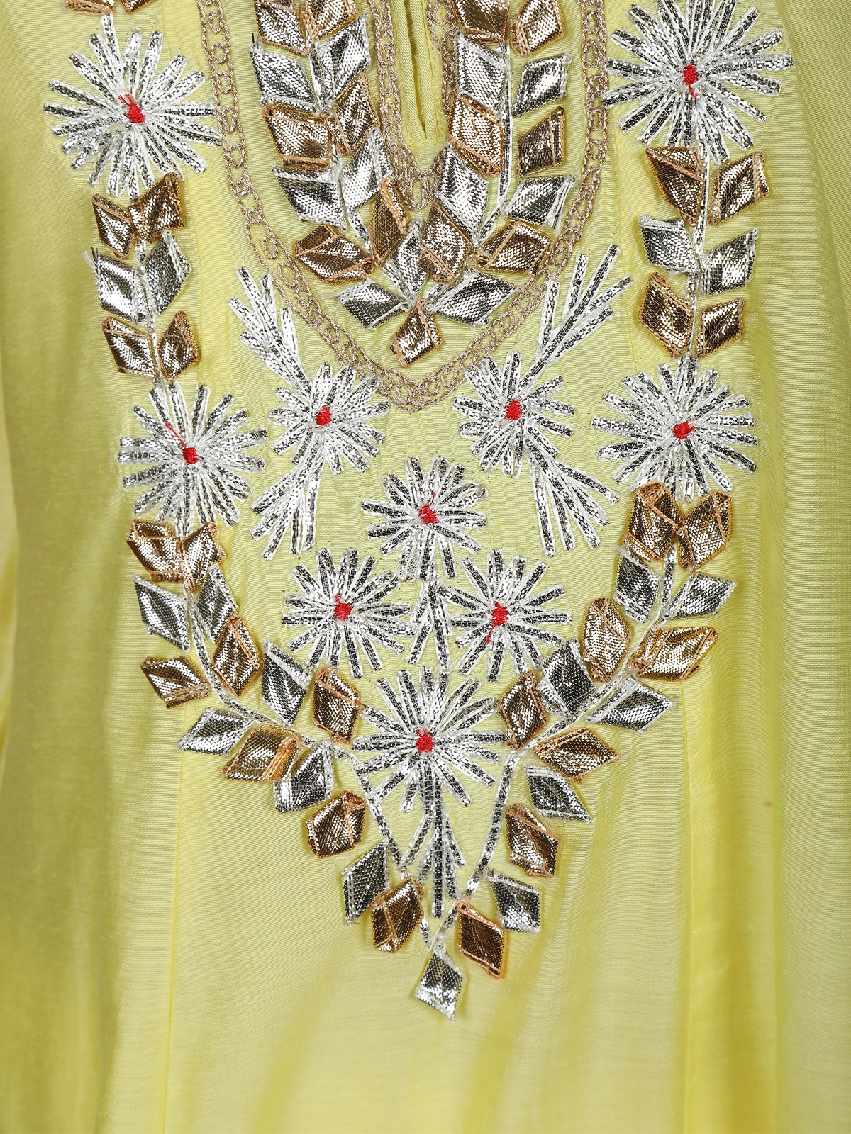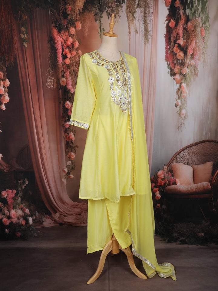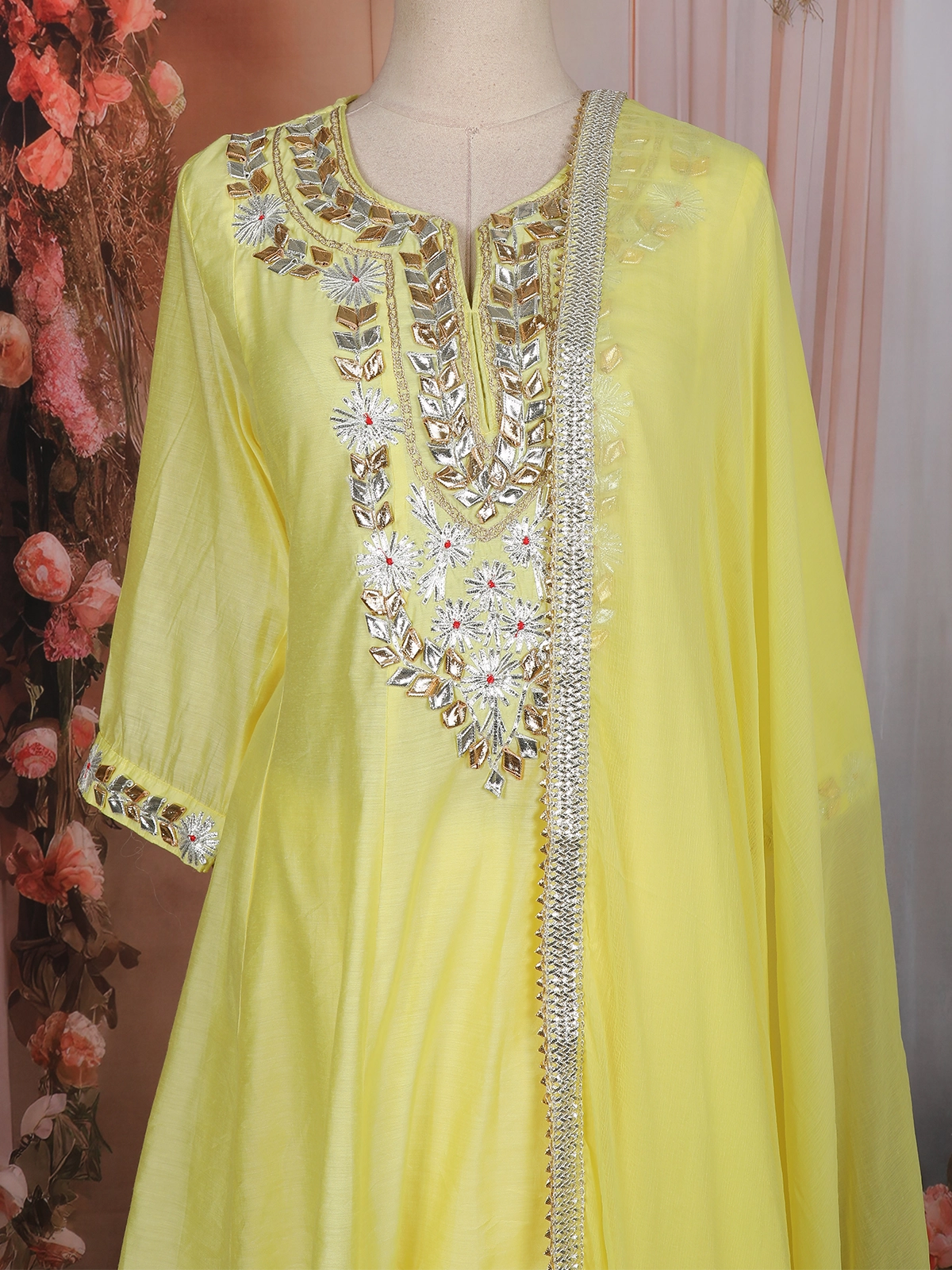 Brighten up your wardrobe with this refreshing lemon yellow cotton salwar suit, designed with a blend of comfort and festive grace. The kurta features intricate floral embroidery and mirror-enhanced detailing along the neckline and yoke, adding a sparkling charm to the ensemble. The breathable cotton fabric and flared silhouette make it perfect for day celebrations, haldi events, or casual festive gatherings. The matching bottom and airy net dupatta with a shimmering border complete the look with elegance.