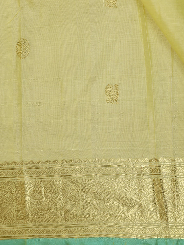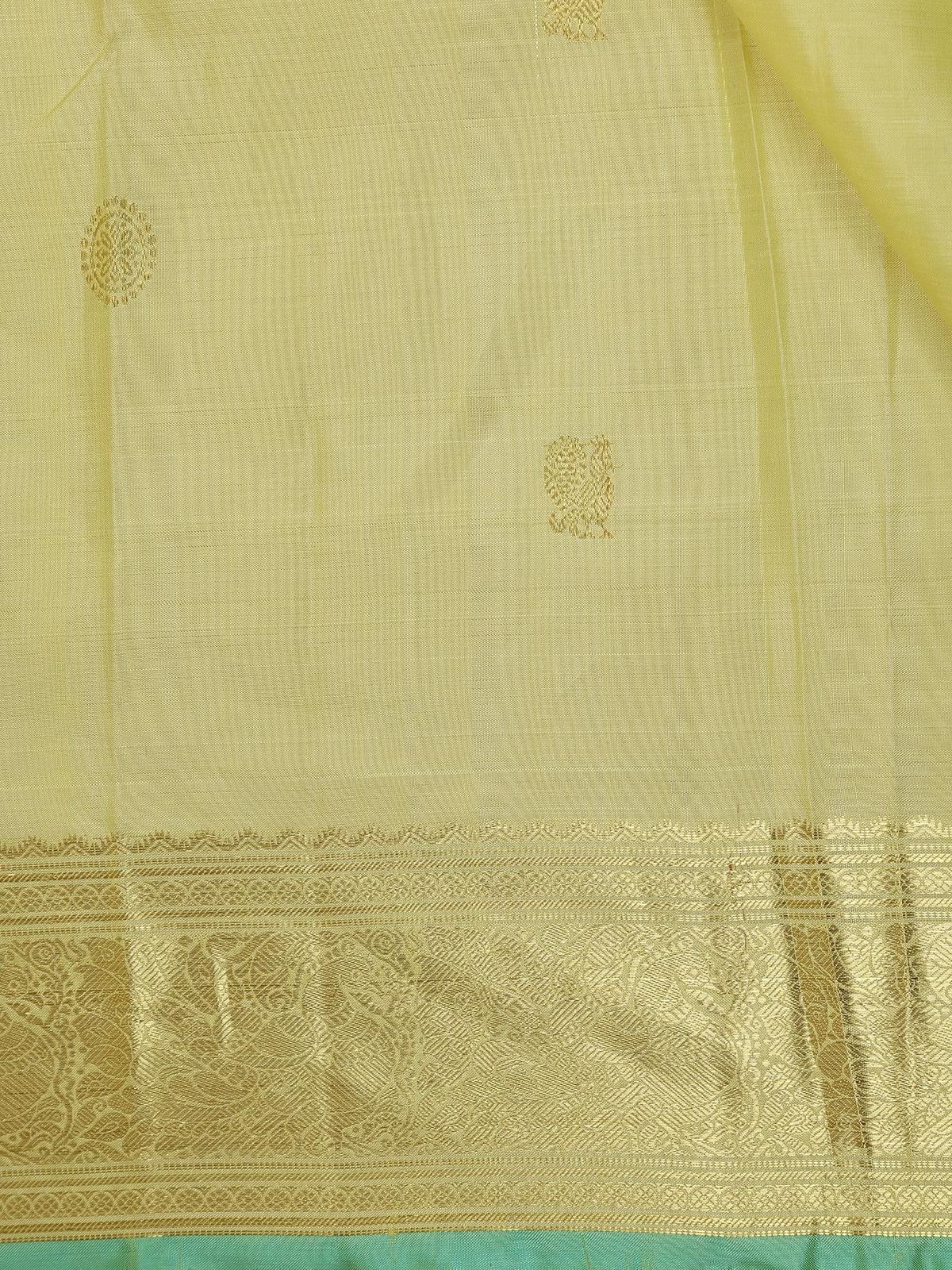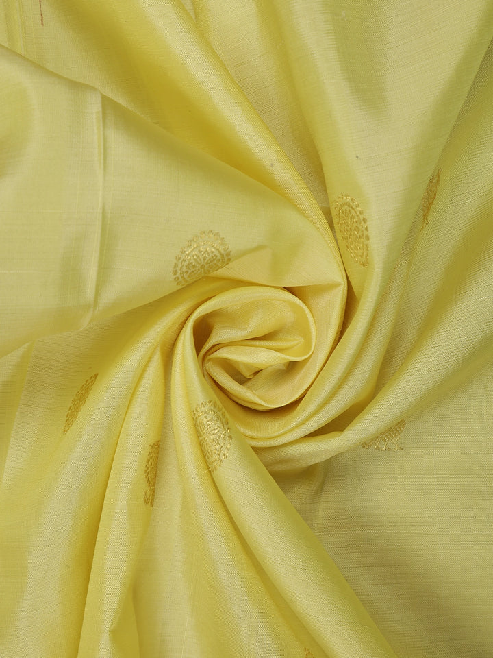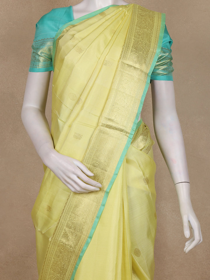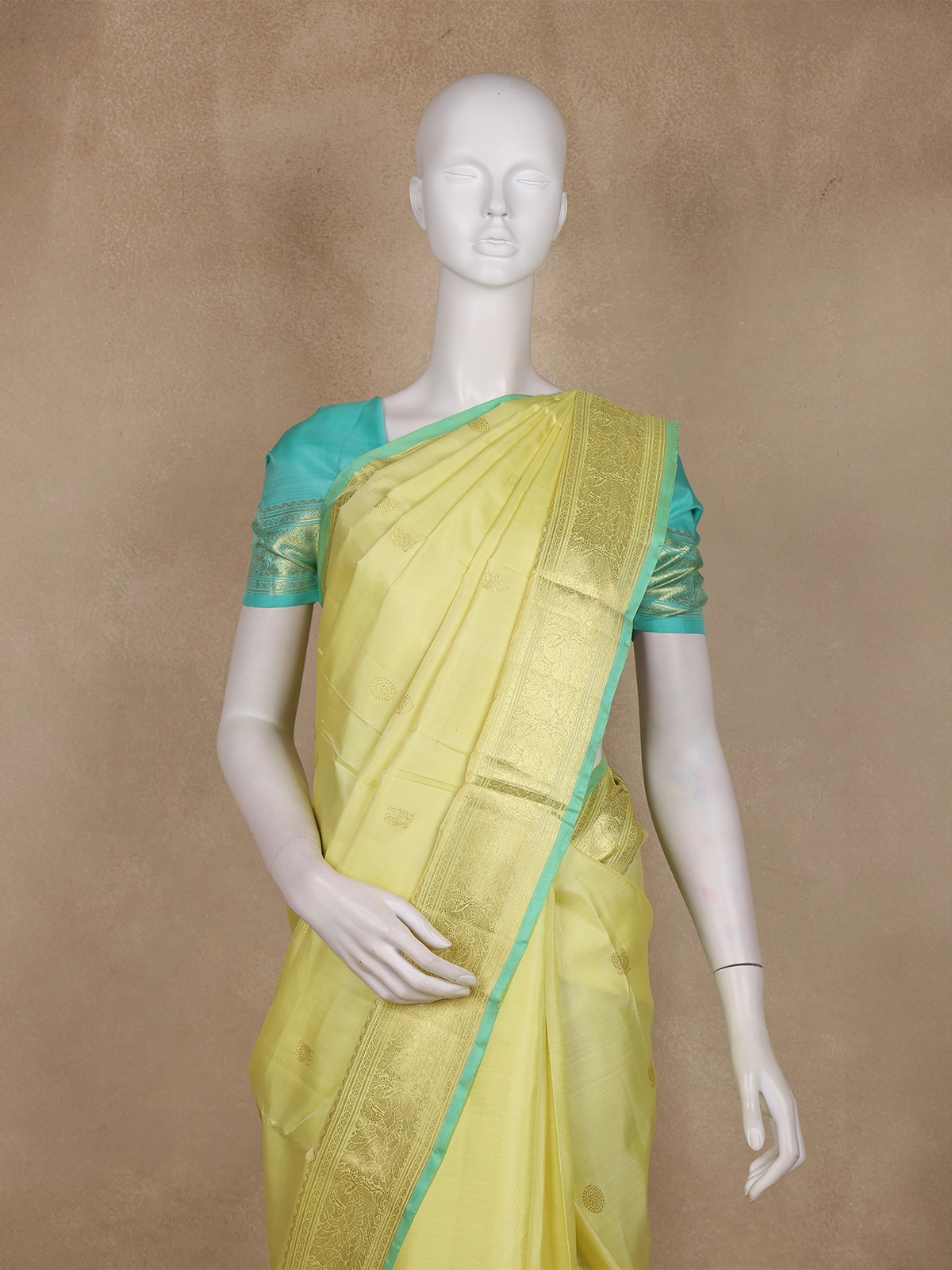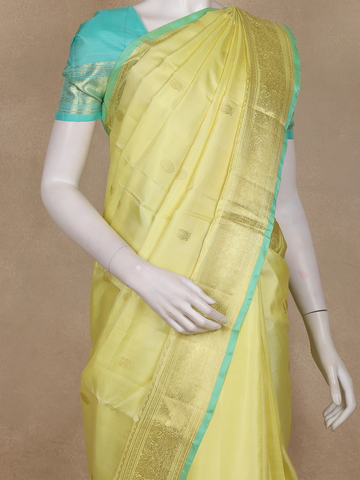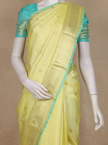 Bring a refreshing festive charm to your wardrobe with this Lemon Yellow Zari Butta Woven Design Semi Banarasi Saree with Contrast Border. The soft and luminous fabric showcases a beautiful pastel yellow shade that radiates elegance and positivity. Adorned with delicate zari butta motifs, the saree adds a subtle traditional character while maintaining a light and graceful look. The highlight of the drape is the contrast turquoise and gold zari woven border, which enhances the overall appeal with a vibrant color play and regal finish. Lightweight, smooth, and easy to drape, it is an ideal pick for festive celebrations, rituals, and cultural functions. Pair it with matching gold accessories or turquoise accents for a stunning and sophisticated ethnic ensemble.