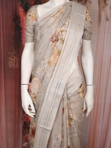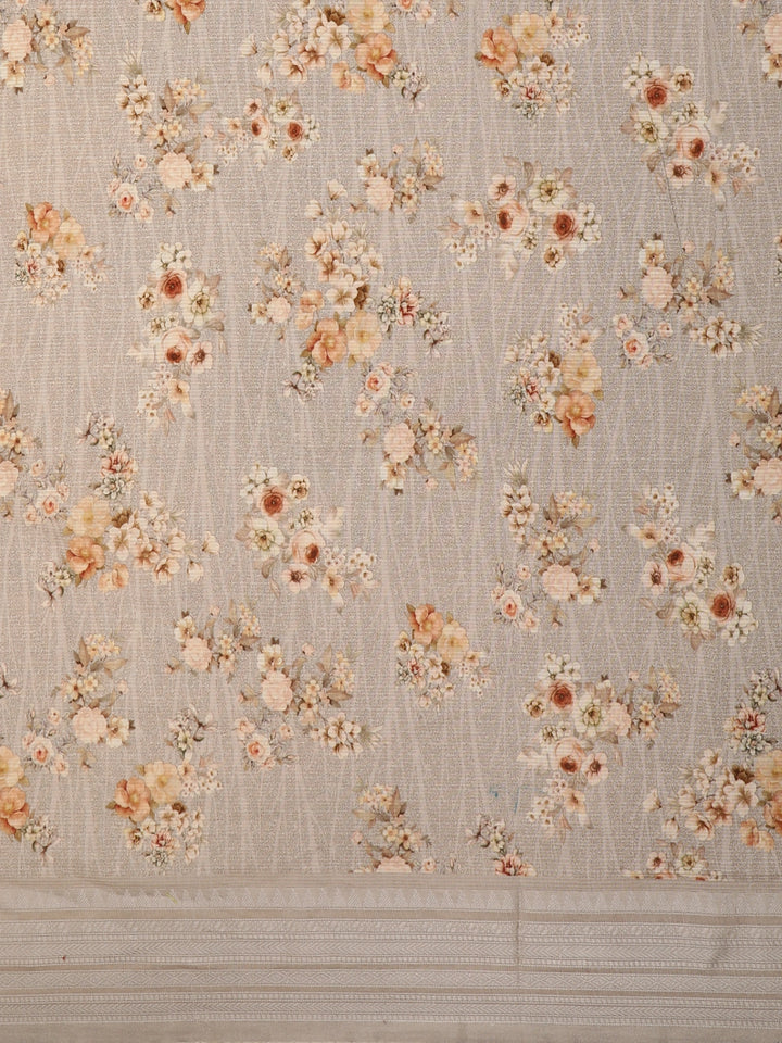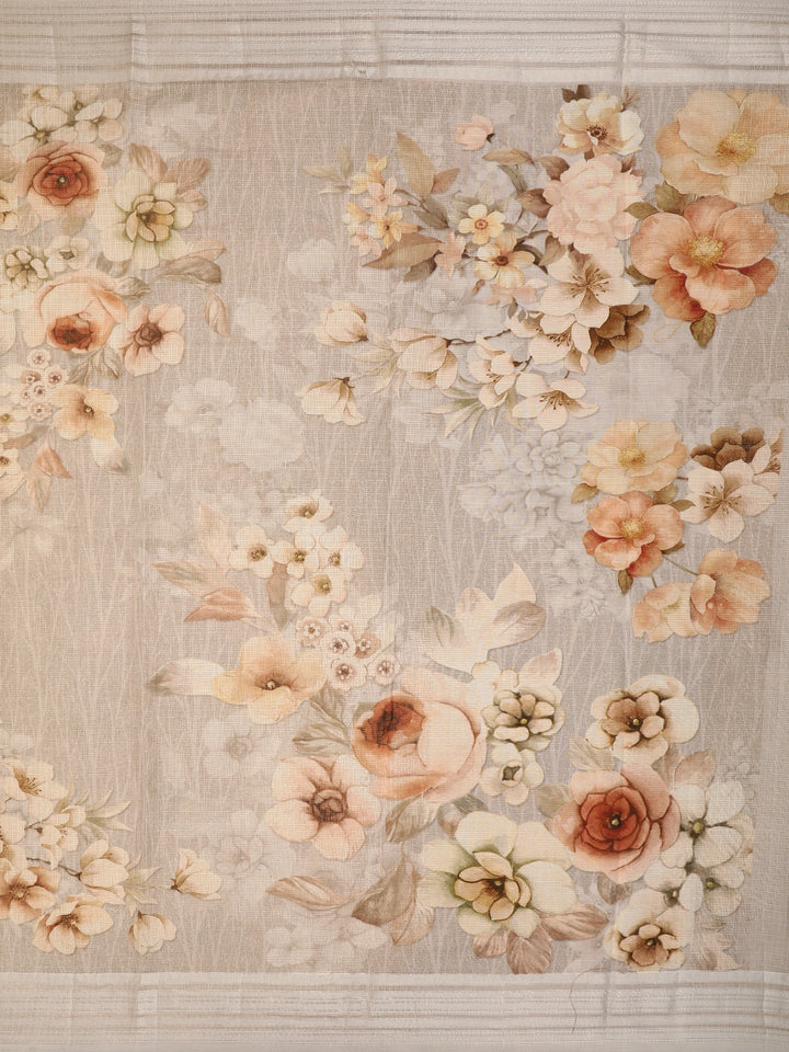 Light Beige Floral Printed Kota Cotton Saree with Woven Border
