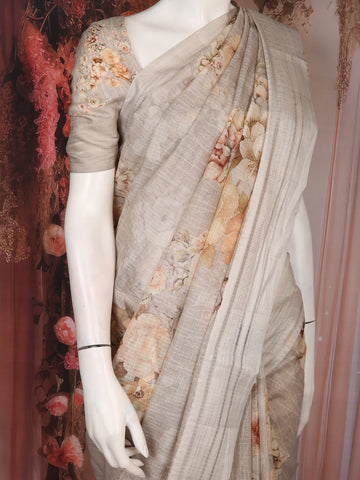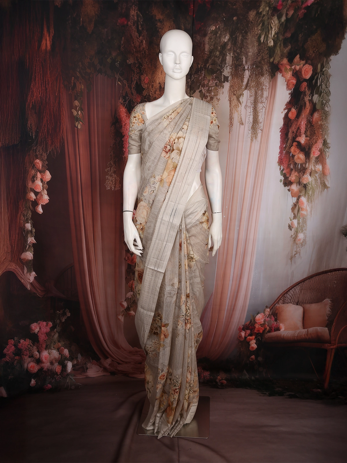 The saree features delicate pastel floral prints that add a refined charm, while the self-woven monochrome border ensures a clean and classy finish. The floral pallu softly highlights the drape, giving a graceful flow to the silhouette.