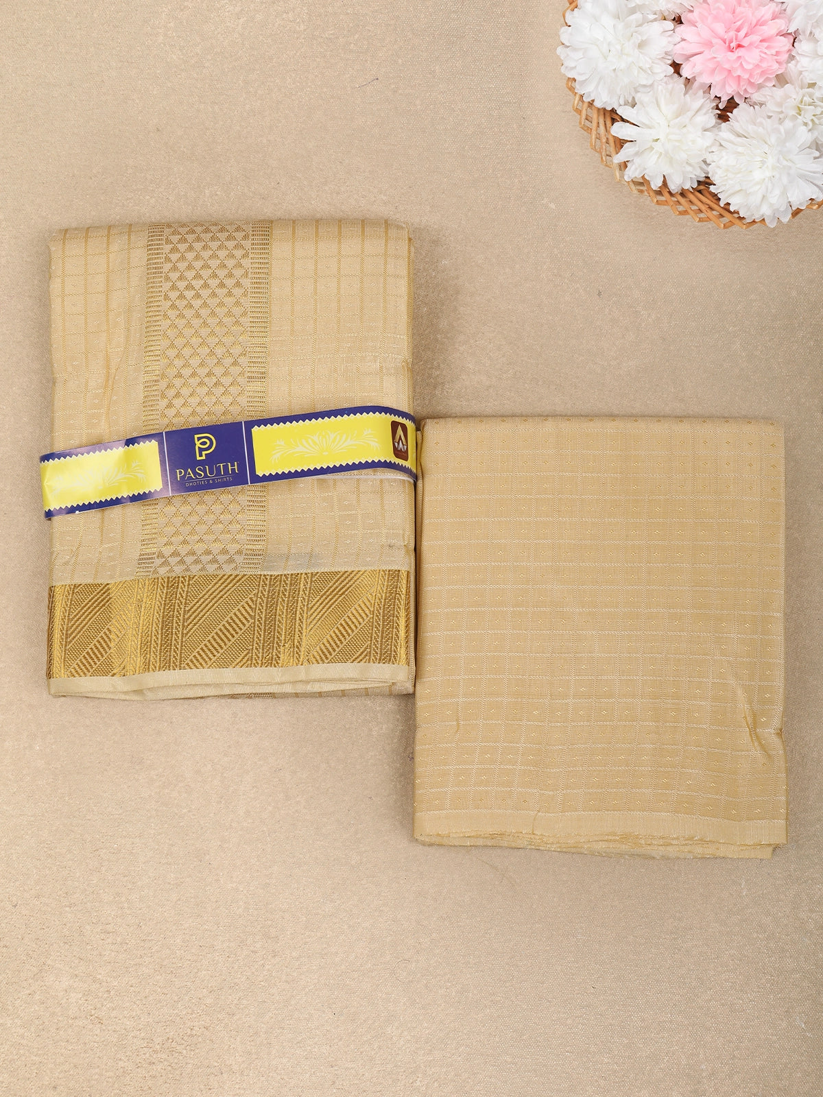 The unstitched shirt fabric features a smooth, comfortable texture that allows for custom tailoring to your preferred fit and style. Paired with a matching dhoti, the set is enhanced by a classic gold zari border, adding a subtle touch of heritage richness without overpowering the minimal design.