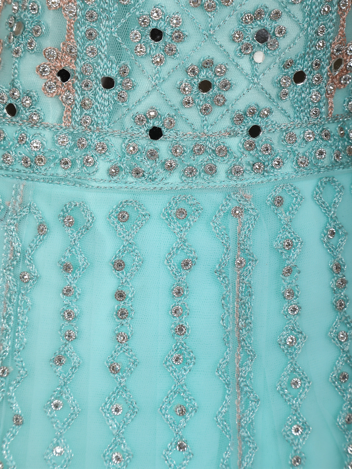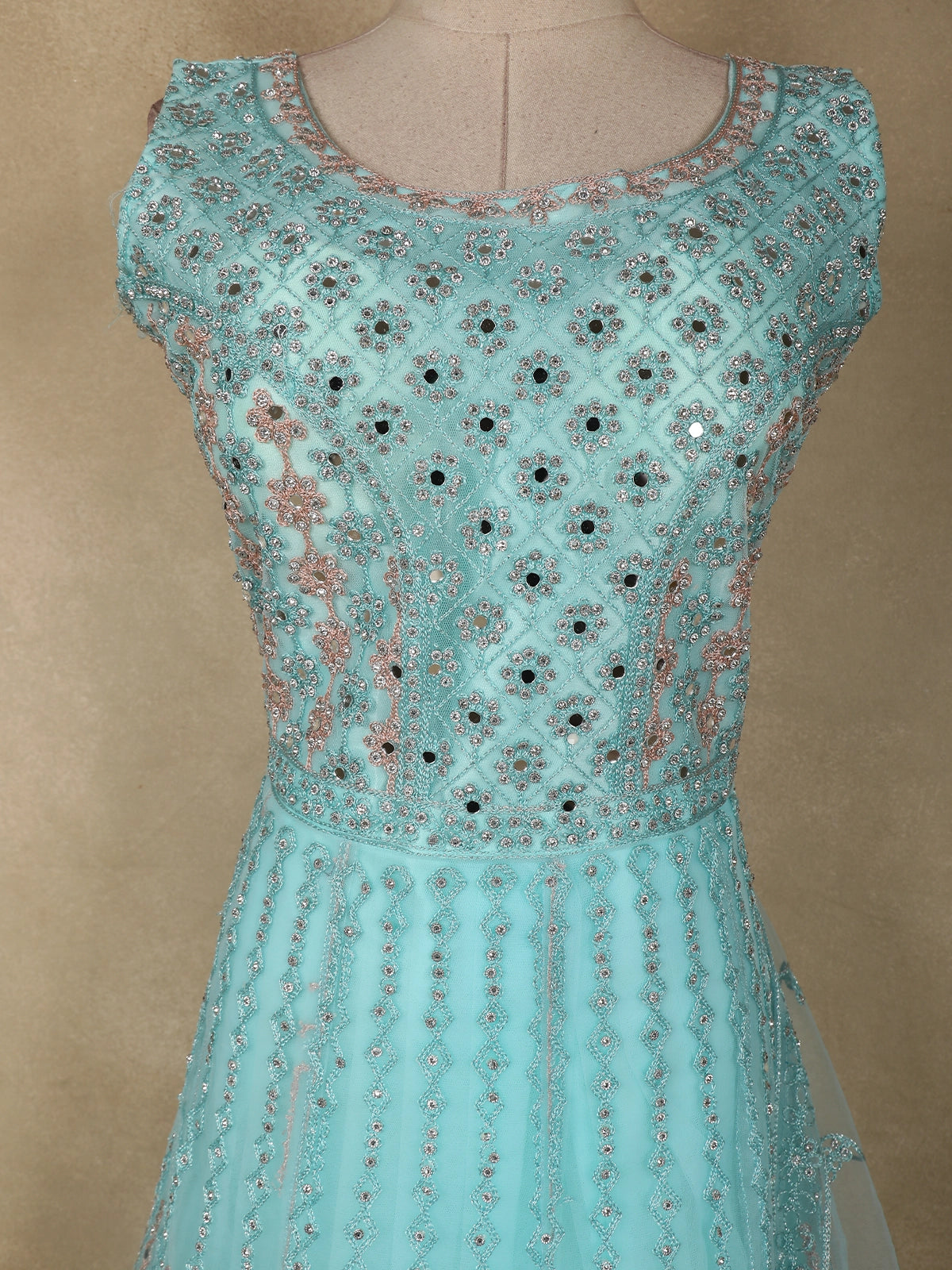 Gracefully crafted in a refreshing light blue hue, this net bridesmaid gown is a perfect blend of elegance and subtle glamour. The bodice is adorned with intricate bead and sequin embroidery arranged in delicate patterns, adding a refined sparkle that beautifully complements the soft pastel tone. The detailed workmanship lends a luxurious appeal while maintaining a light, airy feel.