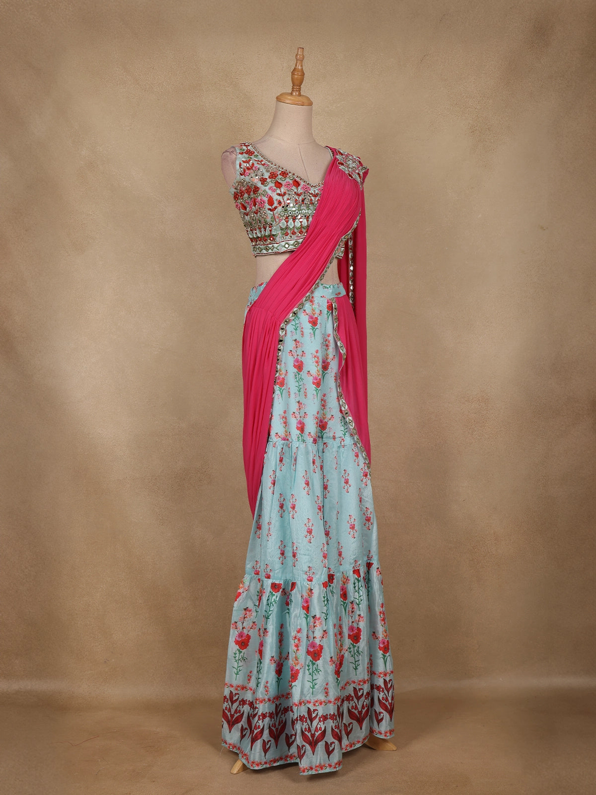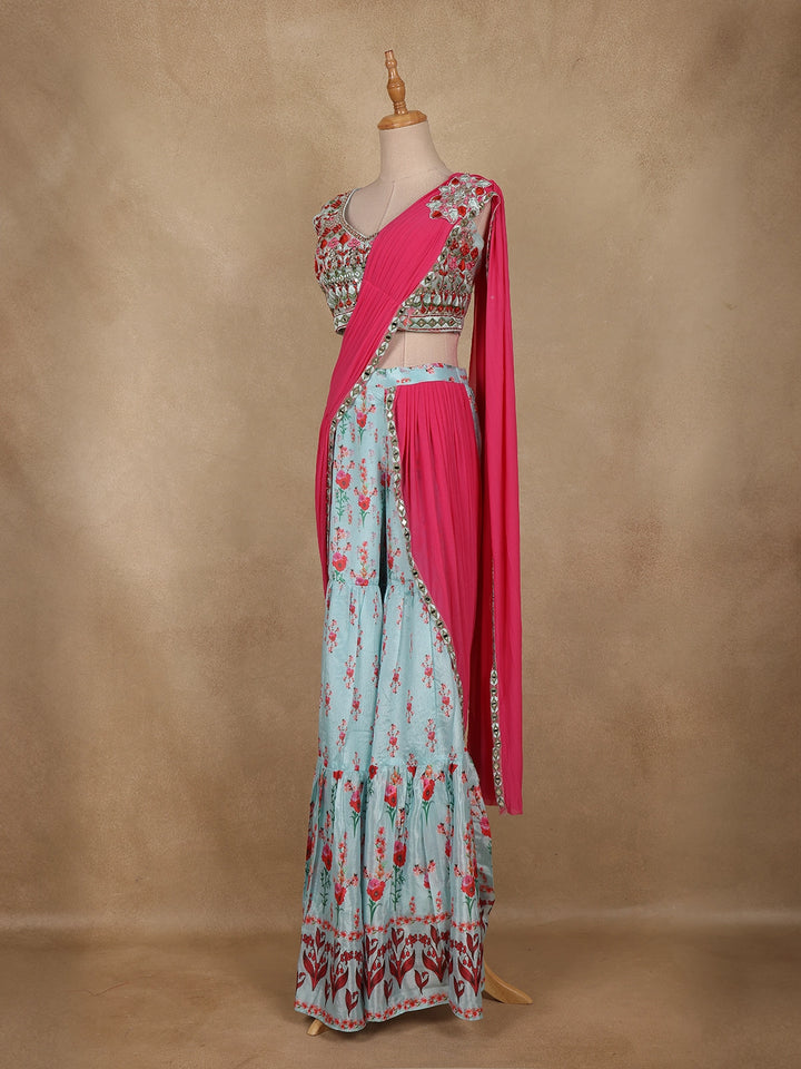 This elegant palazzo suit features a light blue floral printed crepe silk bottom paired with a vibrant fuchsia pink attached dupatta that drapes gracefully across the shoulder. The embroidered blouse is adorned with rich mirror, thread, and floral motifs in red, pink, and green tones on a pastel base, adding a touch of traditional glamour.