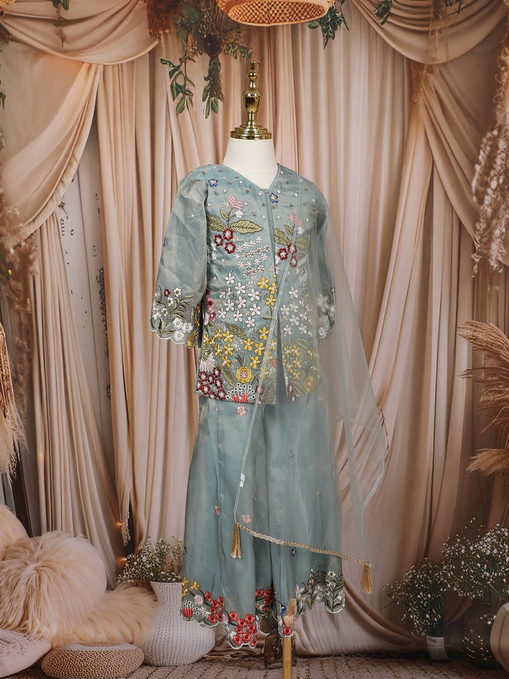 Light Blue Floral Embroidered Tissue Silk Kids Palazzo Suit