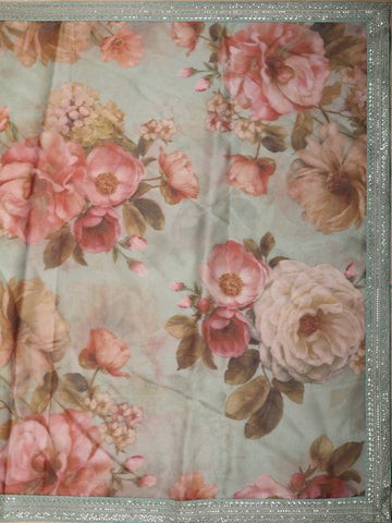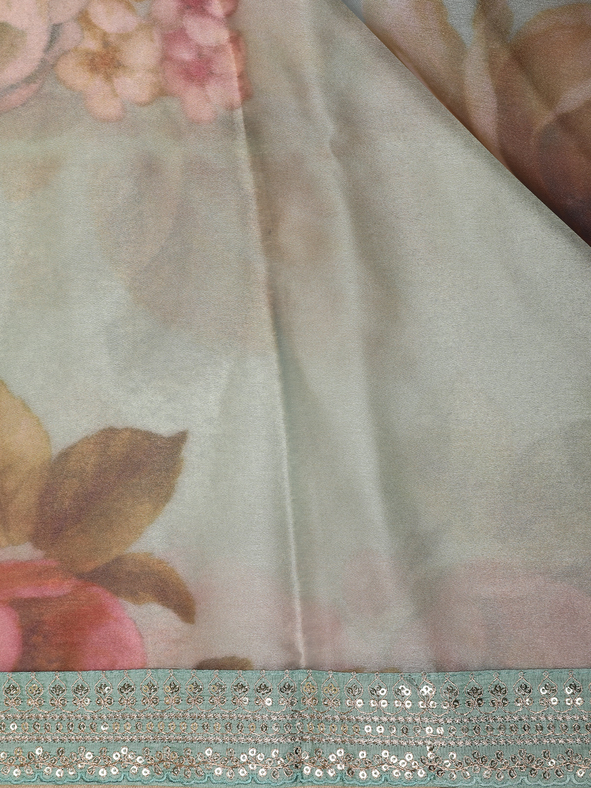 Light Blue Floral Printed Tissue Organza Saree with Sequins Embroidered Border