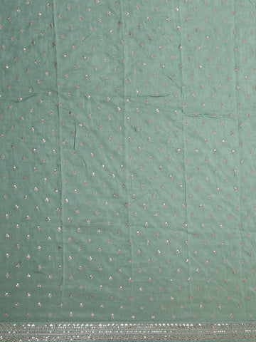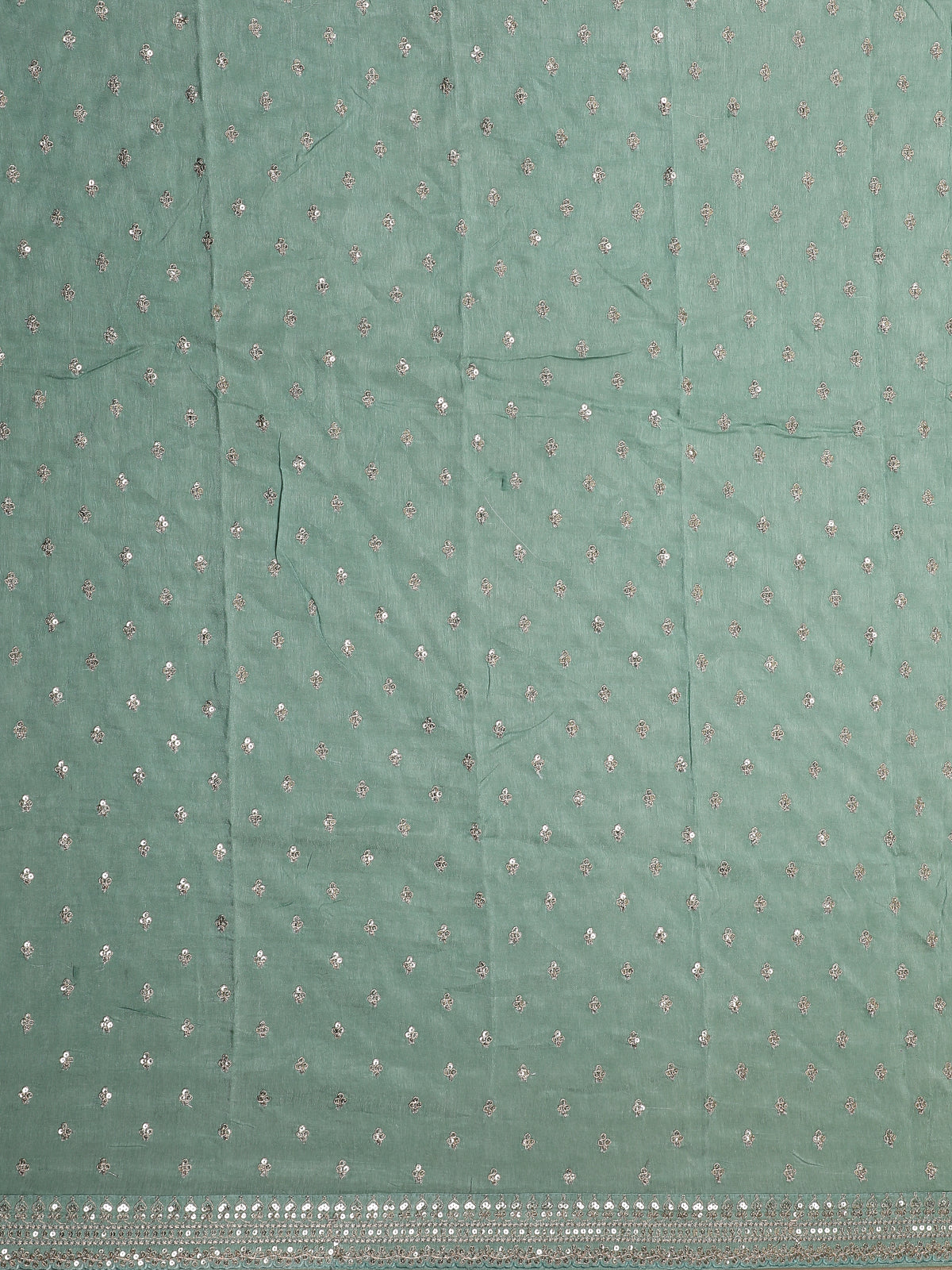 The border is adorned with a finely detailed sequins and thread embroidered edging, adding a refined shimmer that catches the light delicately while maintaining the saree’s elegant charm.