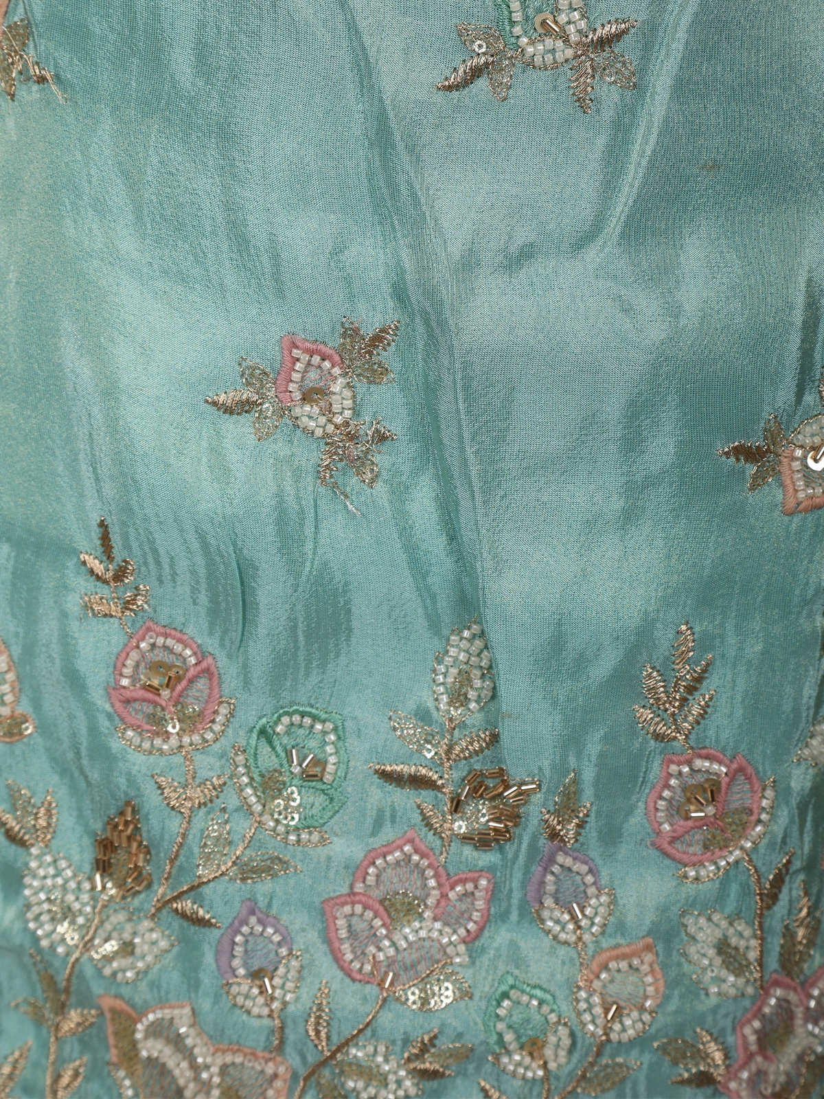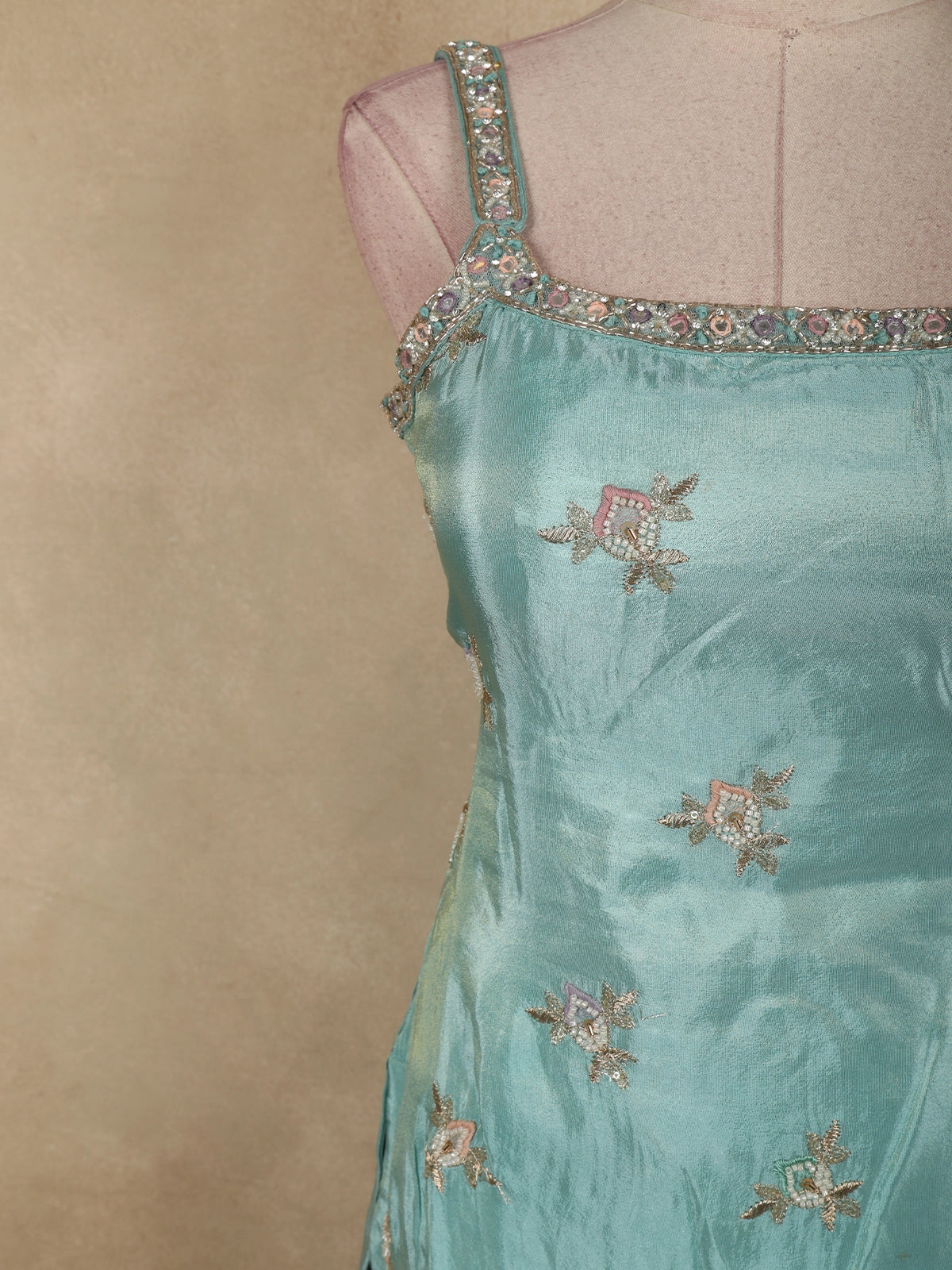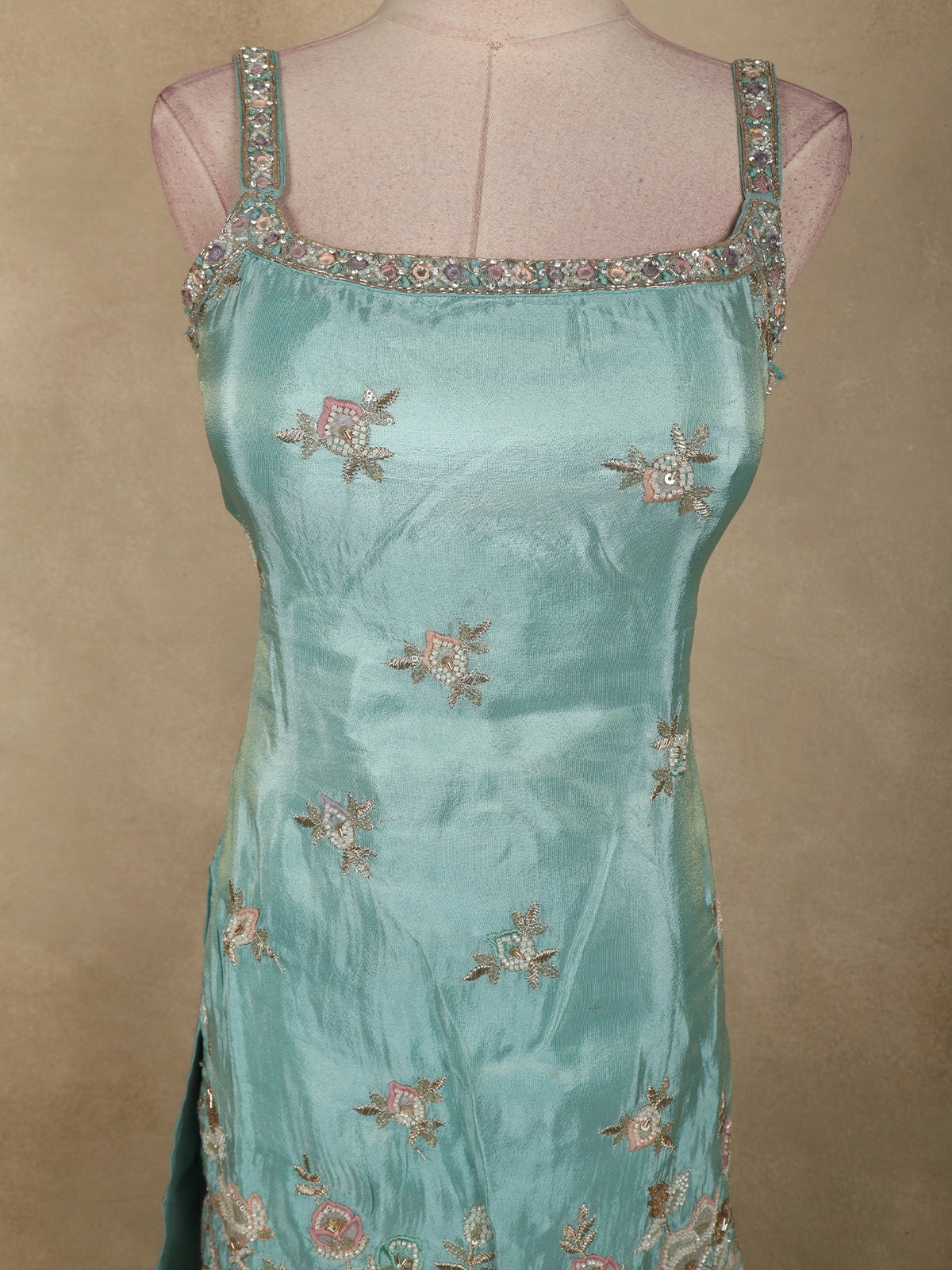 The kurti is crafted in luxurious tissue fabric, adorned with delicate floral motifs embroidered using sequins and fine beadwork. These embellishments are thoughtfully scattered across the body, while the hemline features slightly denser floral embroidery for a balanced, graceful finish. The neckline and shoulder straps are highlighted with subtle stone and bead detailing, adding a touch of shimmer without overpowering the softness of the design.