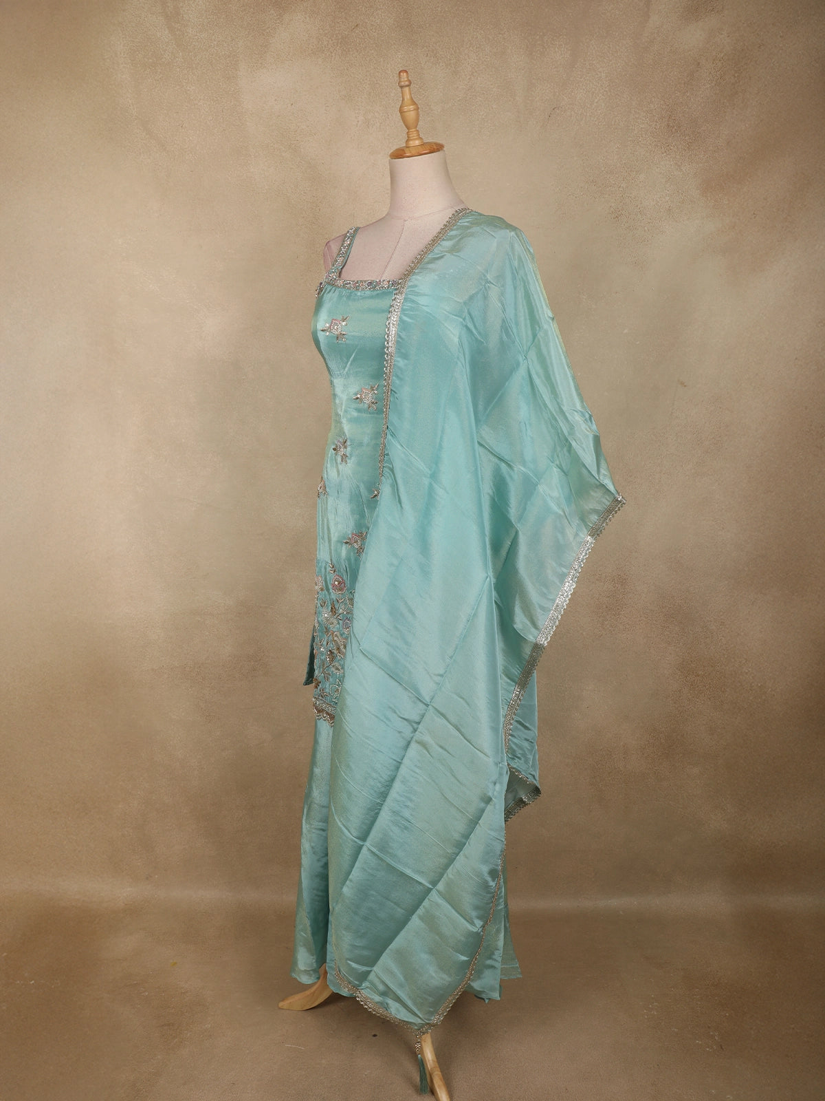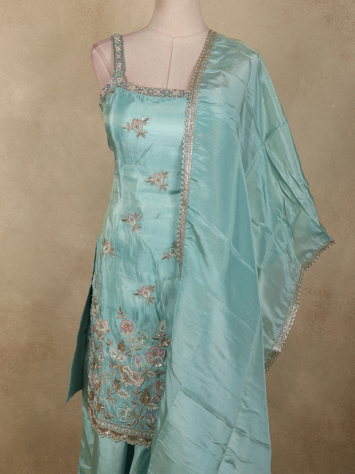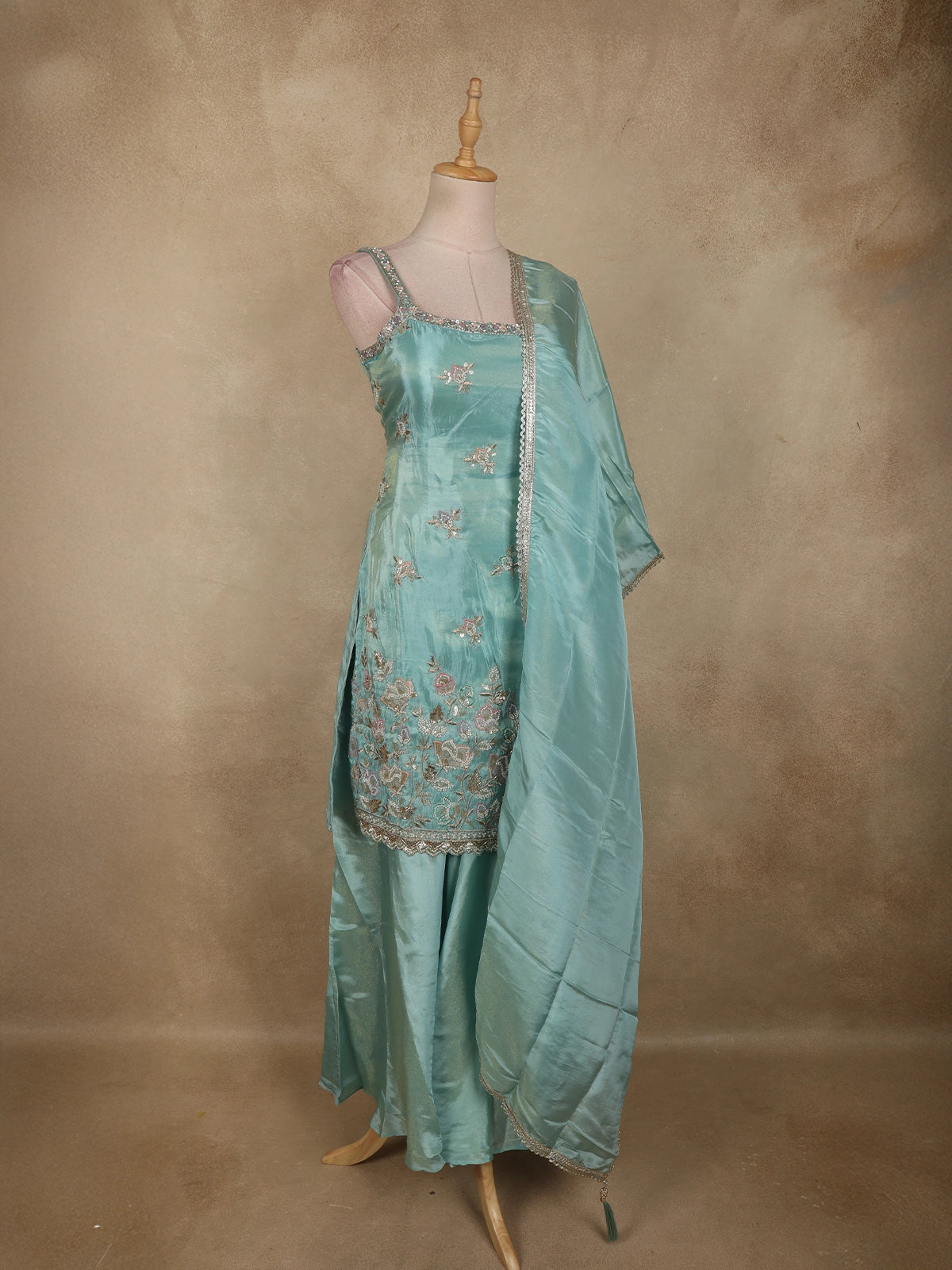 Light Blue Floral Sequins and Beads Embroidered Design Tissue Palazzo Suit with Dupatta
