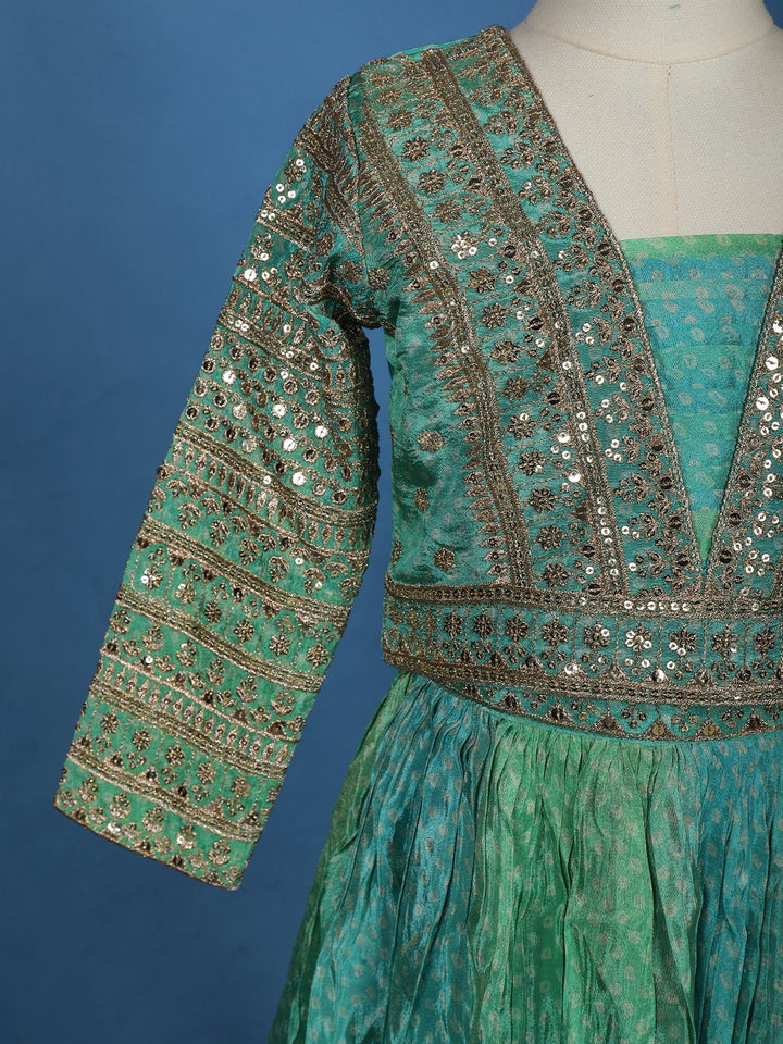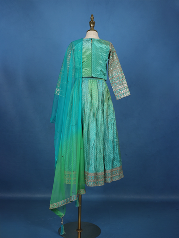 Let your little one sparkle with grace in this light blue silk kids lehenga set, exquisitely designed with delicate floral embroidery and shimmering sequin work. The V-neck blouse, styled with elegant full sleeves, brings a touch of regal charm, while the soft silk fabric ensures comfort without compromising on sophistication.