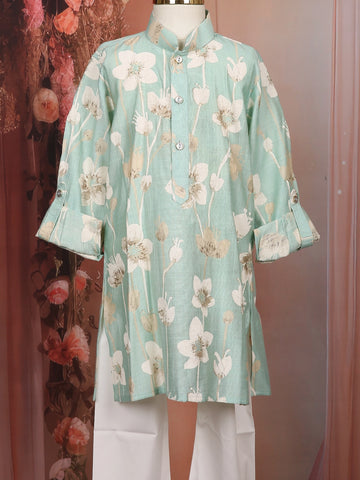 Crafted from breathable and lightweight cotton fabric, this kurta set ensures maximum comfort for your little one throughout the day. The stylish mandarin collar, front button placket, and roll-up sleeves with button loops add a modern twist, offering versatility in styling. Paired with a crisp white pyjama, this outfit delivers a complete, polished ethnic look.