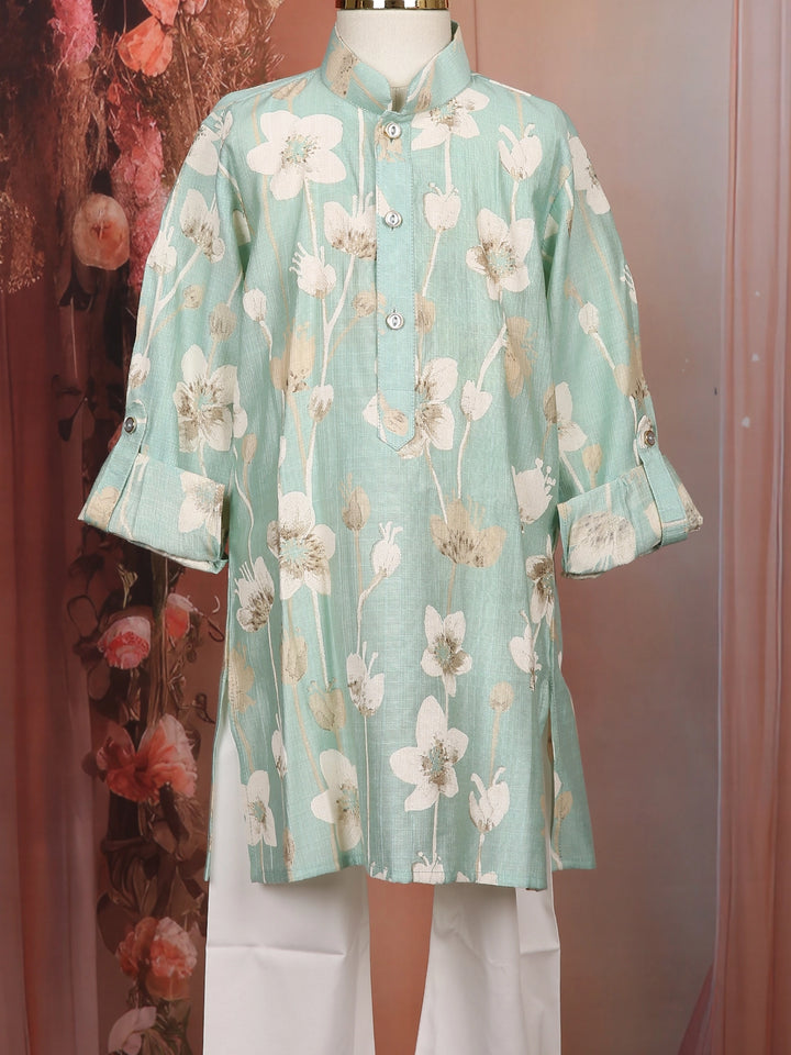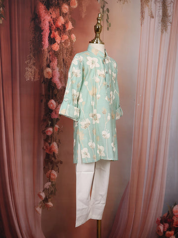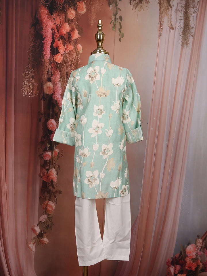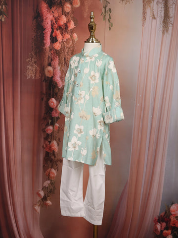 Bring a refreshing festive charm to your child’s wardrobe with this Light Blue Floral Woven Design Kurta Set — a perfect blend of comfort and style. The soothing pastel hue combined with delicate floral motifs creates a soft and elegant appeal, making it ideal for both traditional and semi-formal occasions.