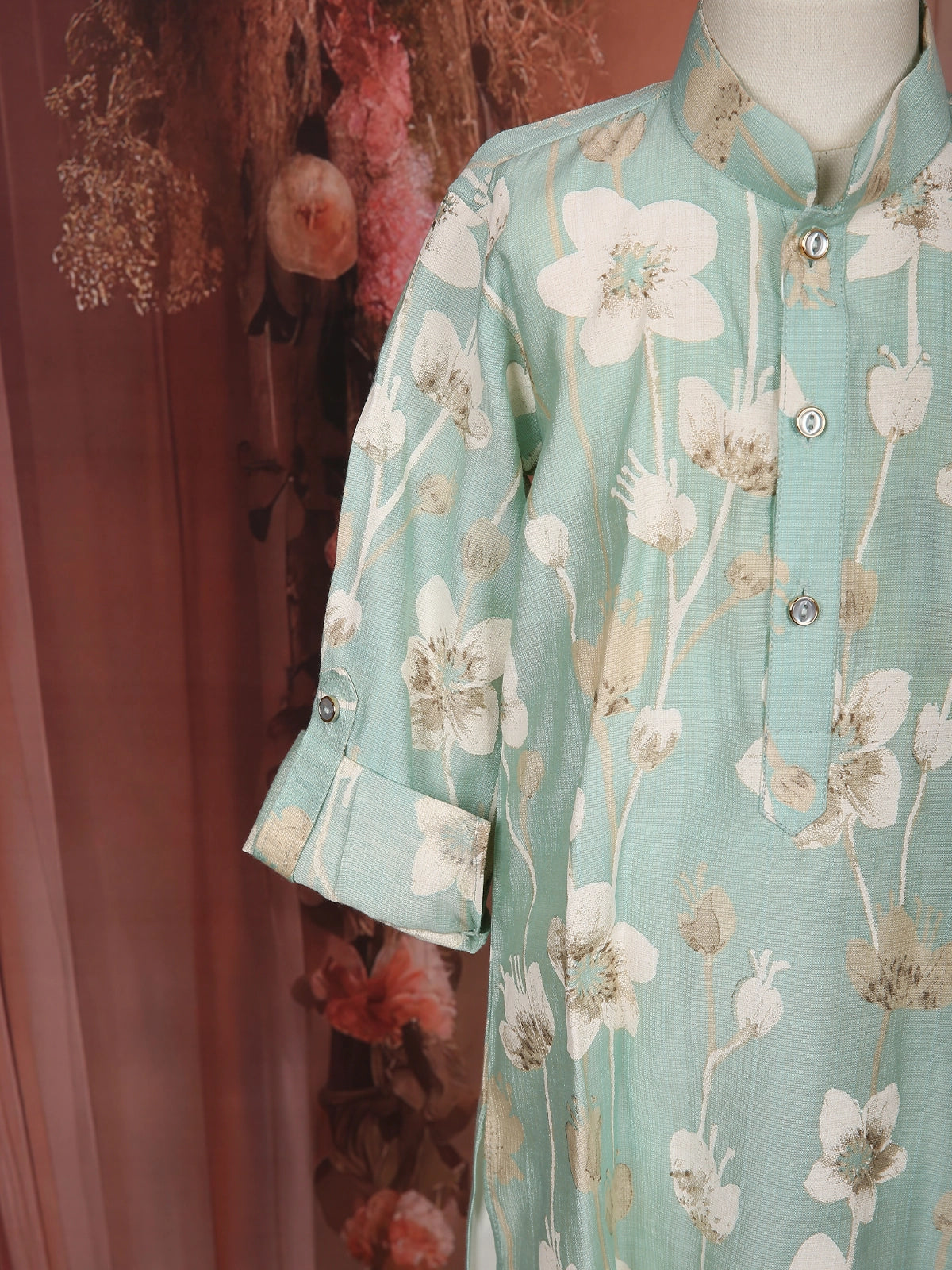 Light Blue Floral Woven Design Cotton Kids Kurta Set