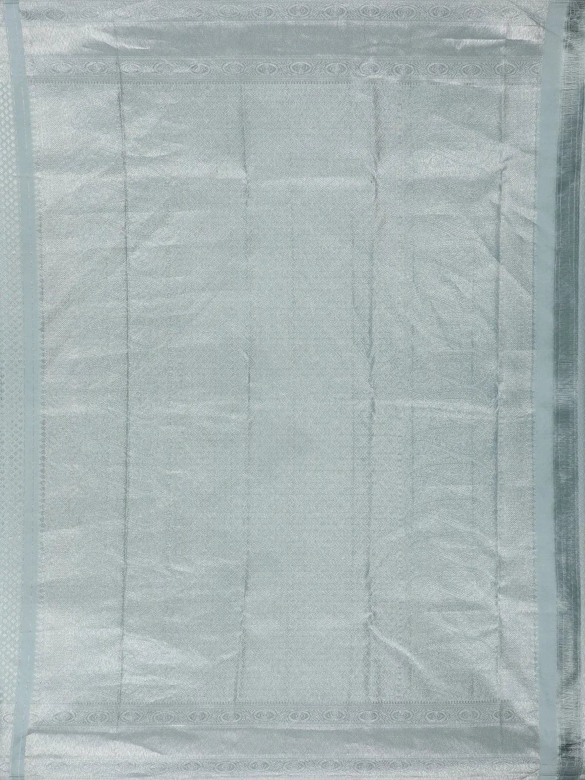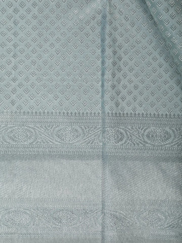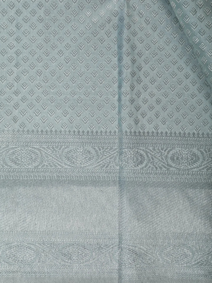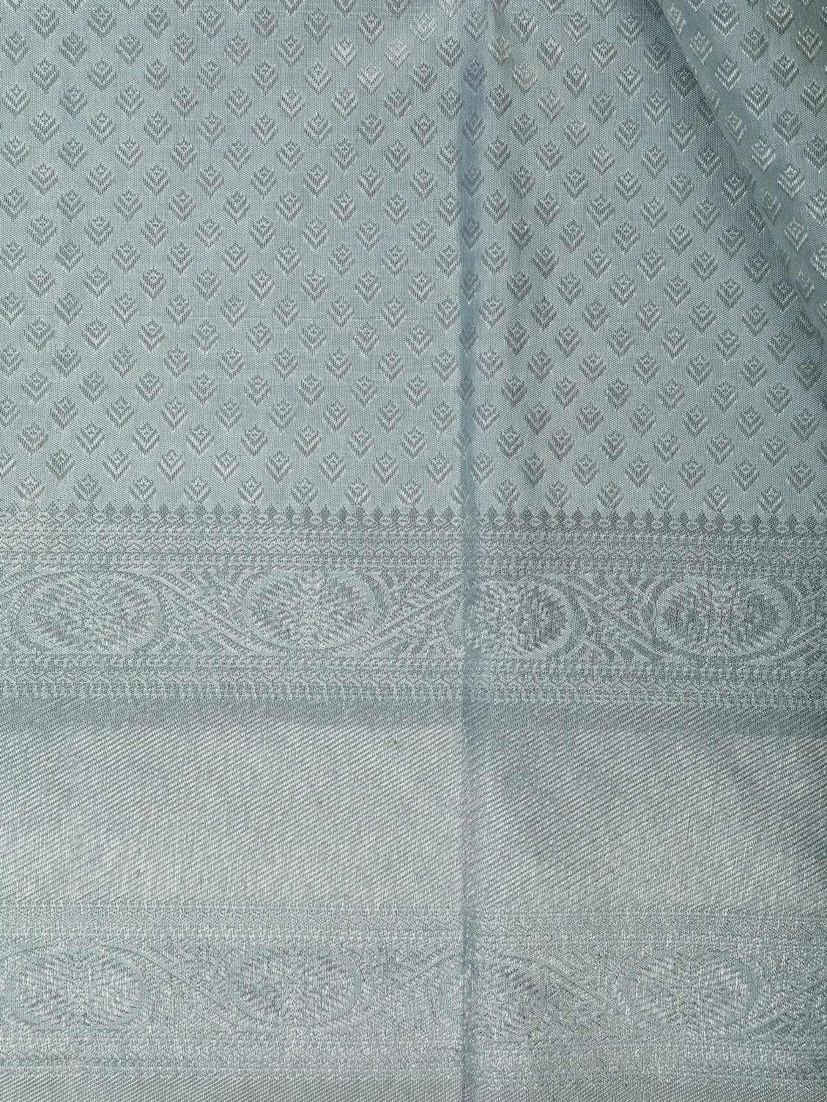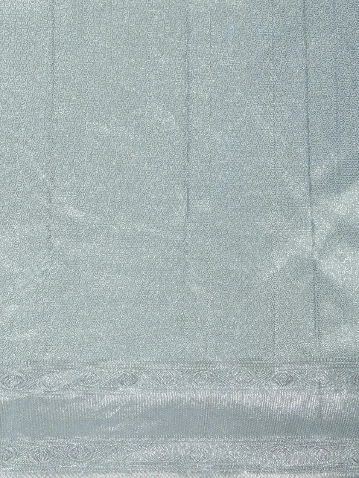 The zari border, adorned with intricate motifs, frames the saree beautifully and adds a regal sheen to the subtle light blue tone. A matching pallu continues the zari detailing, enhancing the richness of the drape. The saree comes with a matching blouse piece in the same hue, offering endless styling possibilities.