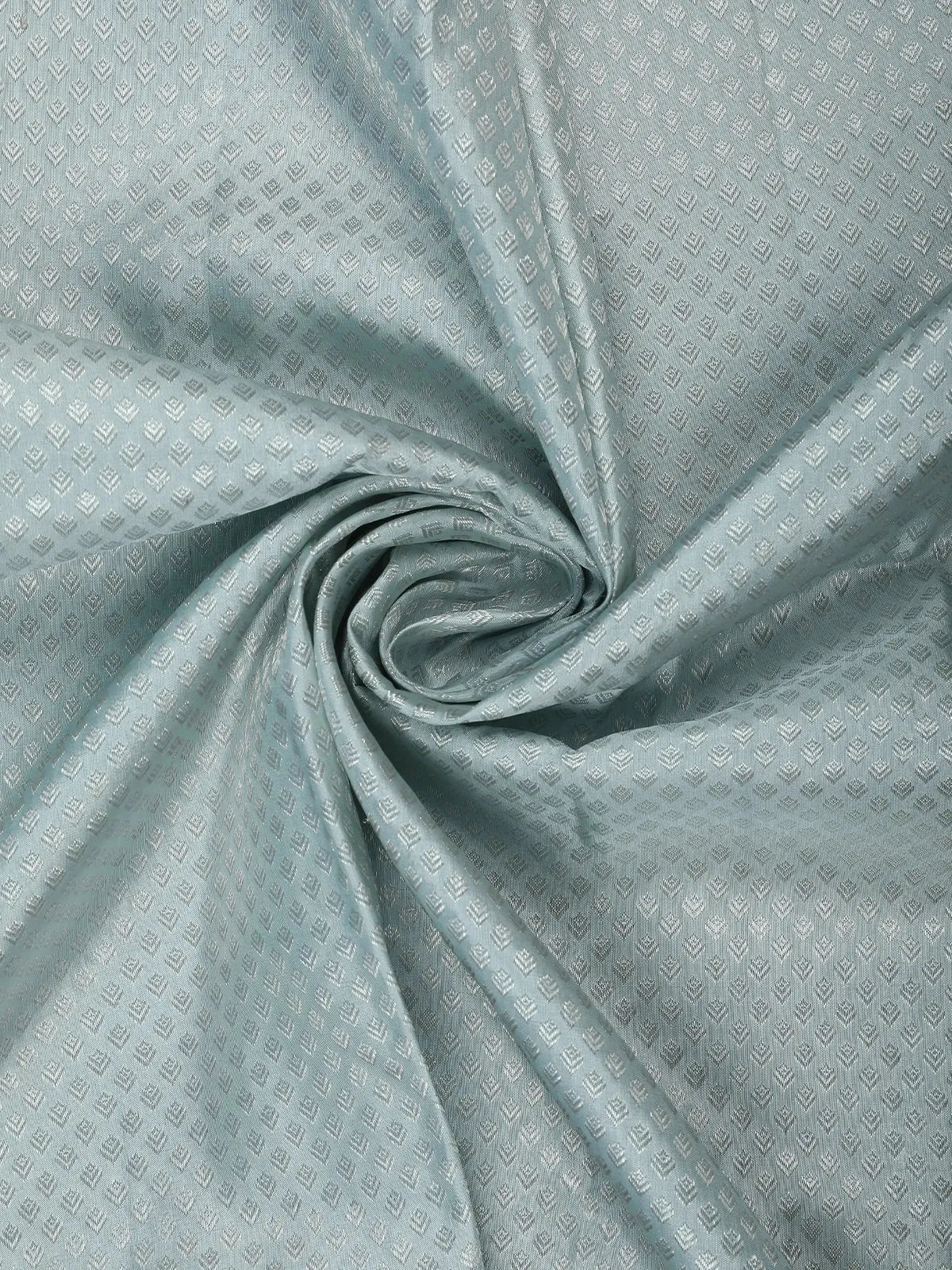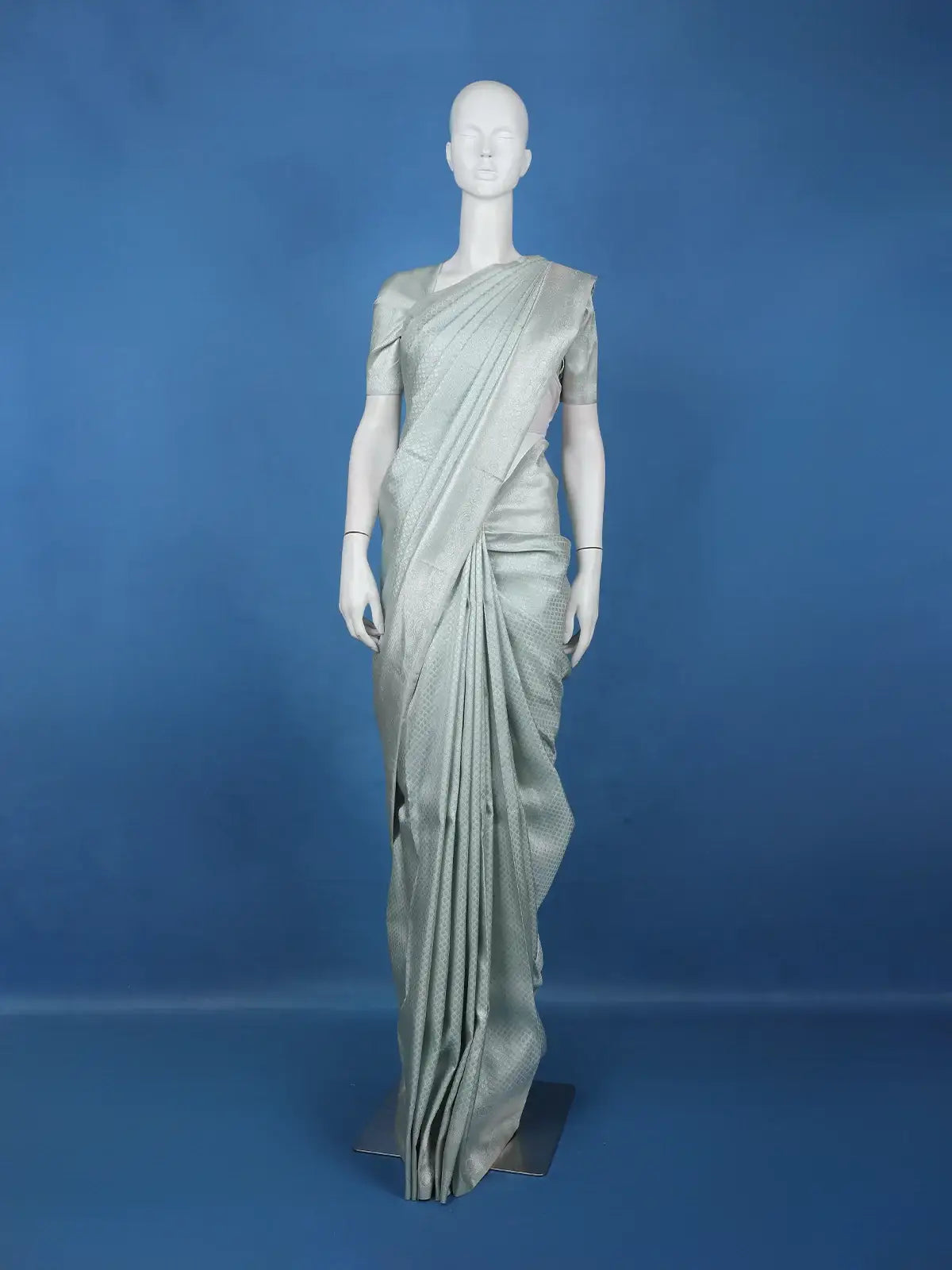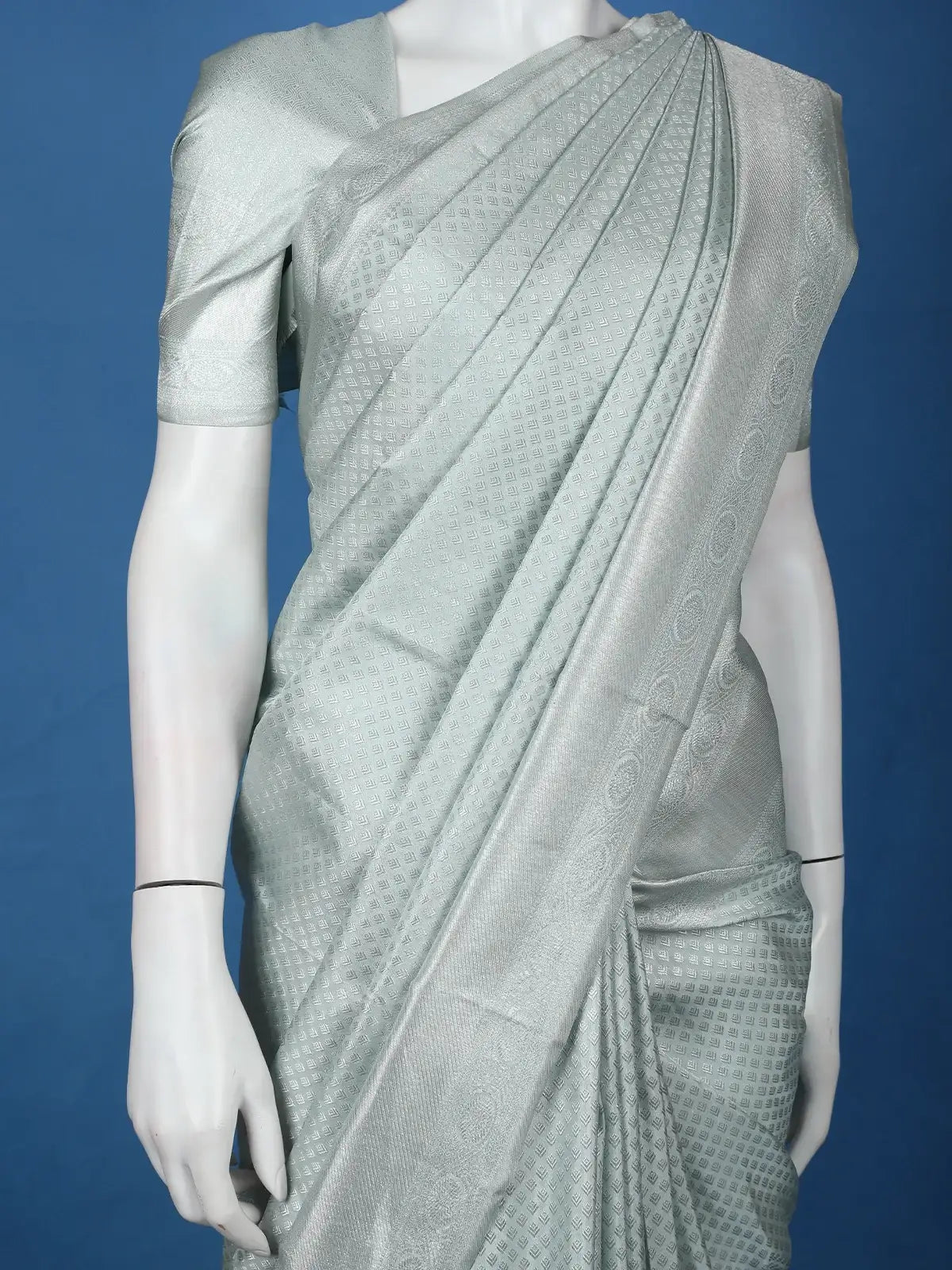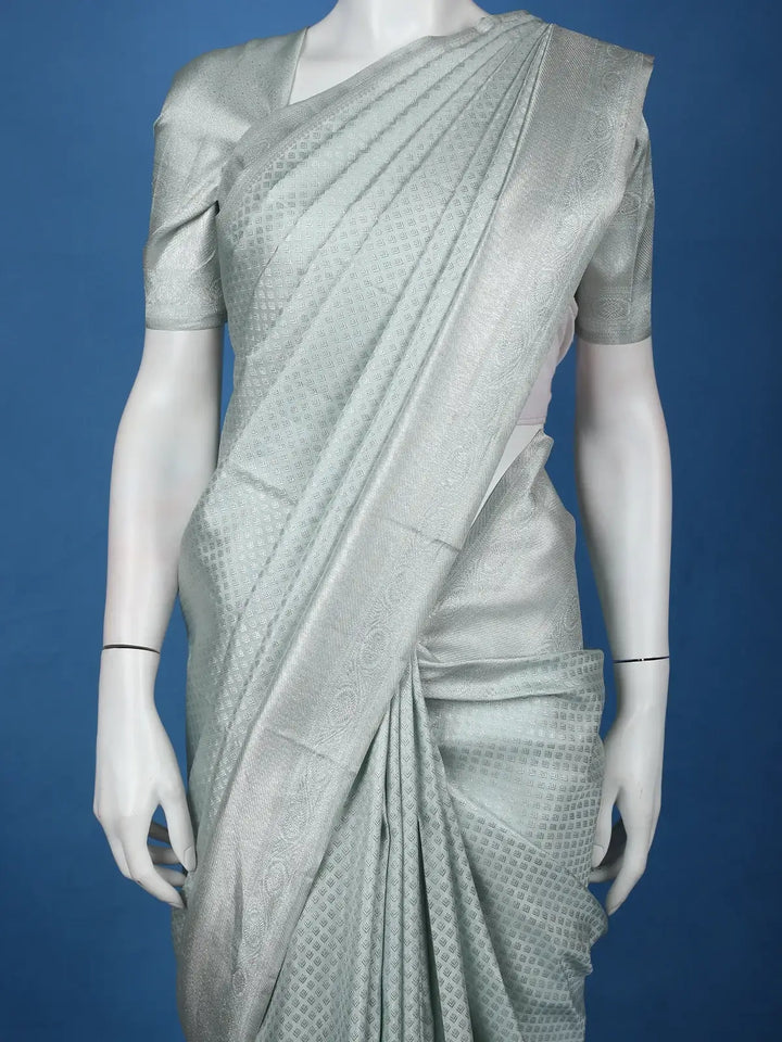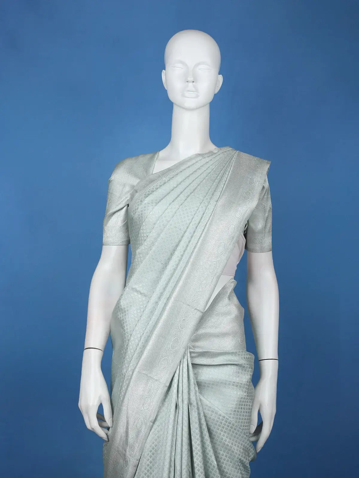 The zari border, adorned with intricate motifs, frames the saree beautifully and adds a regal sheen to the subtle light blue tone. A matching pallu continues the zari detailing, enhancing the richness of the drape. The saree comes with a matching blouse piece in the same hue, offering endless styling possibilities.