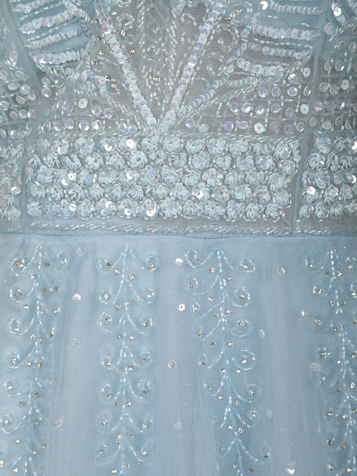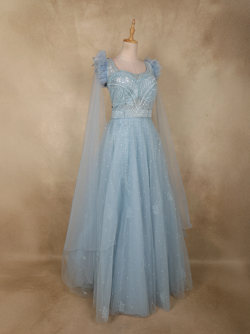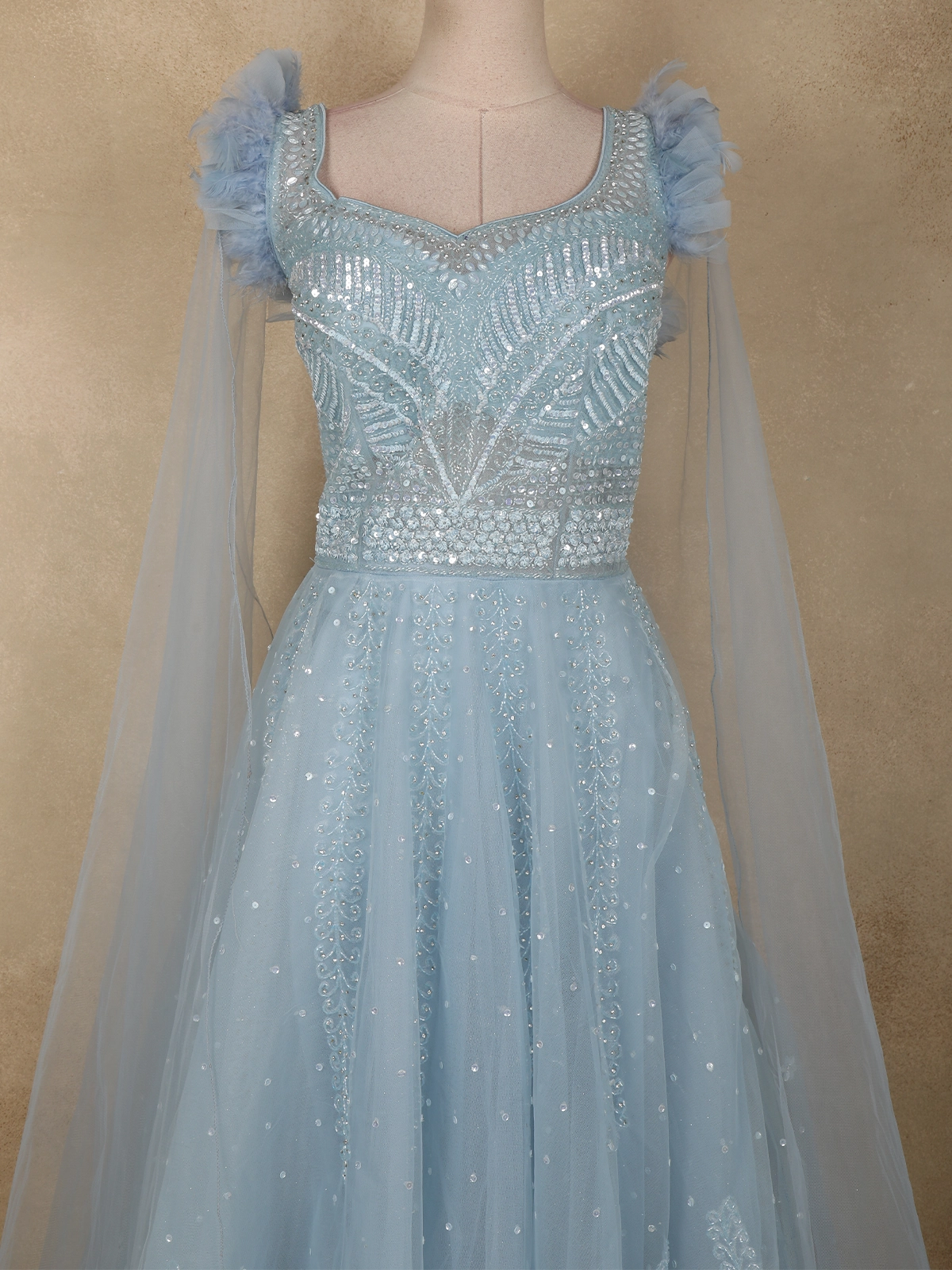 Step into a world of soft elegance with this Light Blue Heavy Sequins and Beads Embroidered Design Net Party Wear Gown, designed to create a dreamy, graceful presence. The soothing light blue shade lends a refreshing charm, while the bodice is richly adorned with intricate sequins and bead embroidery arranged in elegant geometric and floral patterns that shimmer beautifully under the light.