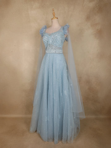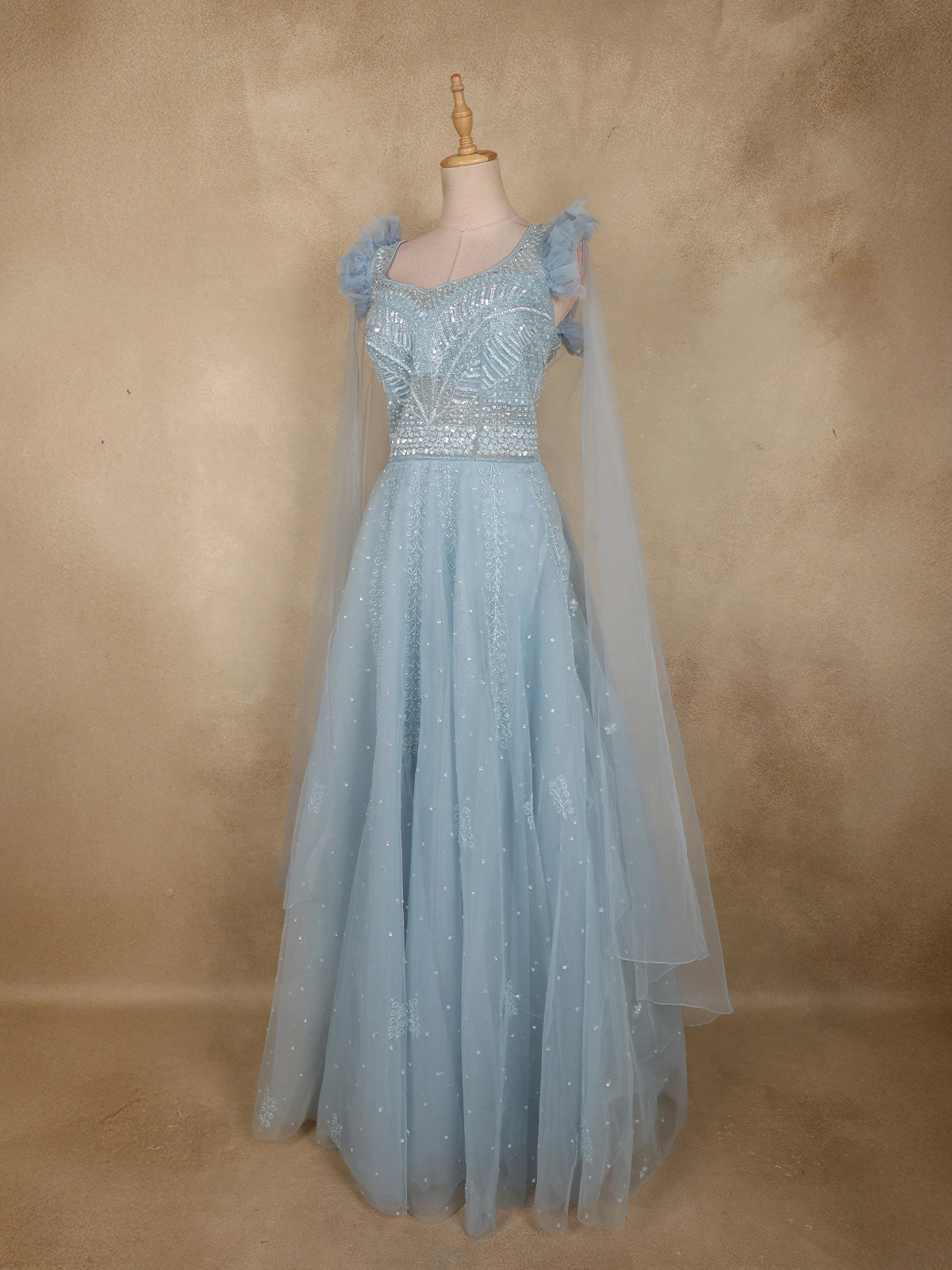 Perfect for evening parties, receptions, birthday celebrations, and special occasions, this gown pairs best with minimal jewellery and soft makeup, allowing the intricate craftsmanship and serene colour to take centre stage.