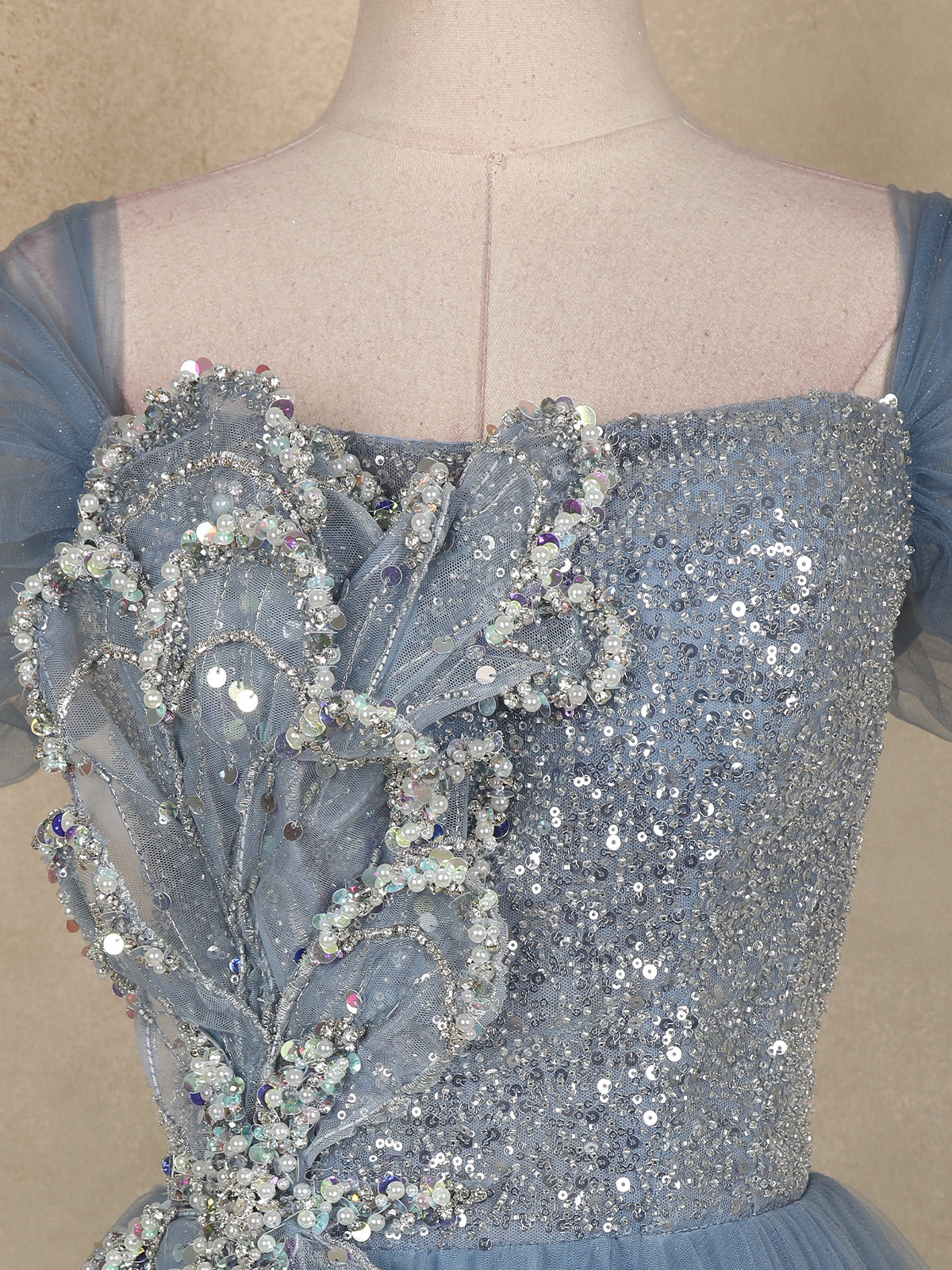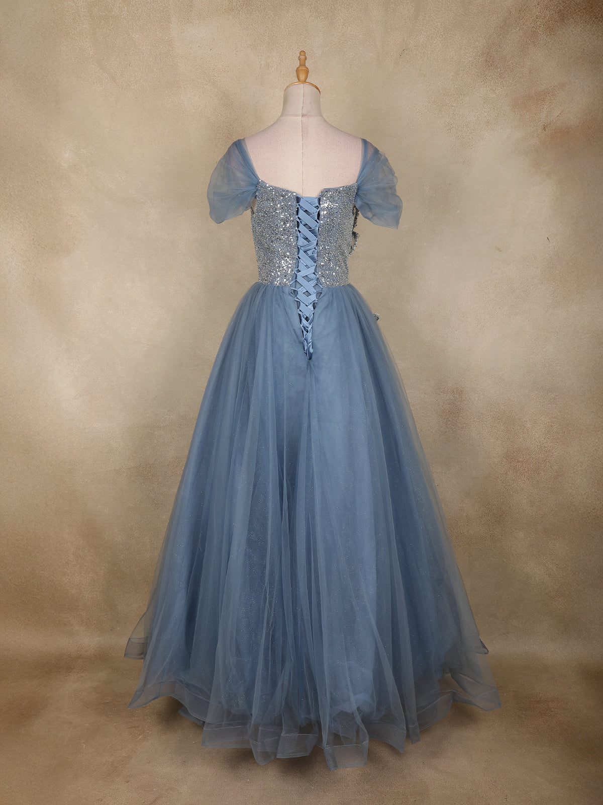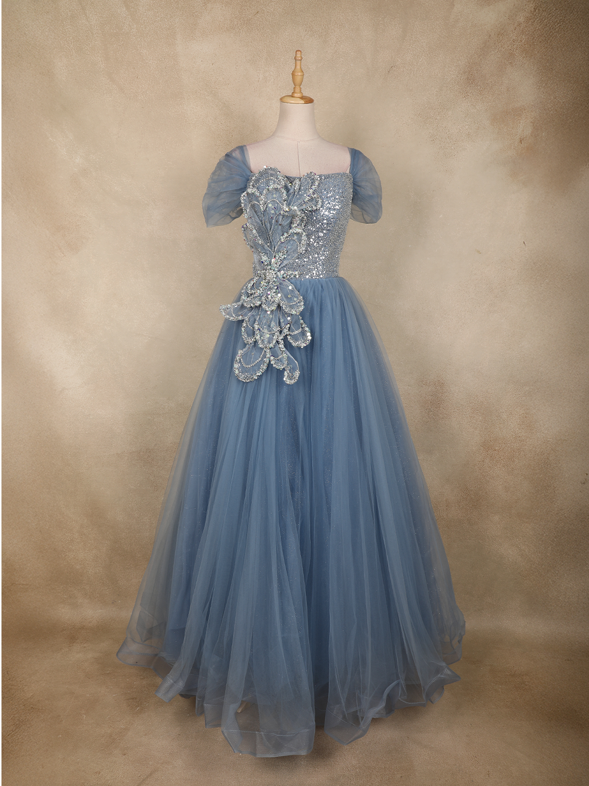 Light Blue Sequins Embellished Design Net Ball Gown with Puff Sleeves