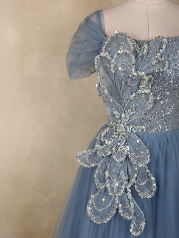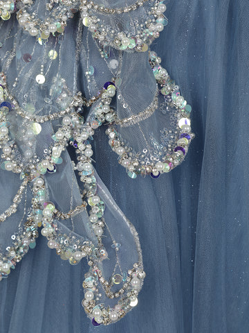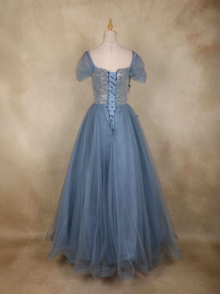 Radiate elegance and charm in this mesmerizing Light Blue Sequins Embellished Net Ball Gown, a perfect blend of fairy-tale beauty and modern glam. The shimmering sequin-studded bodice creates a dazzling effect under every light, while the exquisite floral appliqué crafted on one side adds a luxurious statement detail.