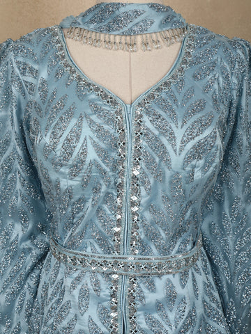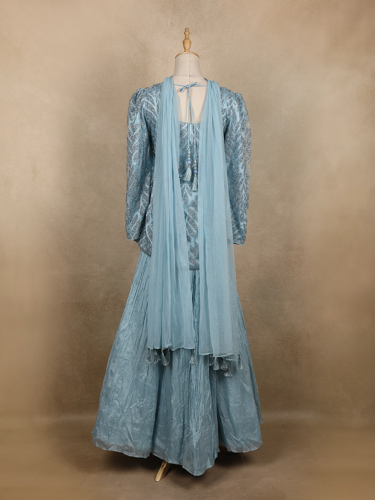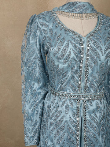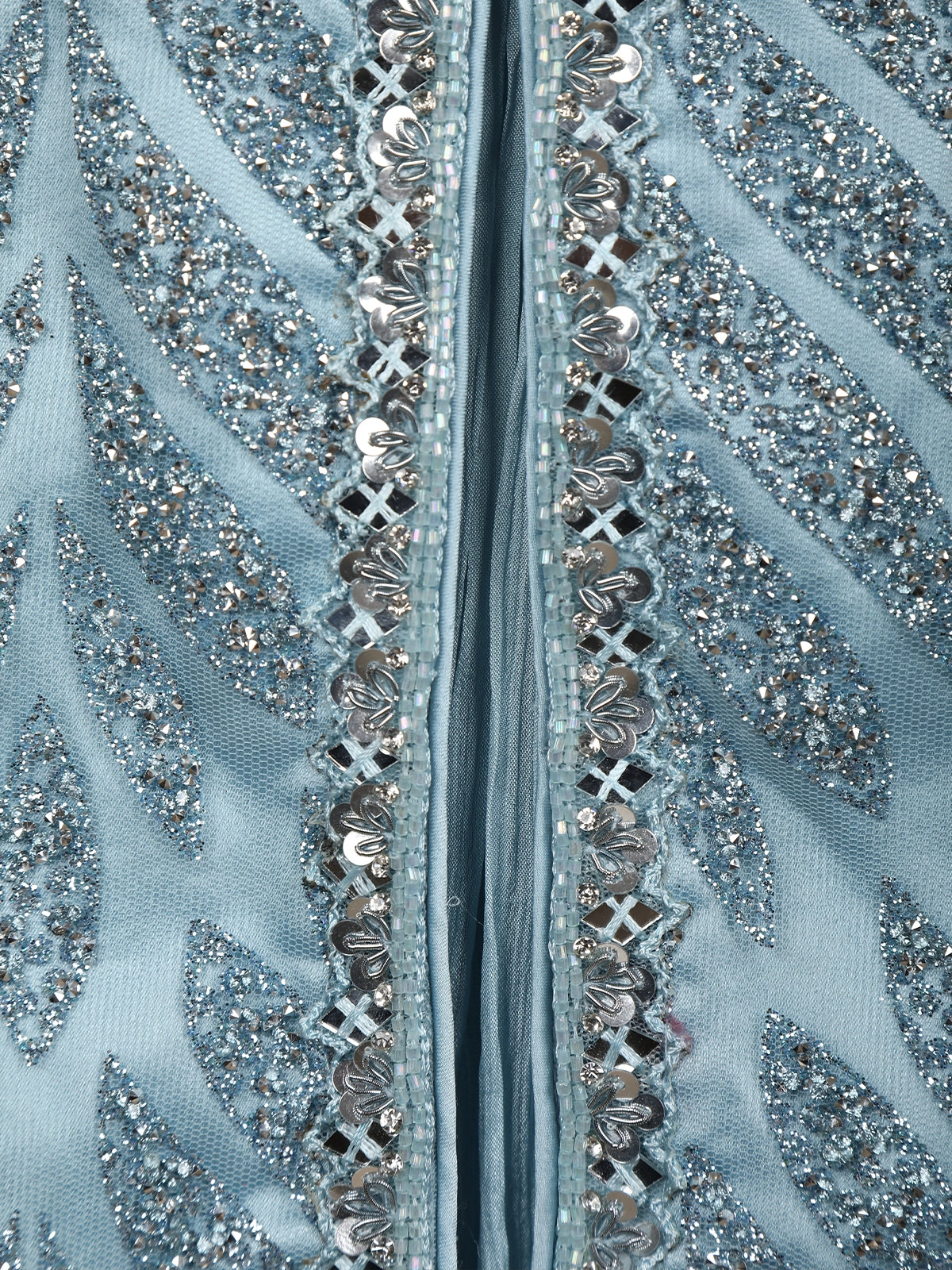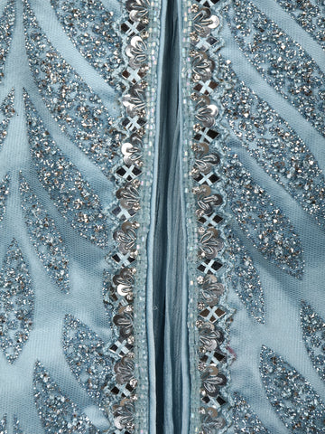 Ethereal and radiant, this Light Blue Sequins Embroidered Satin and Net Lehenga embodies the elegance of modern-day royalty. Crafted with finesse, the ensemble combines the luxurious sheen of satin with the soft, flowing grace of net — creating a dreamy silhouette that glimmers with every step.
