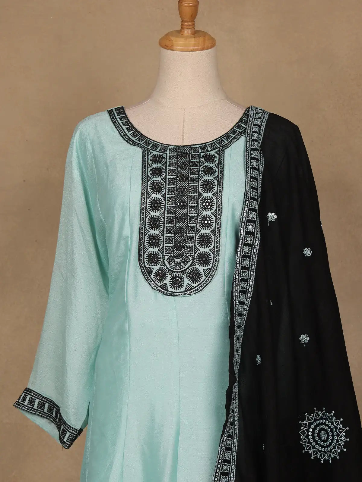 Exude sophistication in this Light Blue Silk Blend Salwar Suit, designed to bring together tradition and elegance. The smooth silk blend fabric carries a natural sheen, enhancing the richness of the ensemble while keeping it lightweight and comfortable. The kurta is styled in a straight-cut silhouette with a round neckline, beautifully highlighted by intricate black thread embroidery and delicate sequin accents that add just the right amount of sparkle. The 3/4th sleeves feature embroidered borders that echo the neckline detailing, creating a harmonious and refined look.