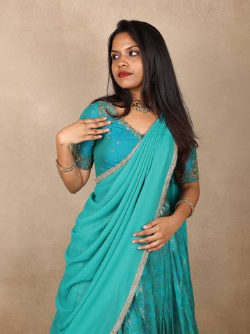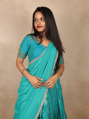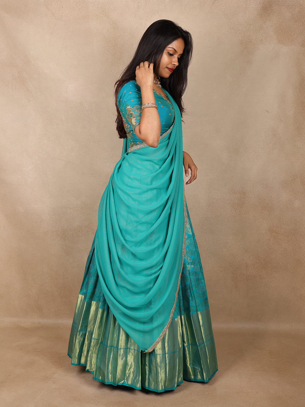 Completing the ensemble is a soft-flowing dhavani dupatta, finished with a finely detailed gold border that adds graceful movement and ceremonial charm. Draped traditionally, it highlights the beauty of the ensemble while offering a regal, well-balanced look.