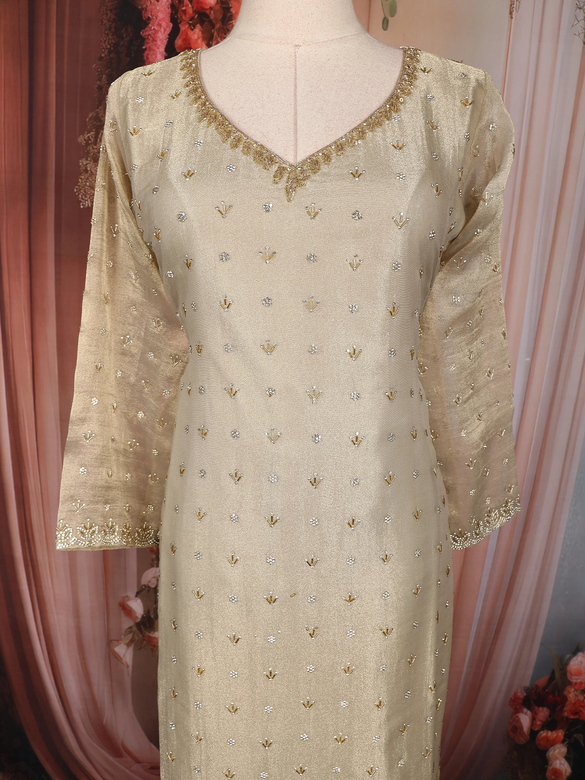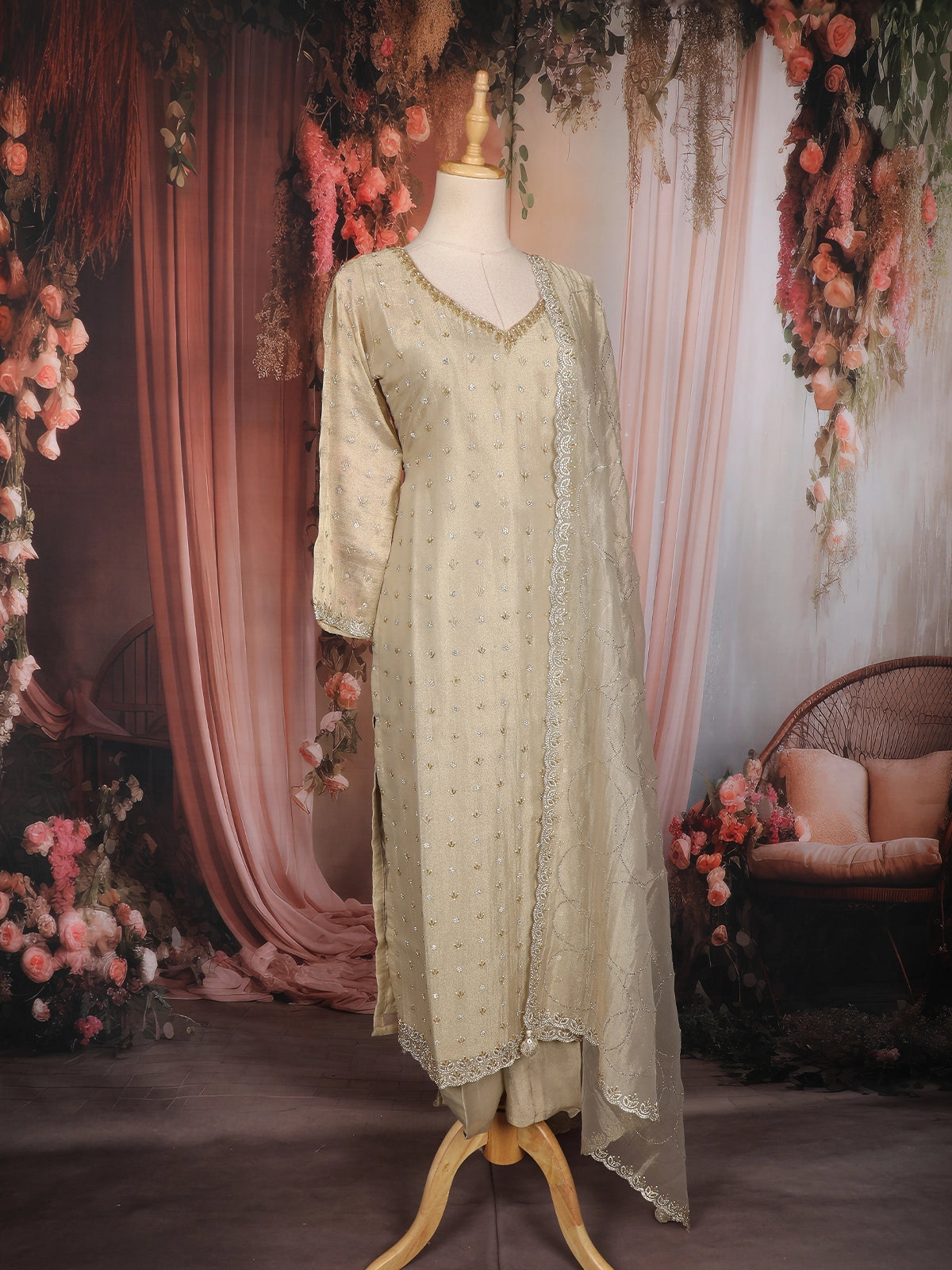 Embrace timeless elegance with this Light Brown Floral Embroidered Tissue Silk Straight Cut Salwar Suit, designed to bring understated luxury to your festive wardrobe. Crafted from premium tissue silk, the kurta features delicate all-over floral butta motifs highlighted with subtle sequins and fine thread embroidery, giving it a soft shimmer and refined appeal.