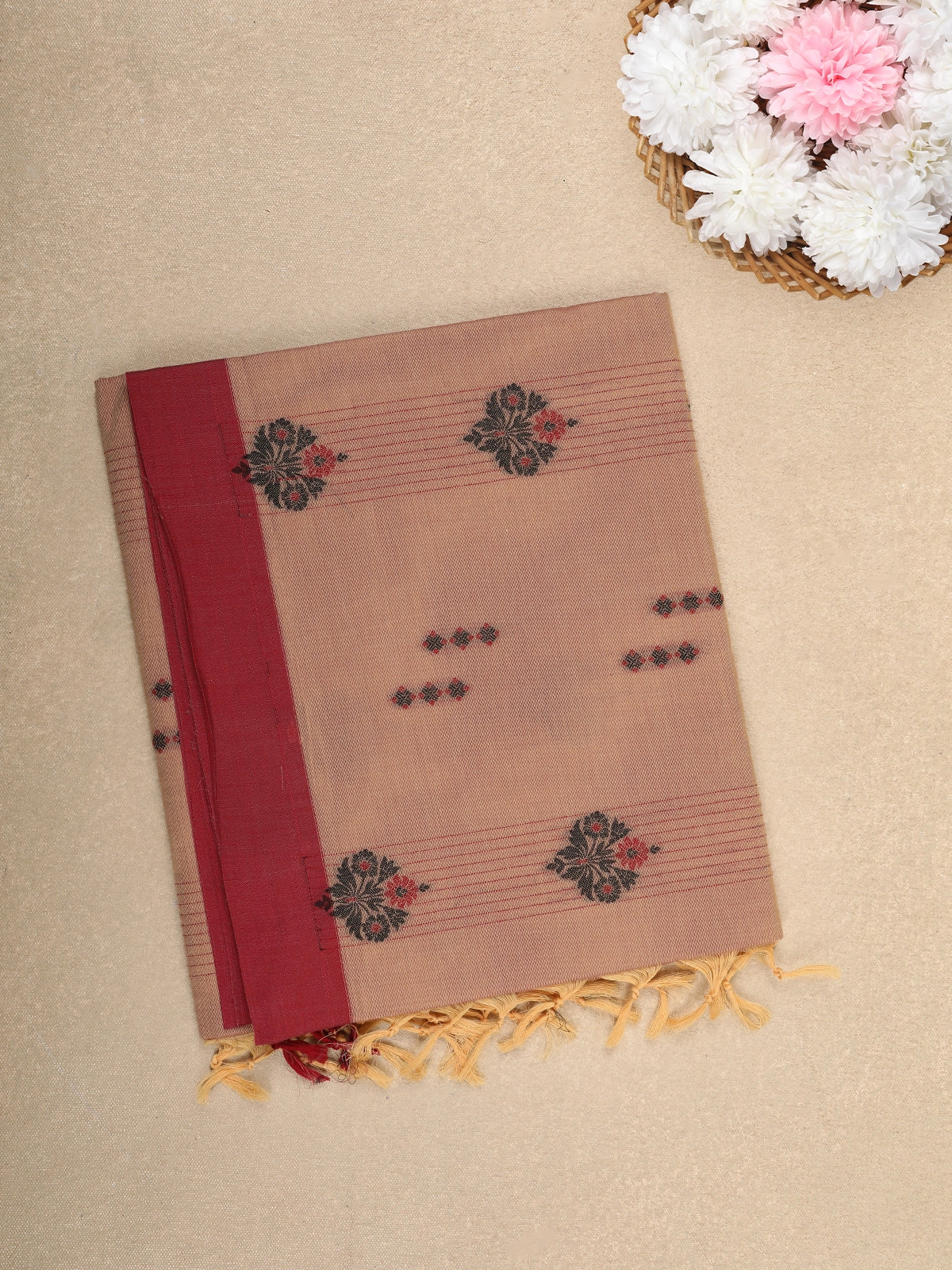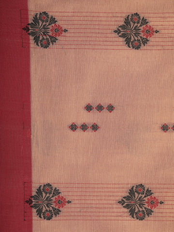 Light Brown Floral Motif and Stripes Design Cotton Saree with Contrast Red Border