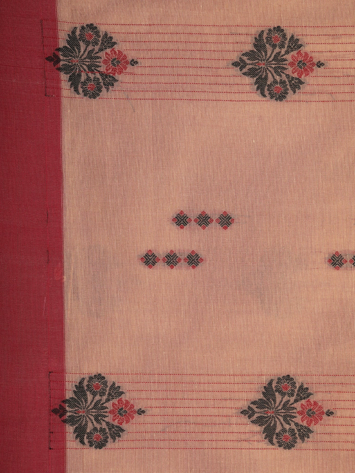 Add a touch of gentle sophistication to your ethnic wardrobe with this Light Brown Handloom Cotton Saree featuring beautifully woven floral motifs enhanced with pops of red. The subtle striped detailing gives the drape elegant continuity while maintaining a refined and minimal aesthetic.