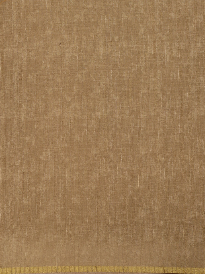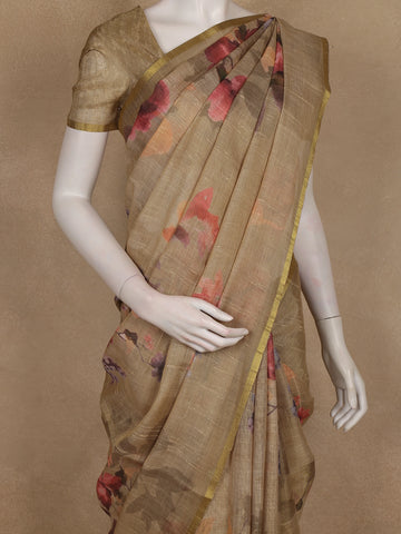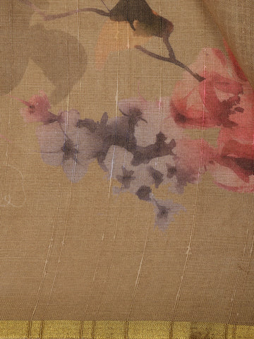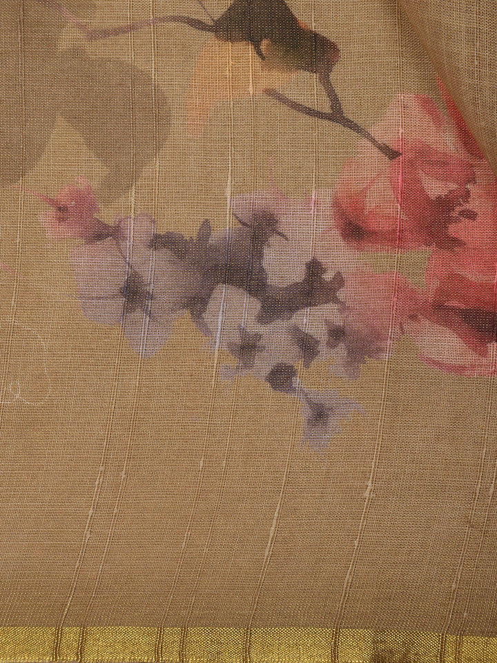 Light Brown Floral Printed Cotton Saree with Subtle Golden Zari Border