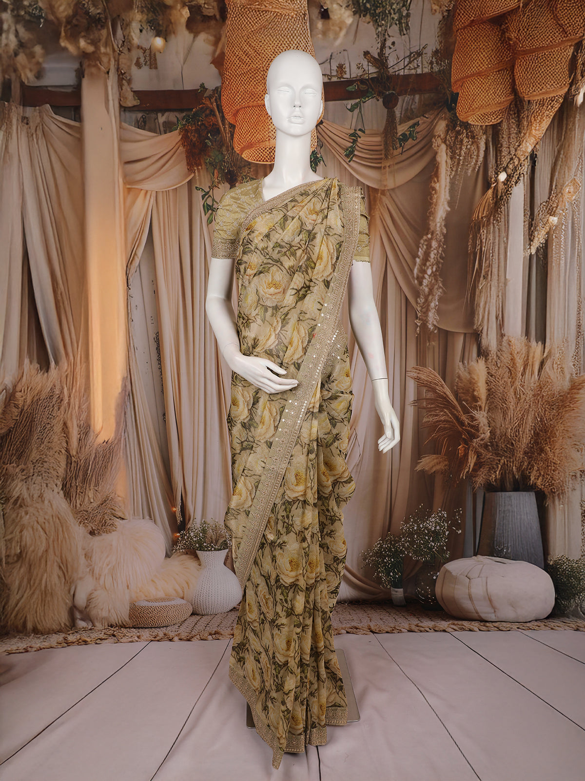 Perfect for day events, evening gatherings, celebrations, and intimate functions, this saree blends subtle glamour with timeless floral beauty. Pair it with minimal jewelry for a soft, elegant look or accessorize with statement pieces to elevate your celebration style.