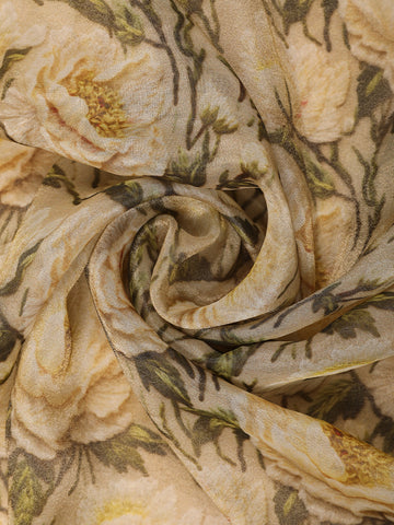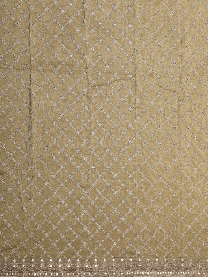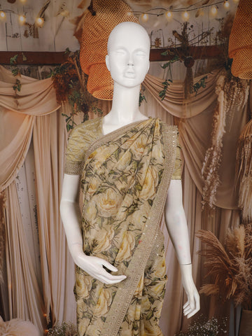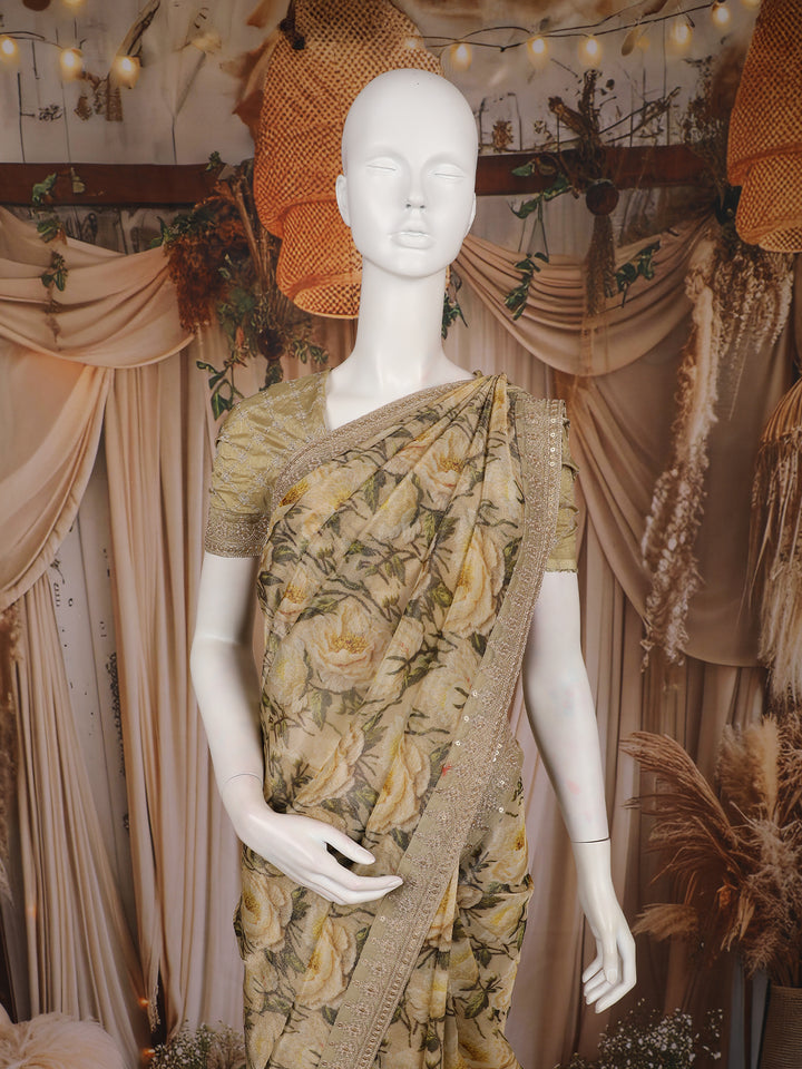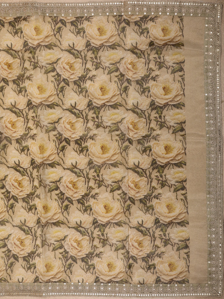 Light Brown Floral Printed Tissue Organza Saree with Sequins Embroidered Border