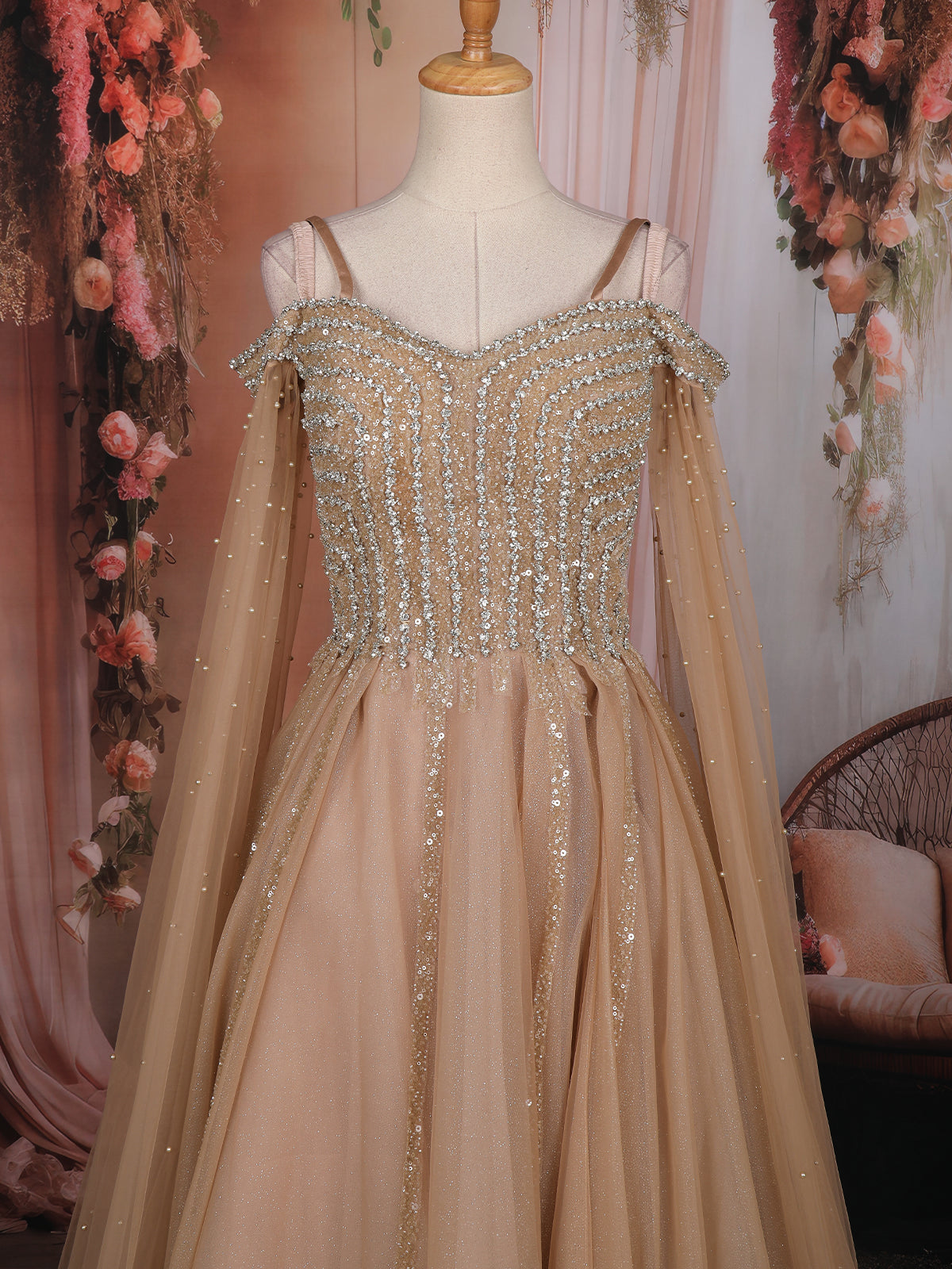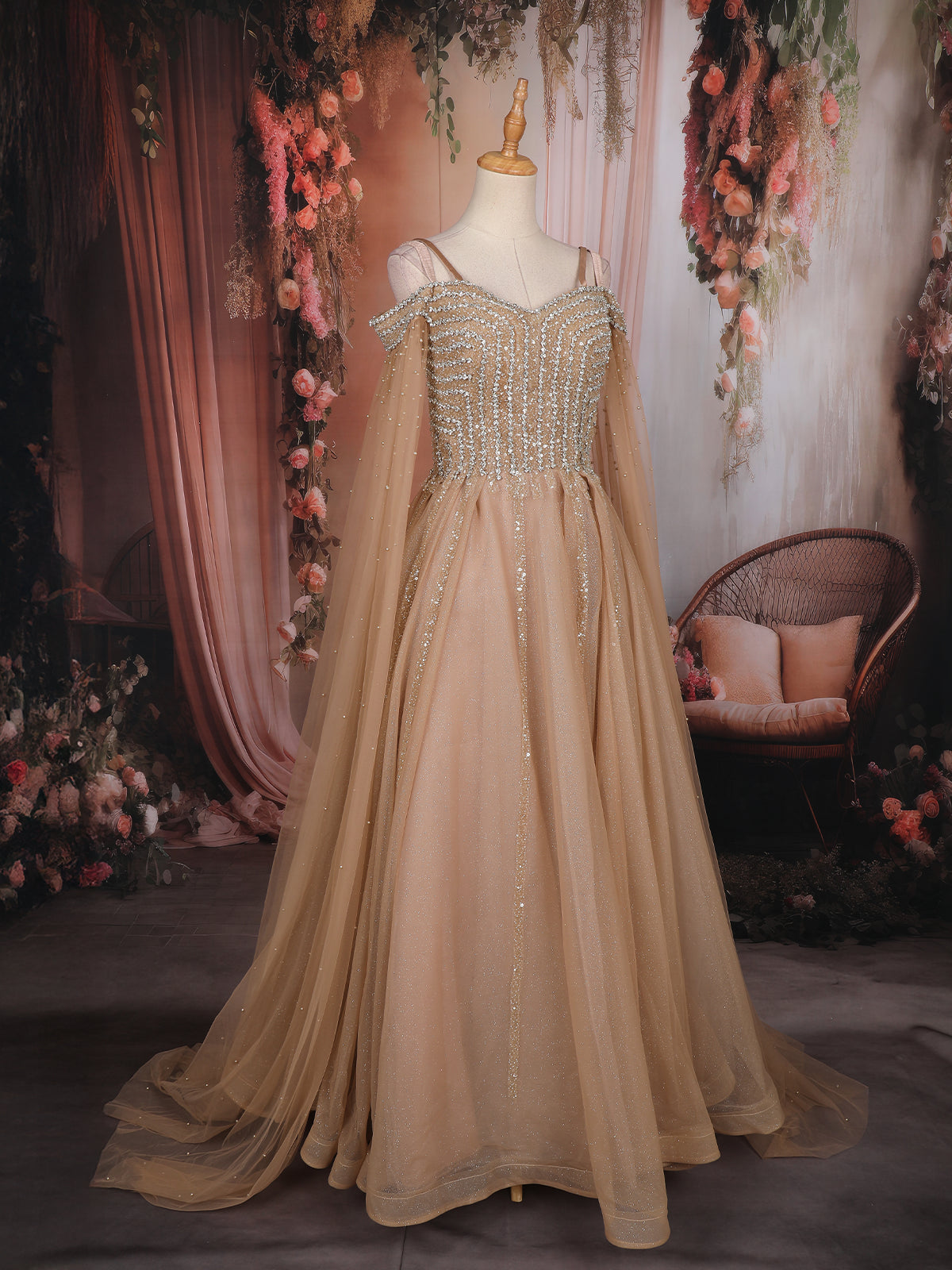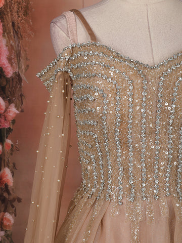 Light Brown Sequins Embellished Net Partywear Gown with Cape Sleeves