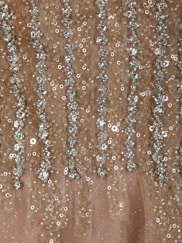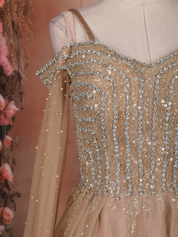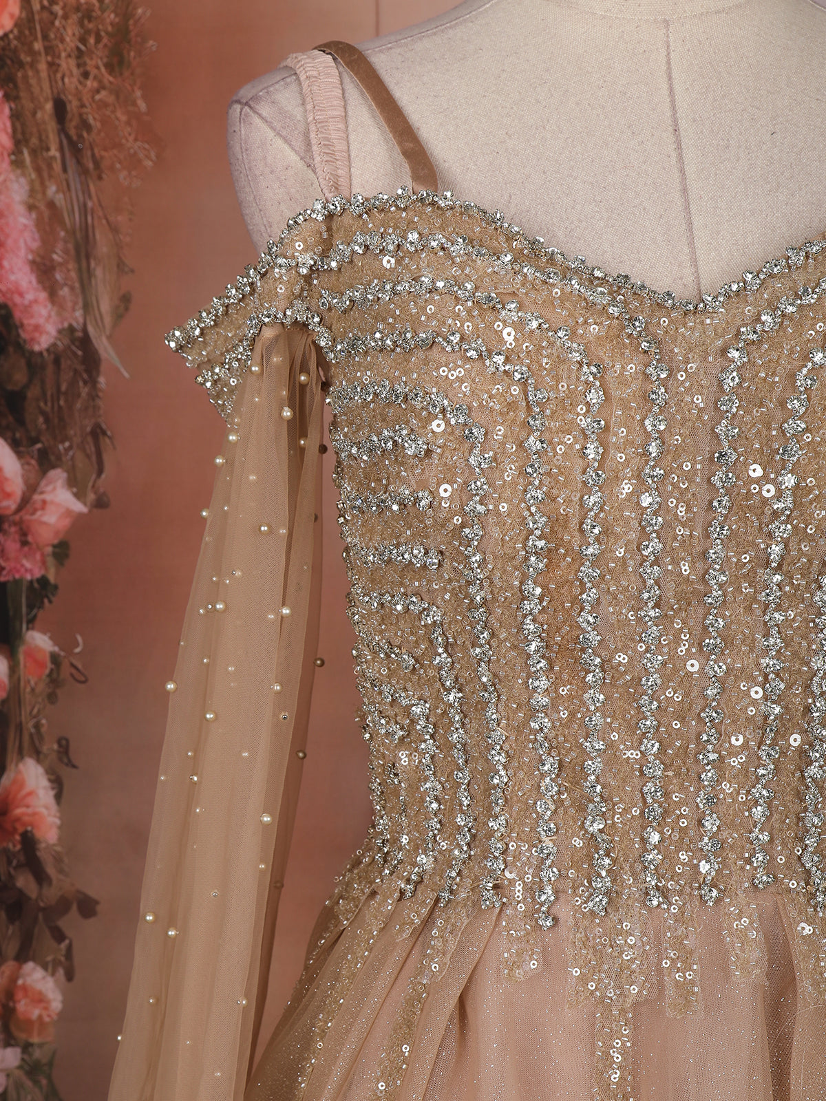 Step into the spotlight with this glamorous Light Brown Partywear Gown, crafted to add a touch of royal elegance to your special occasions. The gown features a beautifully embellished bodice with shimmering sequins arranged in graceful patterns that enhance the shape and sparkle with every movement.