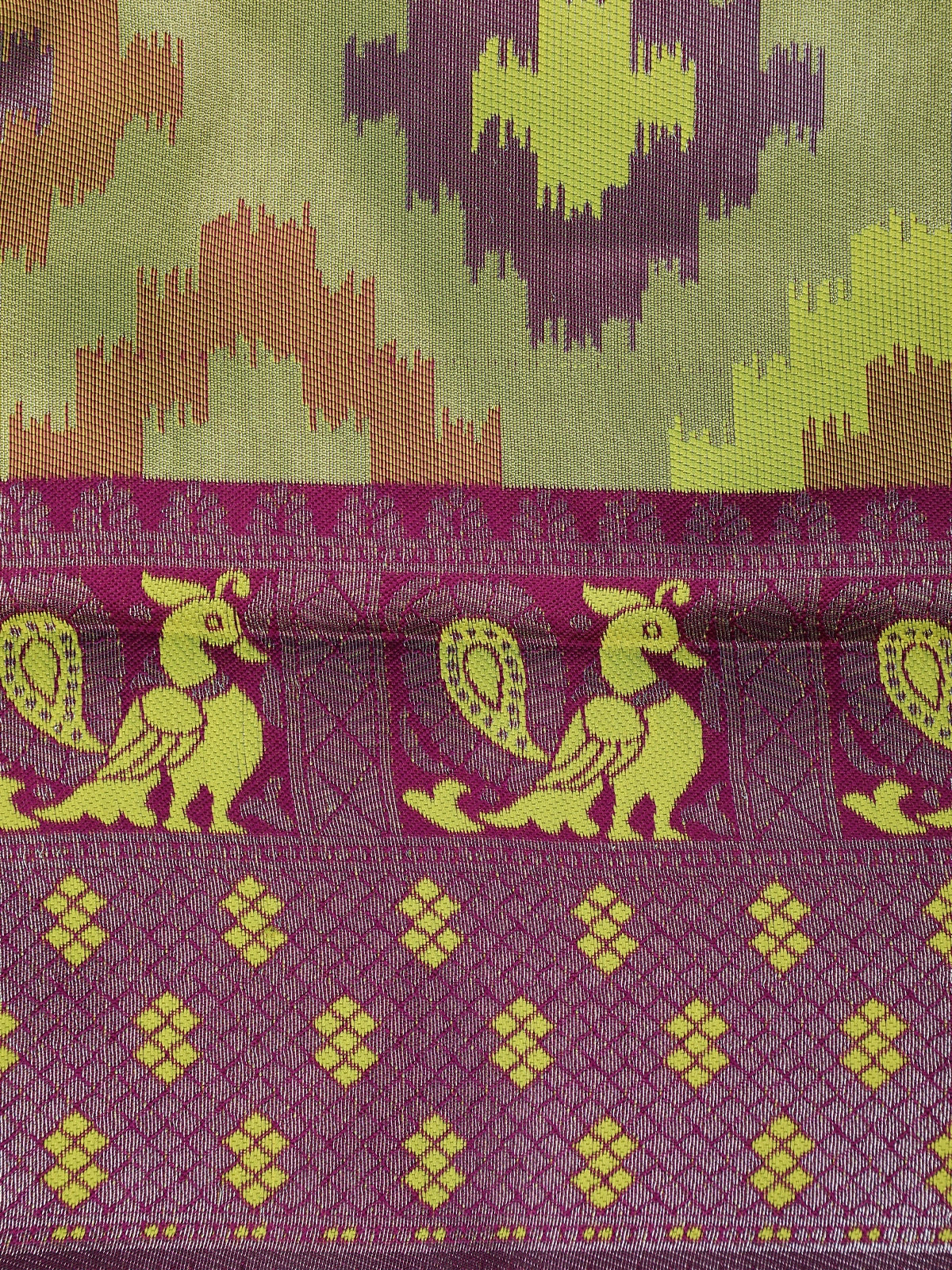 Light Green And Magenta Ikat Design Art Silk Saree with Contrast Maroon Embroidered Blouse