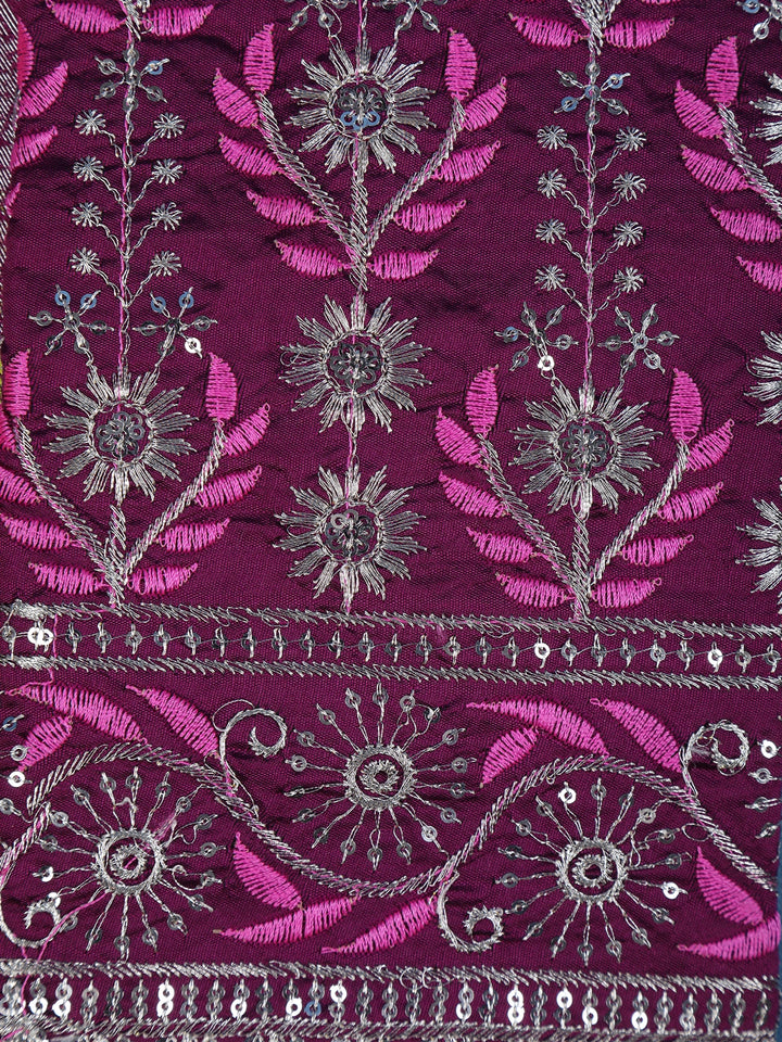 This saree is paired with a contrast maroon embroidered blouse, highlighted by silver and pink floral embroidery with delicate sequin accents — bringing sparkle and sophistication to the ensemble. Ideal for weddings, festive gatherings, and traditional celebrations, this saree is a statement of grace and grandeur.