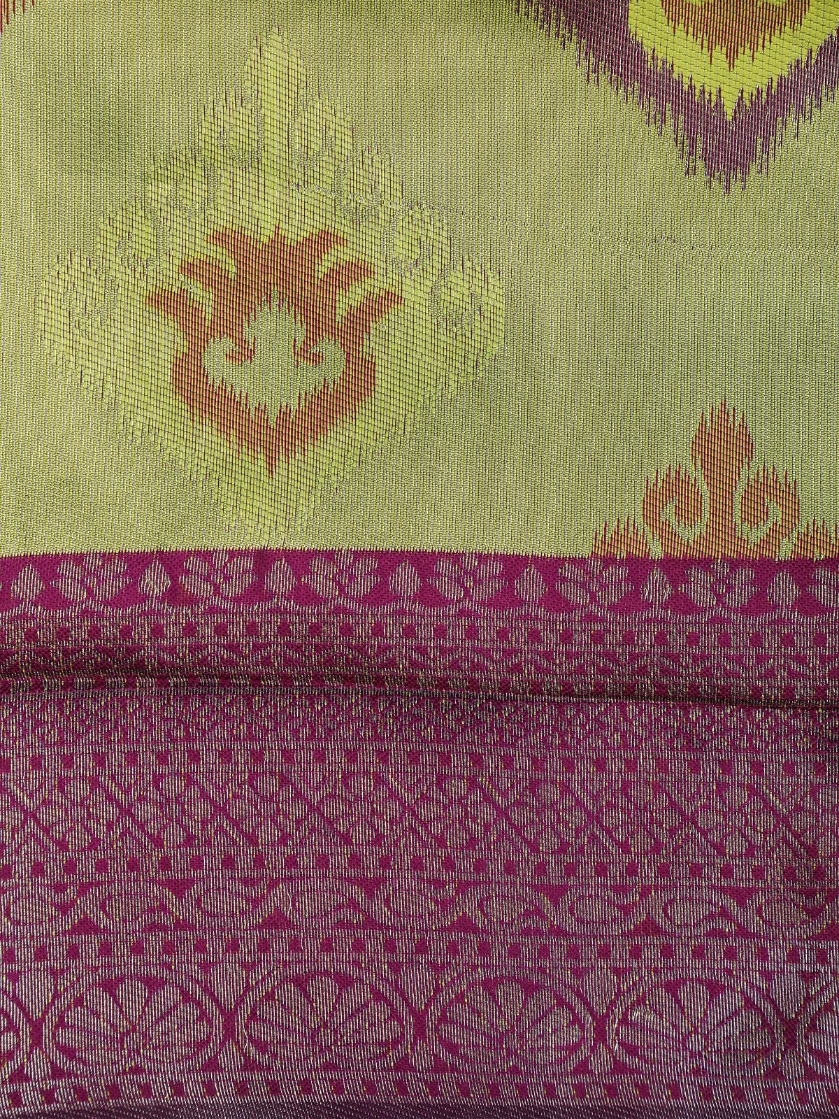 This Light Green and Magenta Art Silk Saree captures the beauty of traditional weaving with a fresh, modern twist. The saree features exquisite Ikat-inspired motifs in pink on a soothing green base, finished with a lustrous magenta zari border that adds a royal touch. The intricate woven design brings out the richness of Art Silk, making it ideal for festive and celebratory occasions.