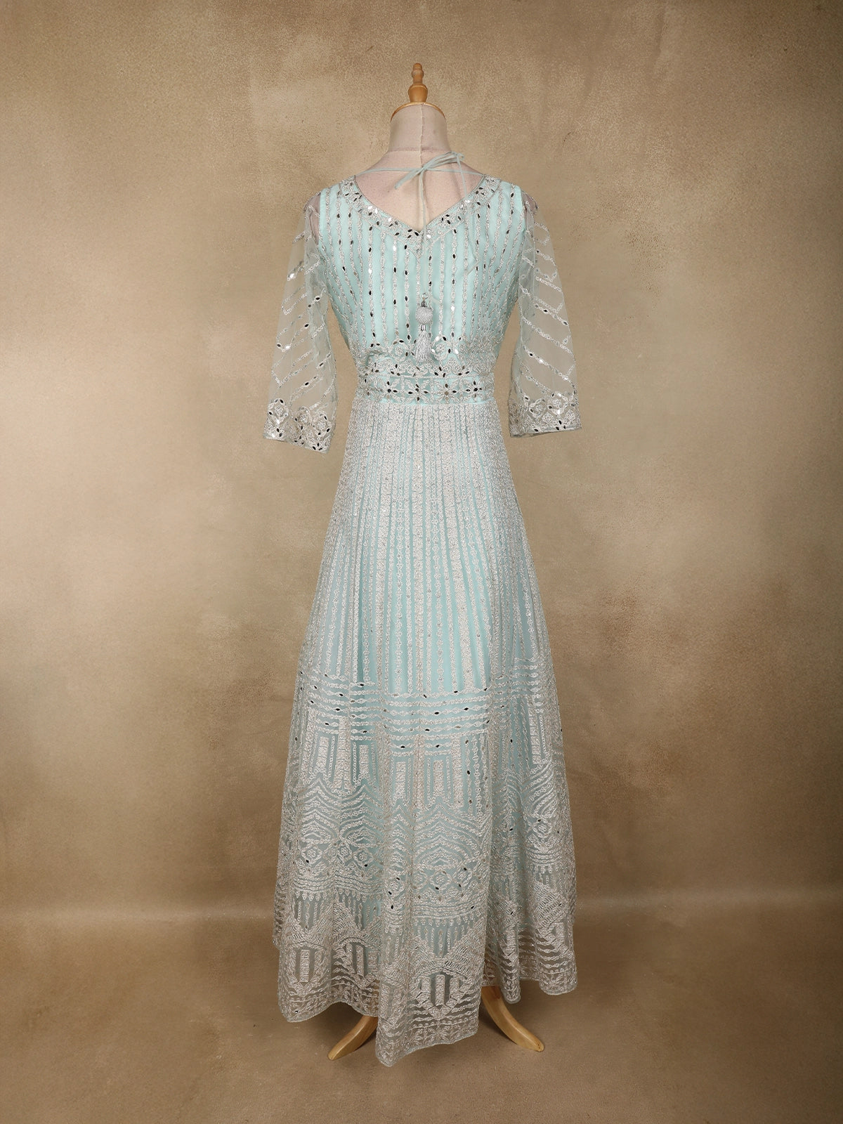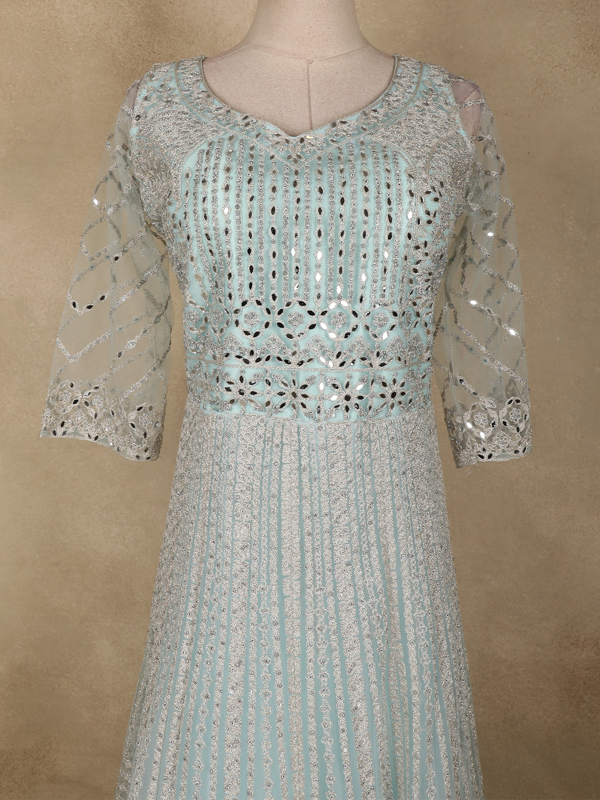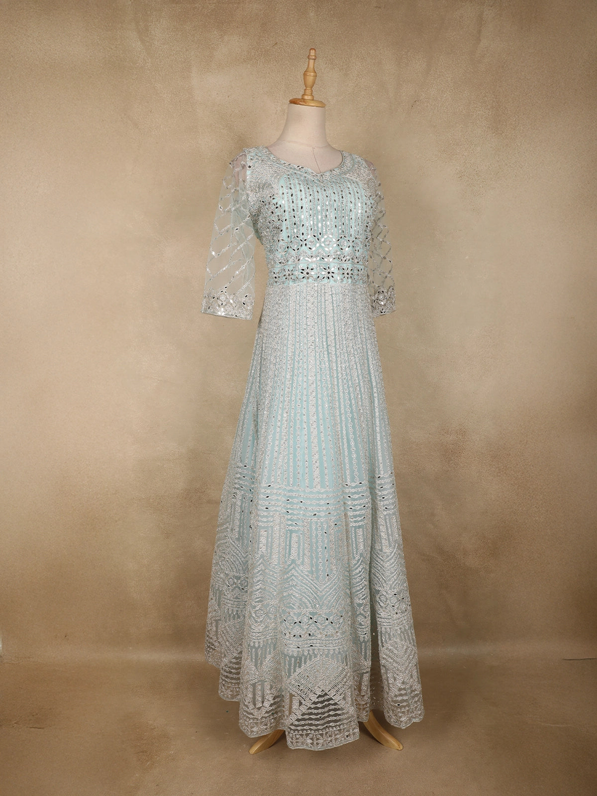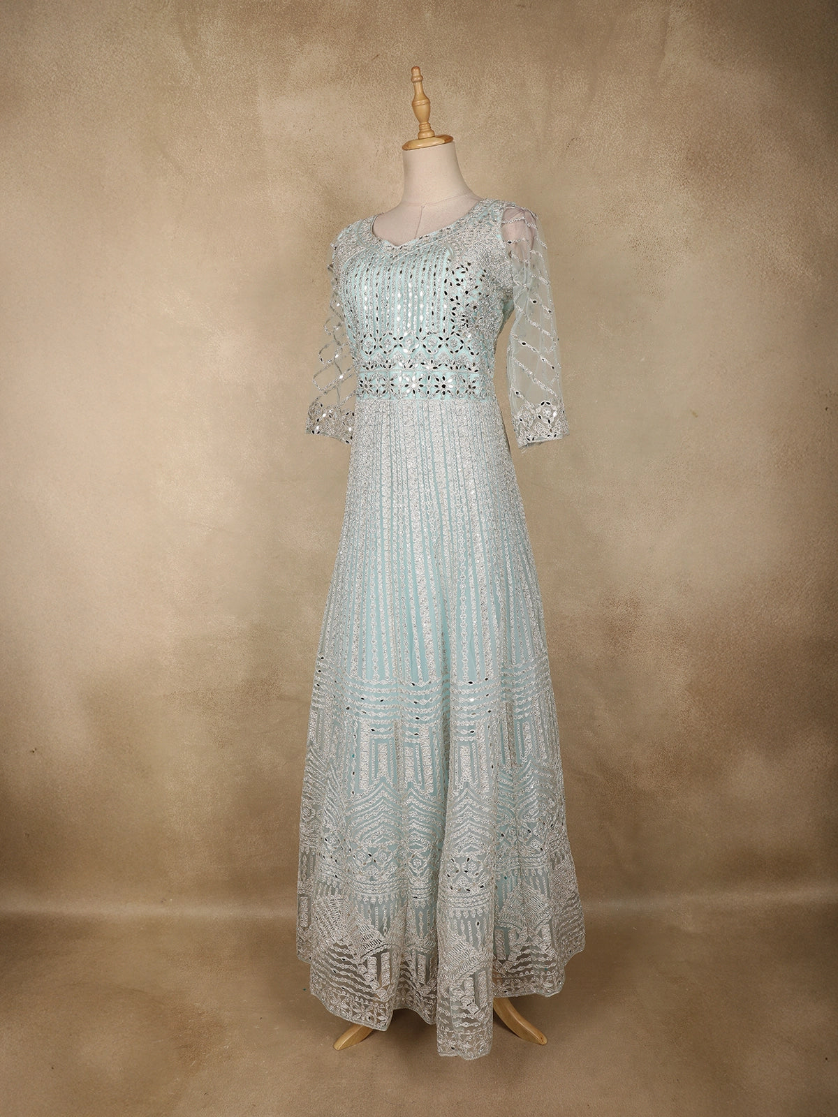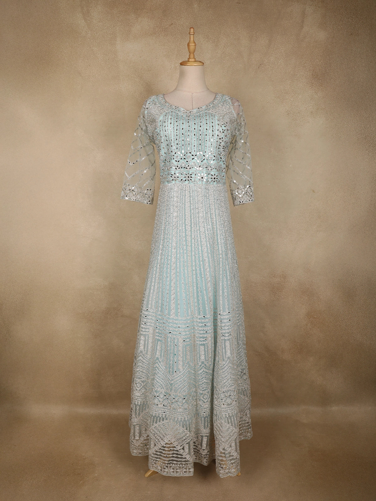 Crafted from airy net fabric with a comfortable inner lining, this gown features a flattering flared silhouette that flows gracefully with every movement. The embroidered sleeves and structured waistline add definition and sophistication, while the detailed hemline lends a touch of timeless artistry. Its lightweight drape ensures comfort, making it ideal for long events and celebrations.