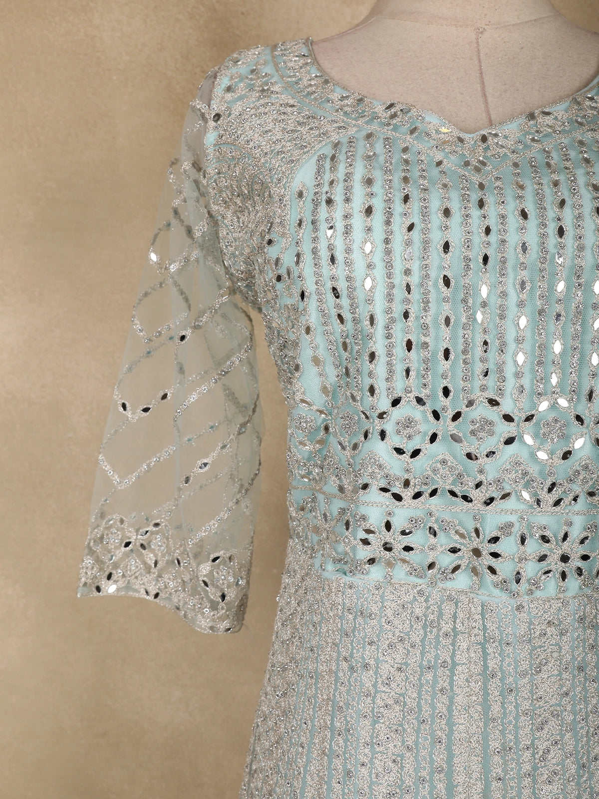 Perfect for bridesmaid wear, receptions, engagement ceremonies, and elegant evening functions, this light green gown beautifully blends modern elegance with classic craftsmanship. A stunning choice for those who love soft hues, intricate embellishments, and effortlessly graceful ethnic fashion.