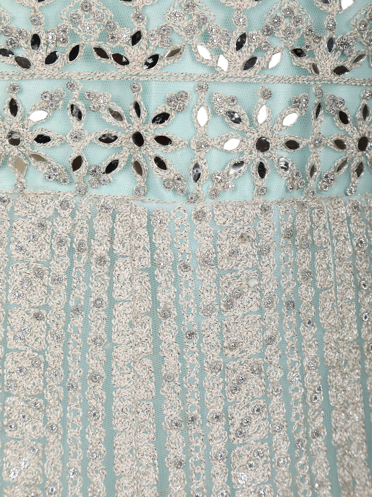 Step into effortless elegance with this enchanting light green net bridesmaid gown, designed to bring a soft, graceful charm to special celebrations. The gown is beautifully embellished with intricate bead and sequin embroidery, arranged in delicate patterns that add a subtle sparkle while enhancing the soothing pastel tone. The fine detailing across the bodice creates a refined, luxurious look without being overpowering.