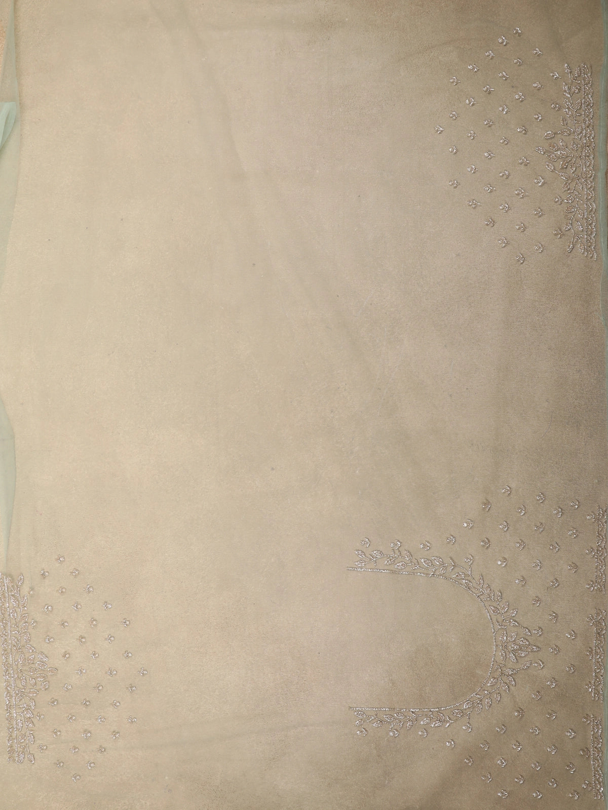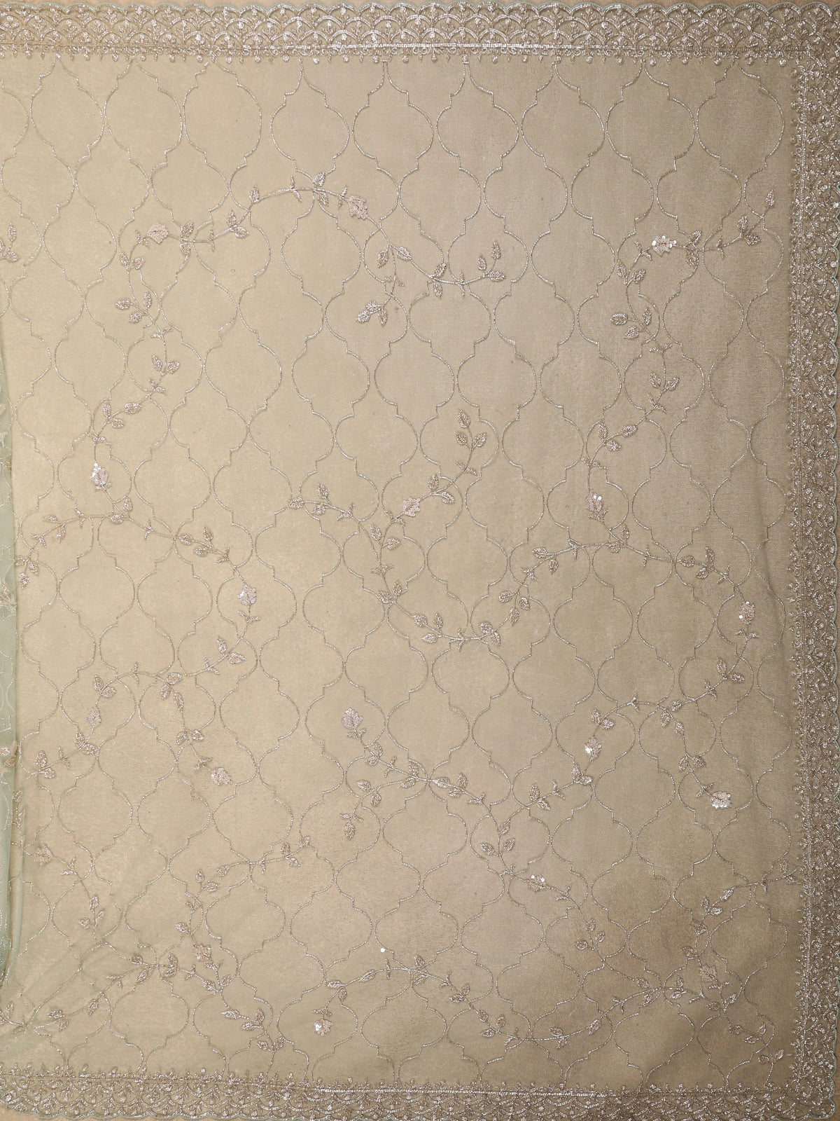 Crafted in soft, sheer net fabric, the saree is beautifully enhanced with intricate floral embroidery, highlighted using shimmering sequins, fine beads, and subtle thread work. The all-over diamond lattice pattern adds depth and texture, while the floral embellishments are thoughtfully placed to create a graceful flow along the drape.