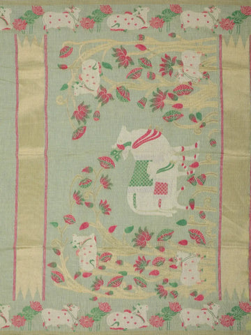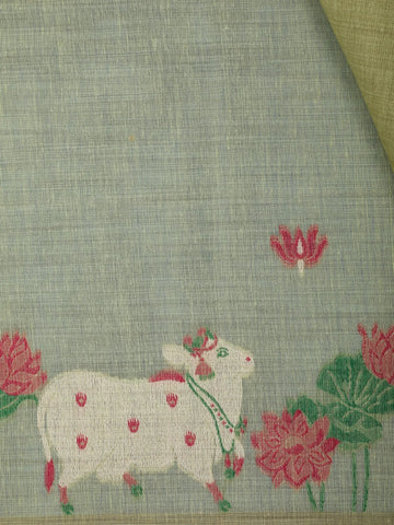 The saree is detailed with delicate embroidery featuring floral vines and cow motifs, symbolizing prosperity and grace, making it a standout choice for women who cherish cultural artistry. A simple solid border frames the design, balancing elegance with everyday wearability.