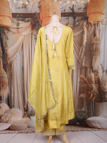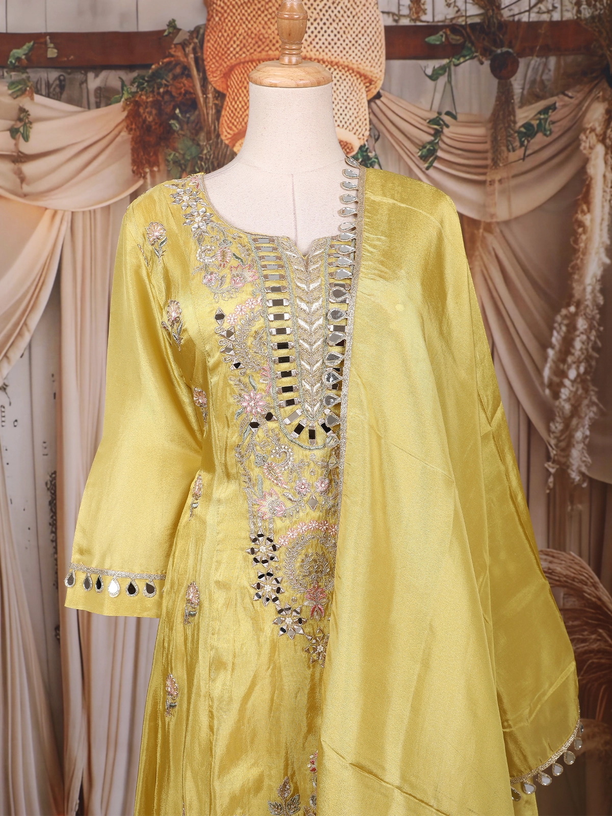 Light Green Mirror and Thread Embroidered Design Tissue Silk Palazzo Suit with Dupatta