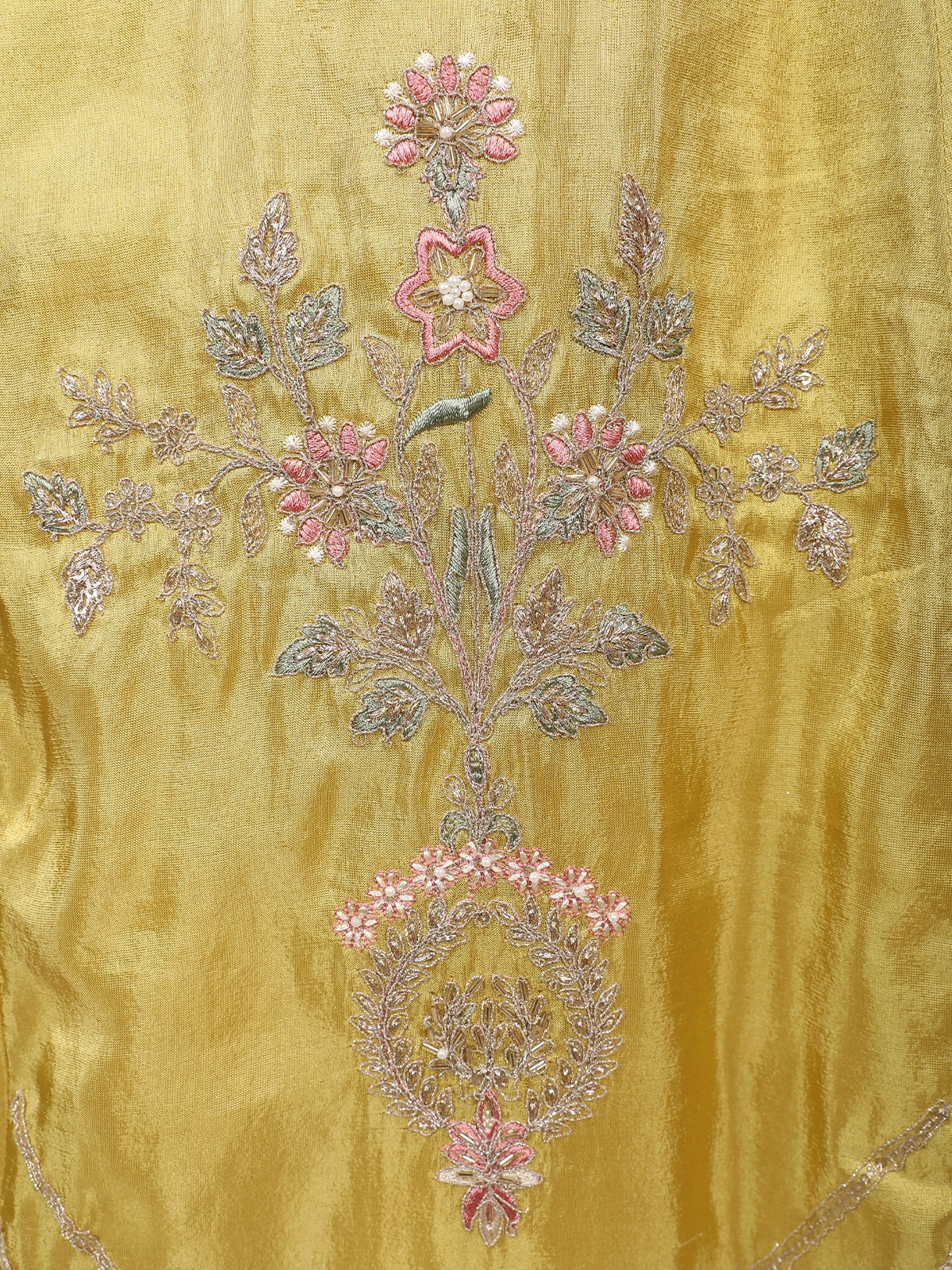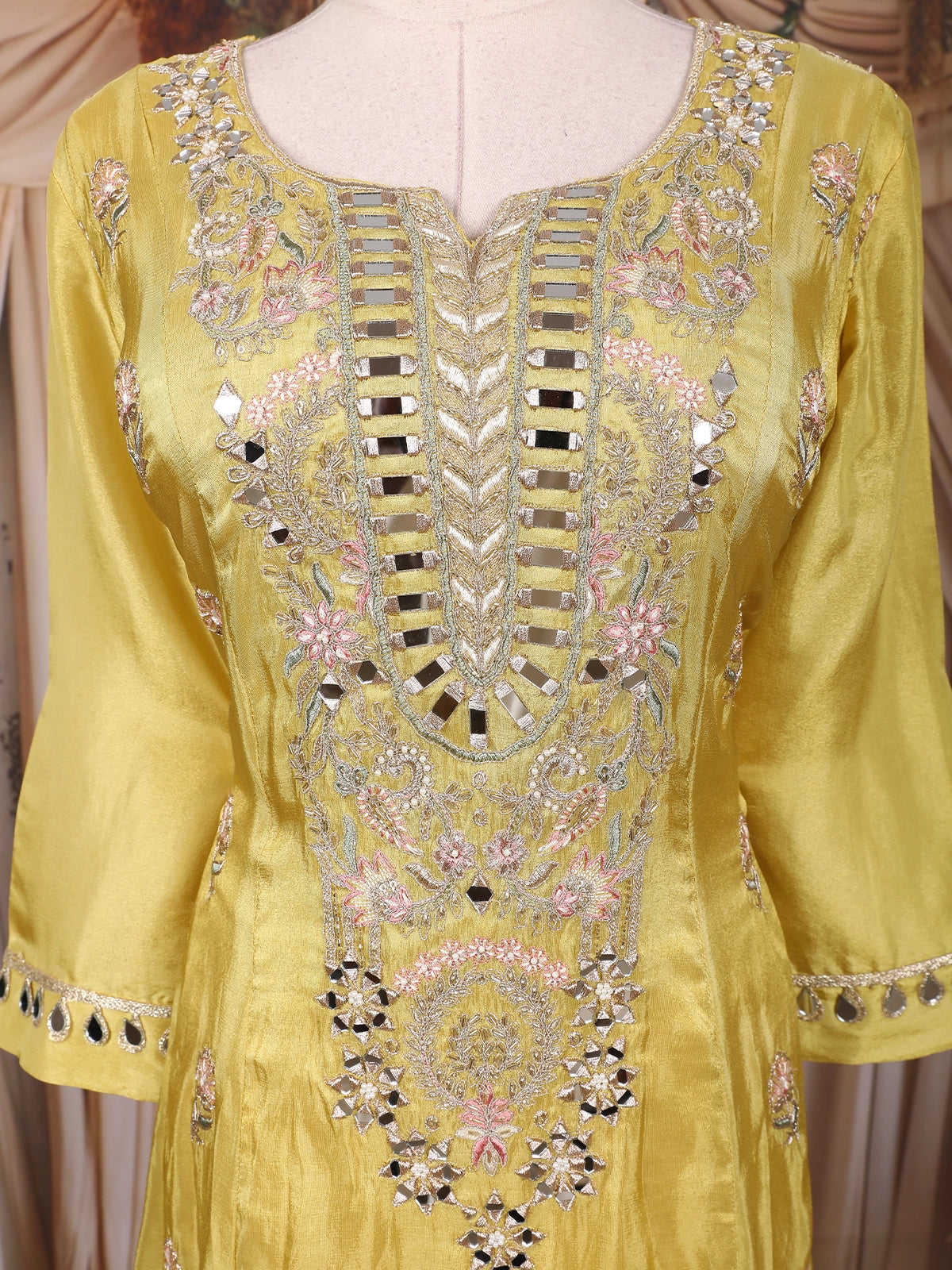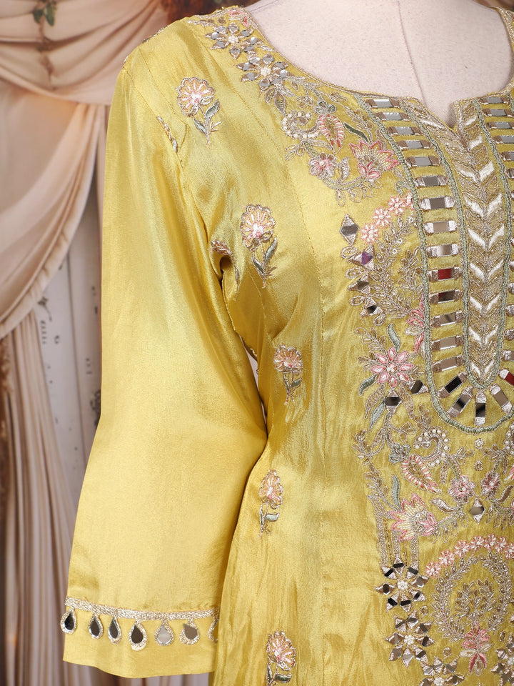 Dazzle in festive radiance with this Light Green Mirror and Thread Embroidered Tissue Silk Palazzo Suit, an exquisite ensemble that embodies elegance, shimmer, and sophistication. The outfit is crafted from luxurious tissue silk, known for its natural sheen and graceful drape, making it perfect for special occasions and festive gatherings.