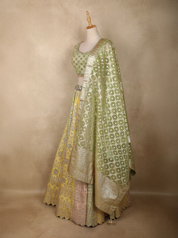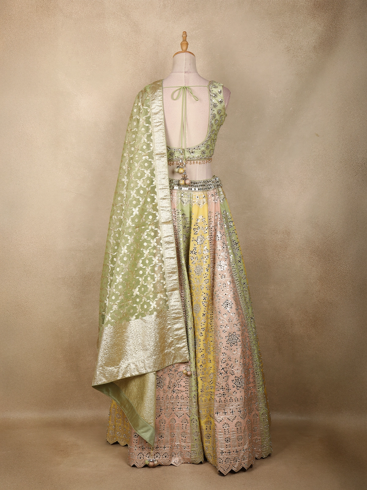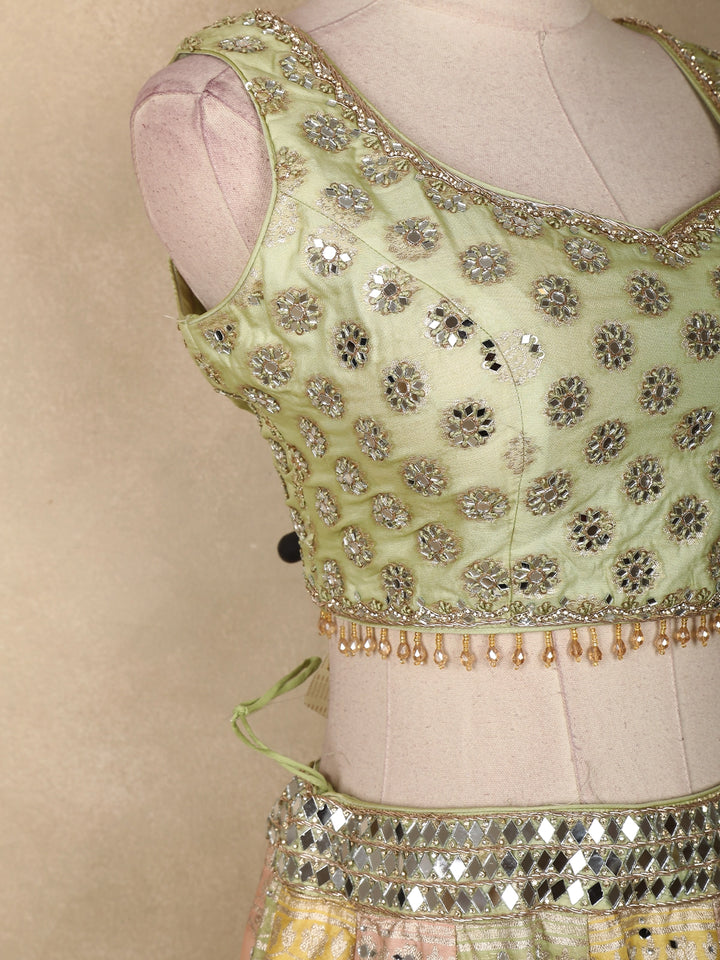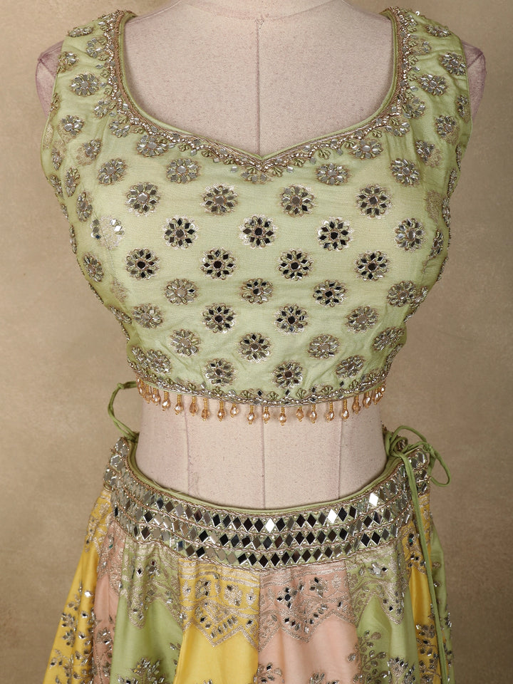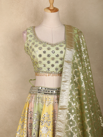 Light Green Floral Mirror Work Banarasi Silk Lehenga Set