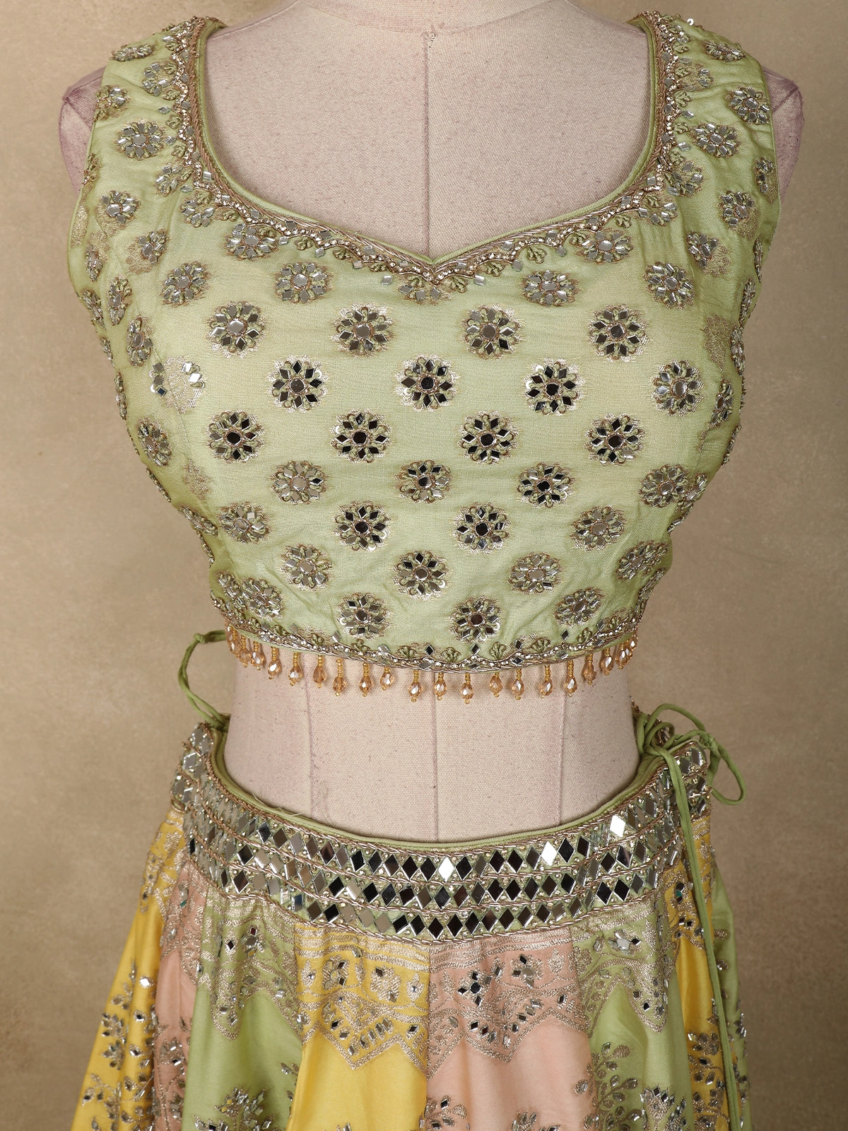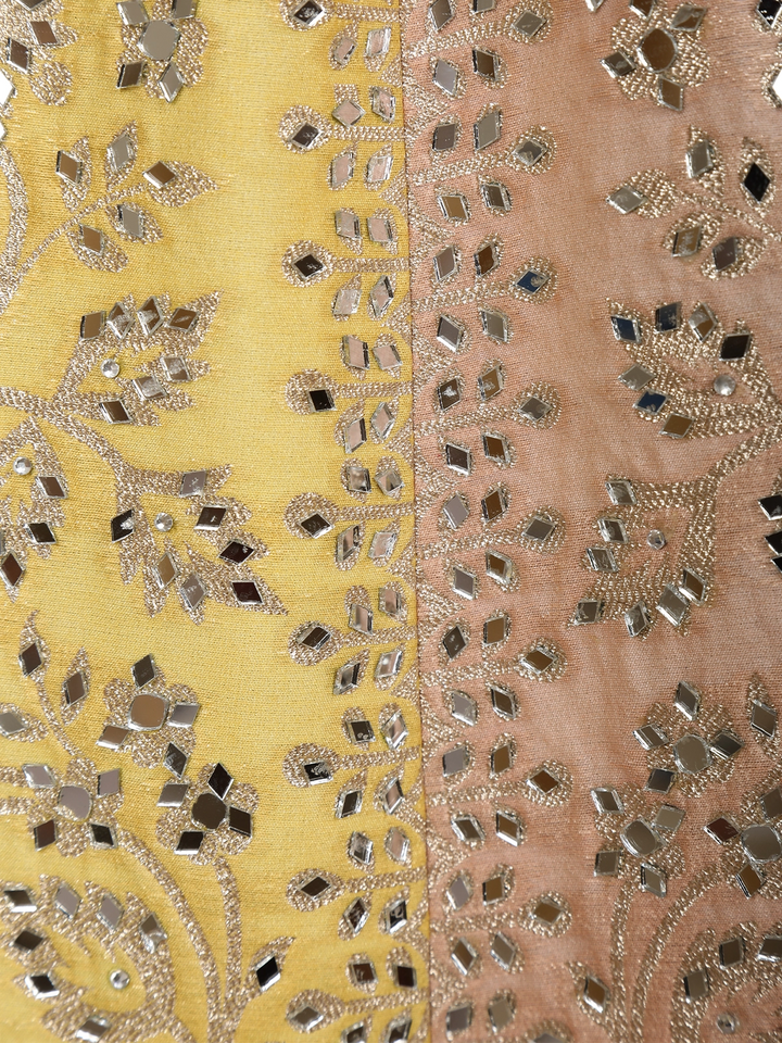 The multi-panel Banarasi silk lehenga showcases exquisite craftsmanship with shimmering zari highlights and mirror embellishments, giving a glamorous yet traditional touch. Designed with a flared silhouette and a statement embroidered waistband, it offers a flattering and graceful drape with every movement.