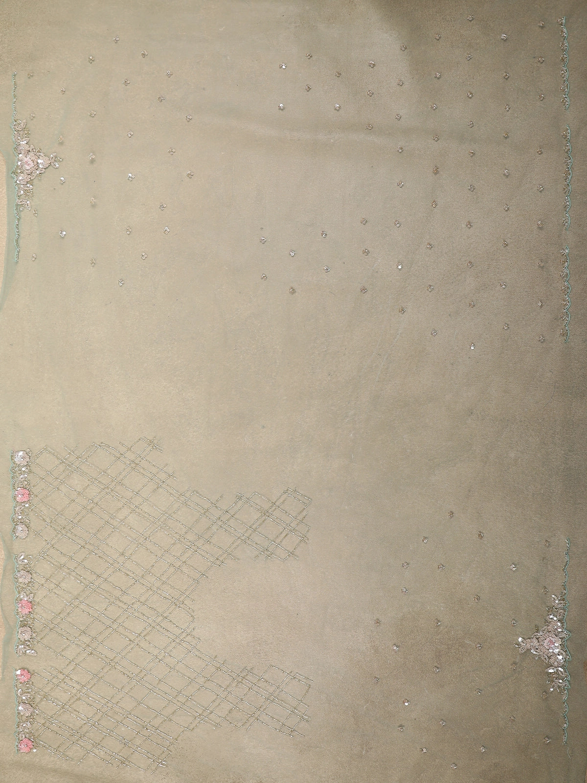 Crafted in soft, sheer net fabric, the saree is beautifully enhanced with intricate floral embroidery, highlighted using shimmering sequins, fine beads, and subtle thread work. The all-over diamond lattice pattern adds depth and texture, while the floral embellishments are thoughtfully placed to create a graceful flow along the drape.
