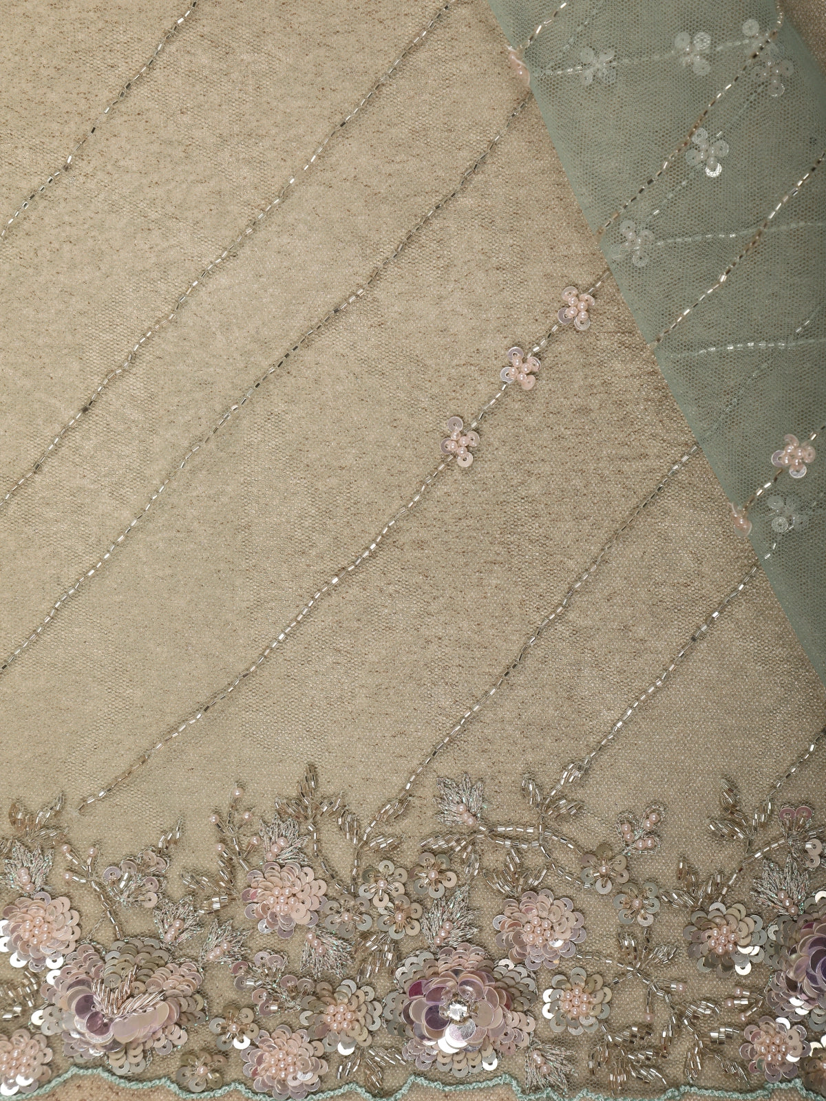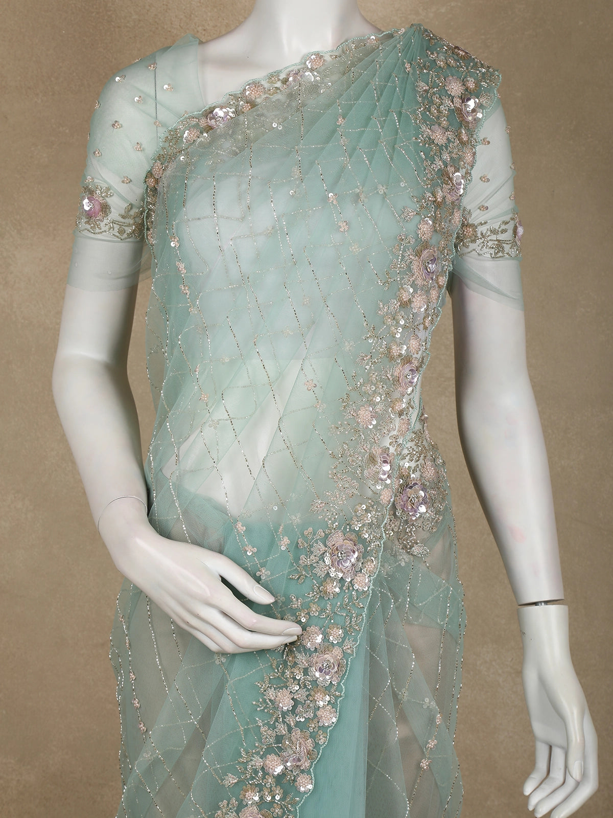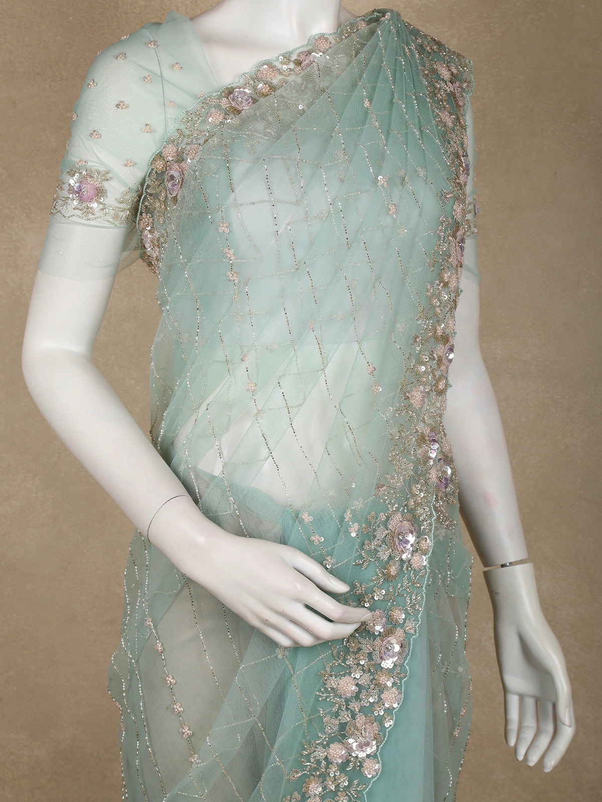 Light Green Floral Sequins and Beads Embroidered Designed Net Designer Saree