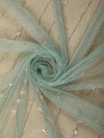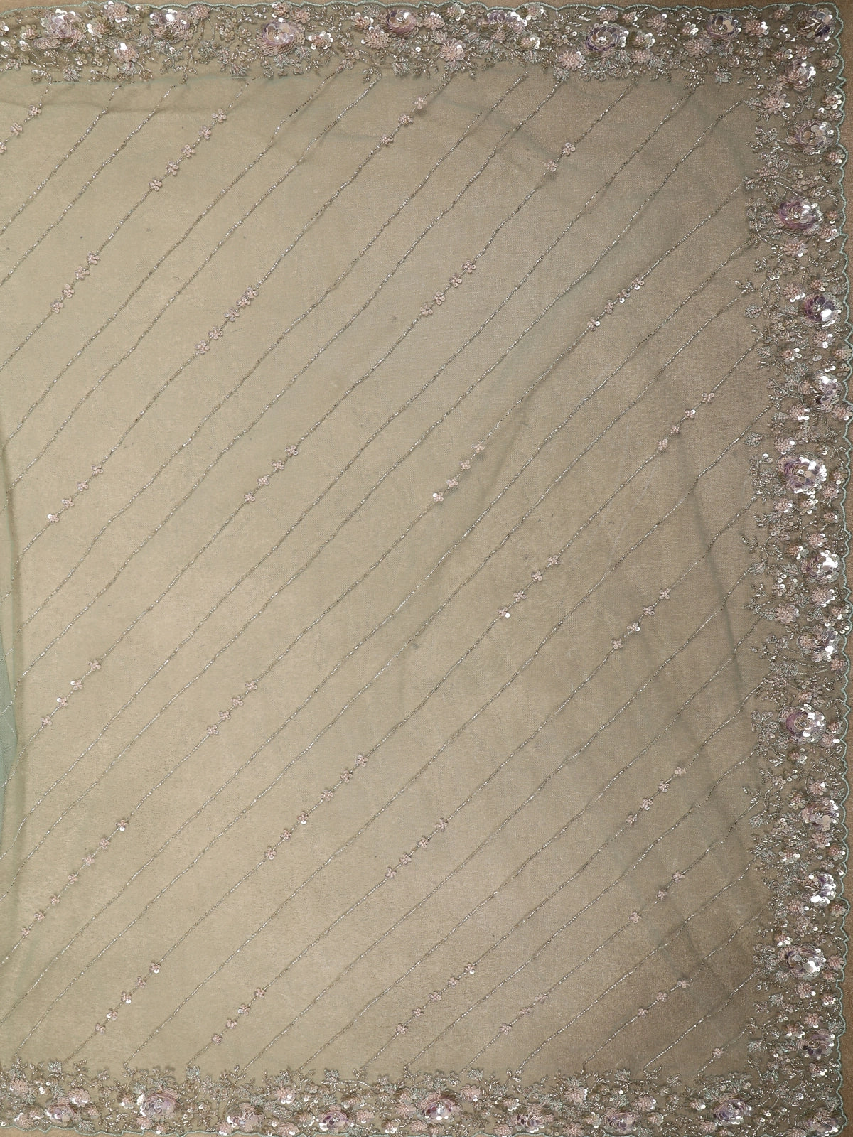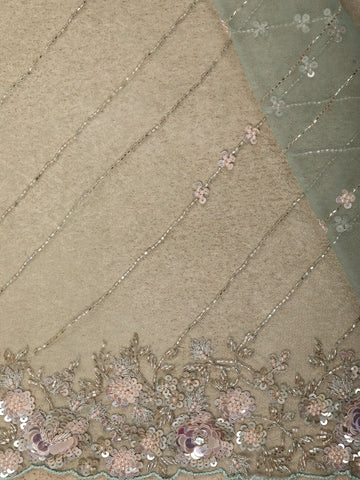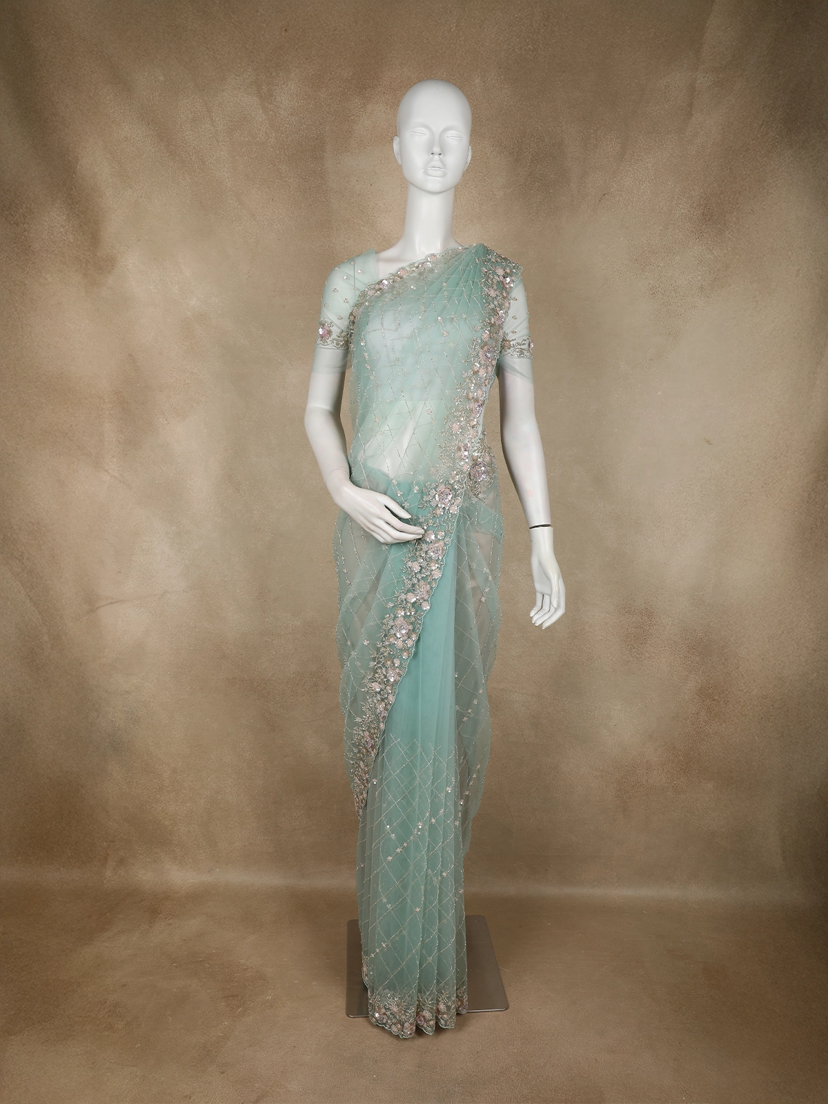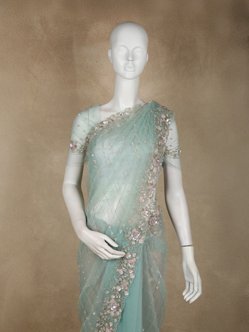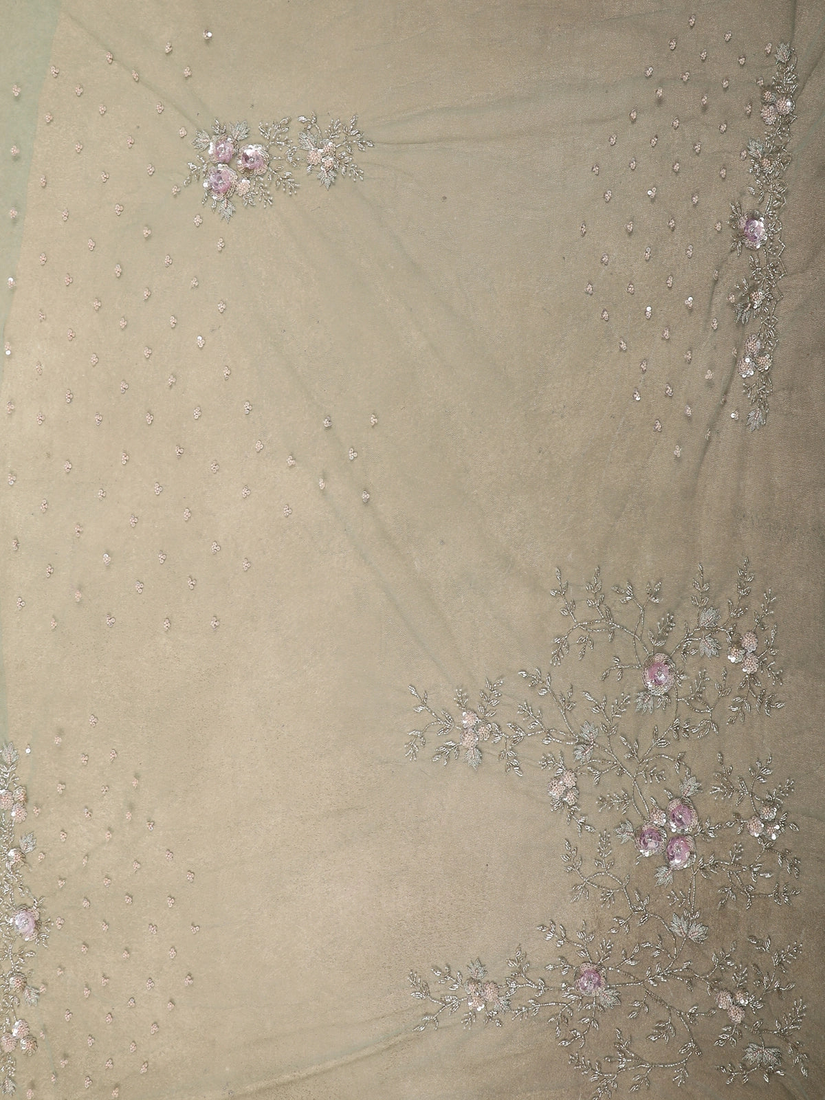 Light Green Floral Sequins and Beads Embroidered Designed Net Designer Saree