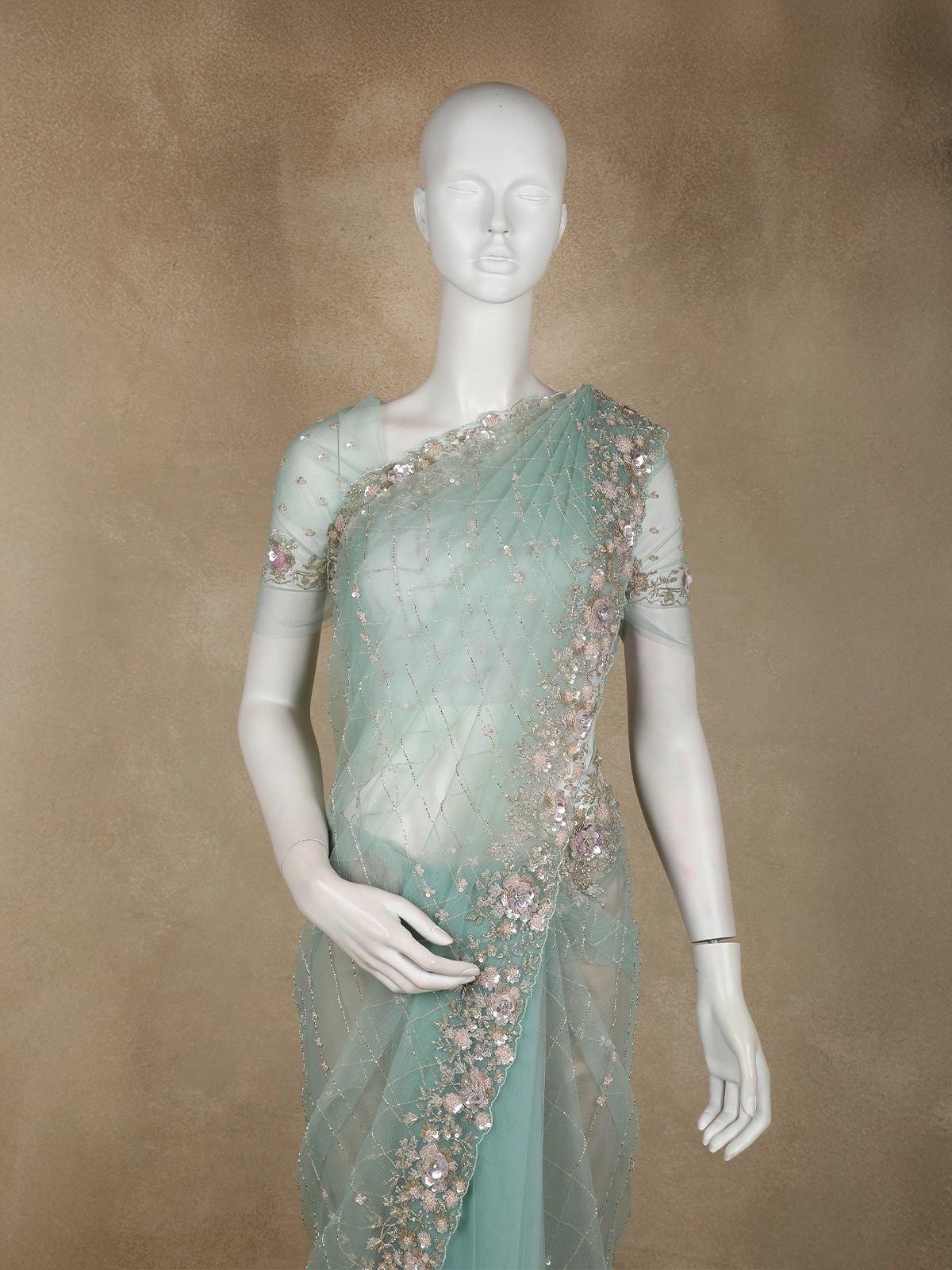 Crafted in soft, sheer net fabric, the saree is beautifully enhanced with intricate floral embroidery, highlighted using shimmering sequins, fine beads, and subtle thread work. The all-over diamond lattice pattern adds depth and texture, while the floral embellishments are thoughtfully placed to create a graceful flow along the drape.
